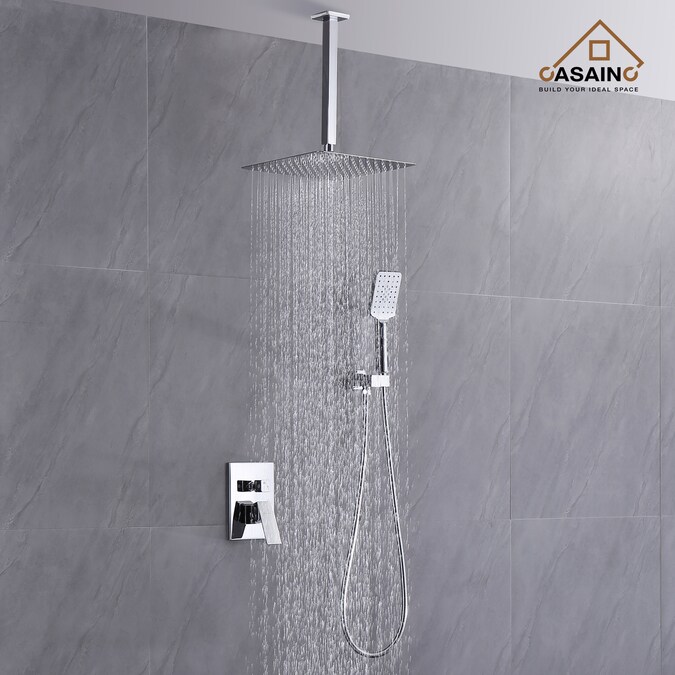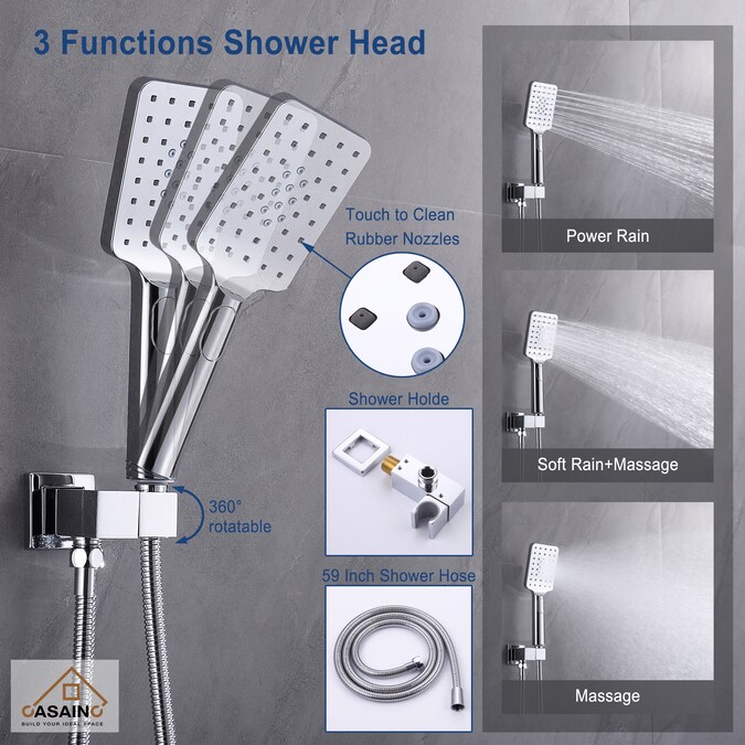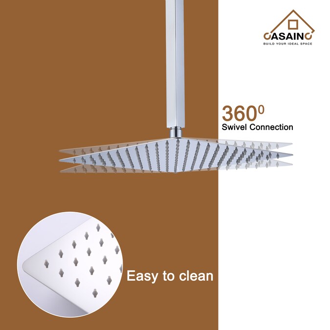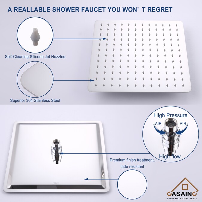 - 12-inch Square Rainfall Showerhead: Air-in technology for higher water pressure, even at low levels; Medical-grade TPE nozzles for self-cleaning; Swivel brass ball allows water direction adjustment