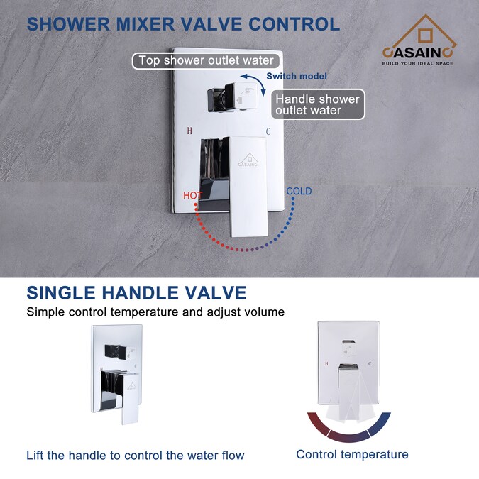 - Special Design of Solid Brass Shower Mixer Valve (Pre-embedded): Shower knob switches between bathing modes; Single handle for easy control of water flow and temperature; Turn left for hot water, turn right for cold water