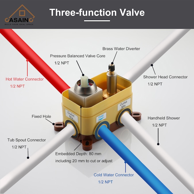 - Special design of solid brass shower mixer valve (Pre-embedded): Shower knob on the valve switches the bathing modes; Single handle for easy control of water flow and temperature; Turn to left for hot water and turn to right for the cold water