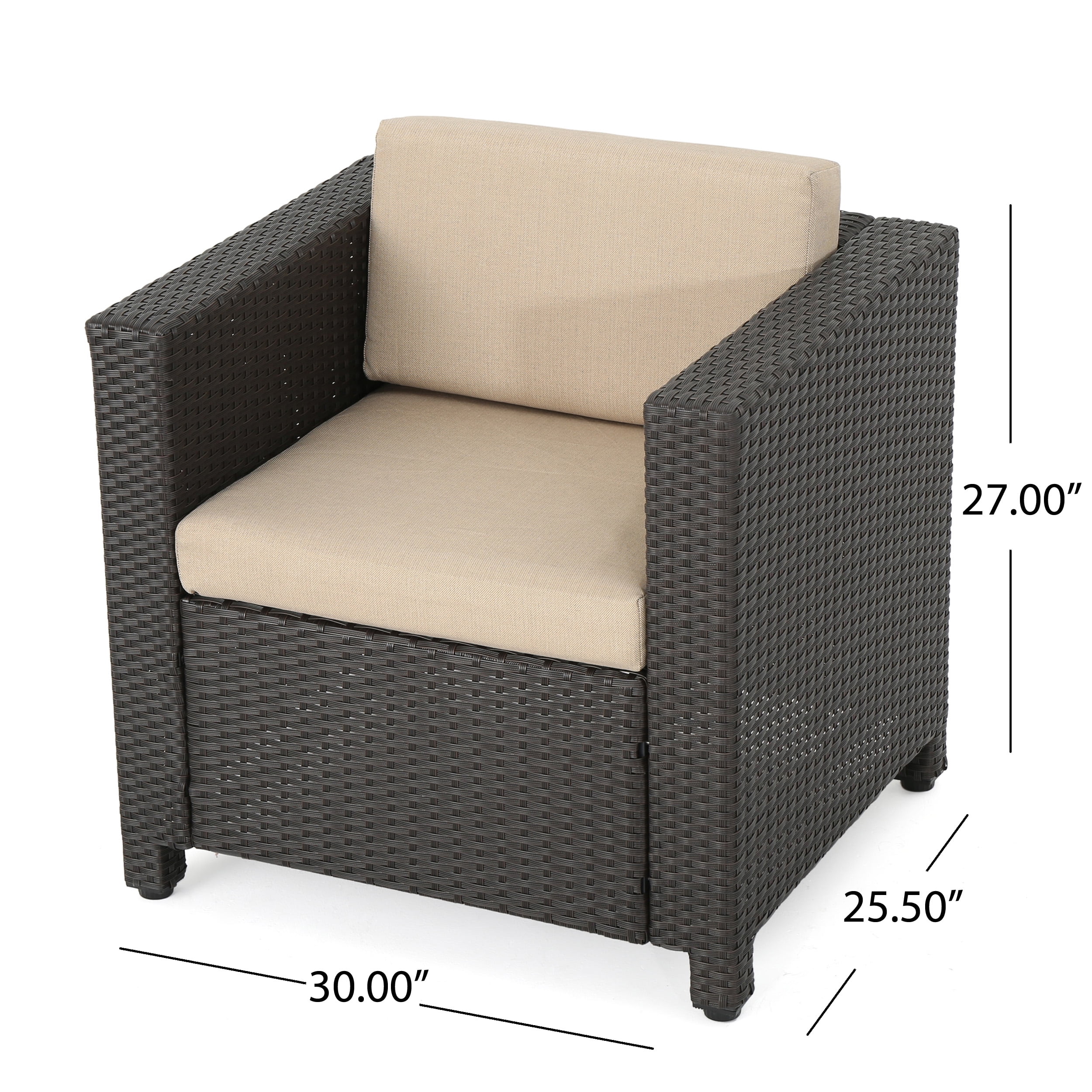Includes: Two (2) Club Chairs Material: Faux Rattan Frame Material: Iron Cushion Material: Water Resistant Fabric Multiple Finish Options Multiple Cushion Color Options Assembly Required All Dimensions Exclude Cushion Measurements Dimensions: 30.00 inches deep x 25.50 inches wide x 27.25 inches high Seat Dimensions: 19.25 inches deep x 21.75 inches wide x 15.25 inches high Seat Cushion Thickness: 4.00 inches Weight Capacity: 400 lbs