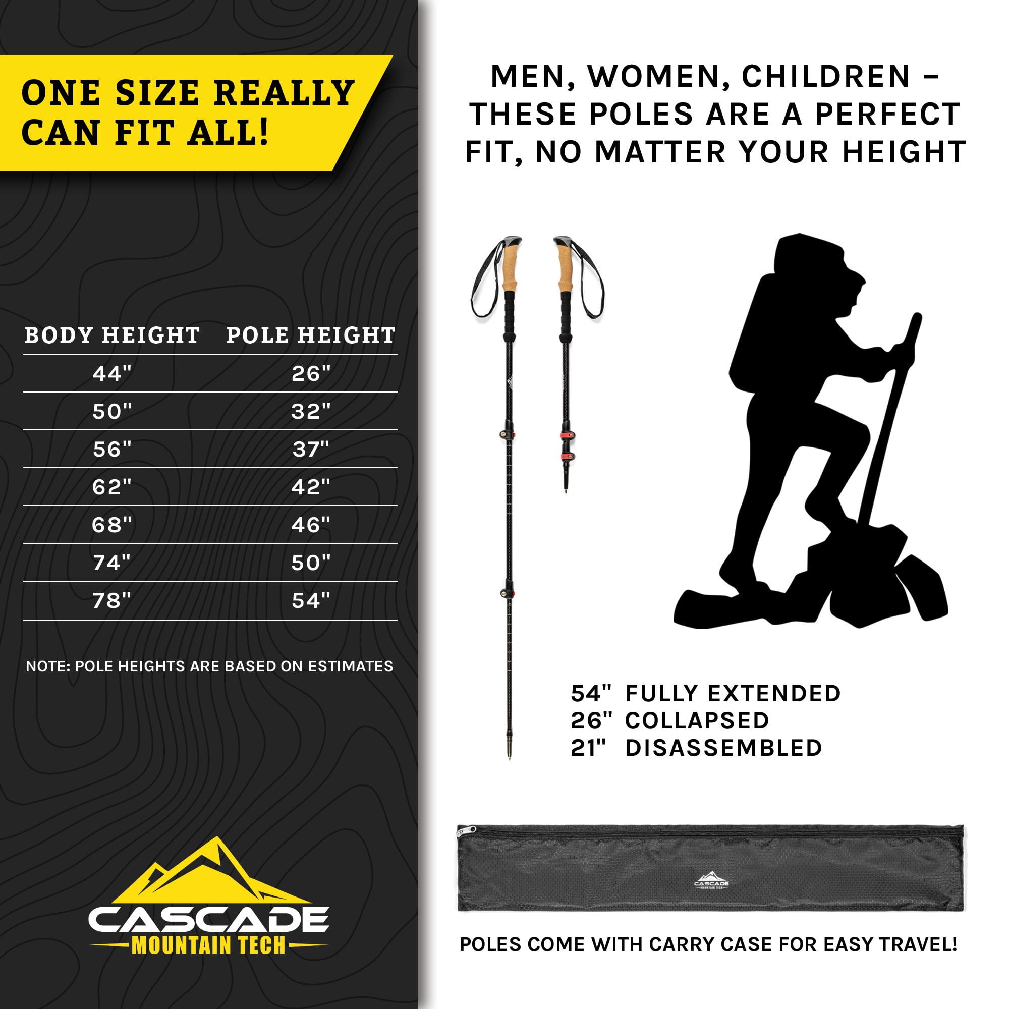 Set of two black trekking poles Shaft Material: 3K Carbon Fiber Grip Material: Comfortable Cork Grip Locking Mechanism: Red quick-Lock mechanism for quick adjustability Extendable from: 26” – 54” Single Pole Weight (without rubber tips): 8 OZ or less than a pound Adjustable for users 3’6″ and taller Disassembled measurements: Upper; 20.75″ Middle; 20″ Lower; 21.25″ Tip Kit Includes: Carry Case, Round Rubber Tips, Boot Tips, Sand/Mud Baskets, and Snow Baskets Tip Material: Tungsten Carbide Ideal for hikers, walkers, backpackers, campers, and more