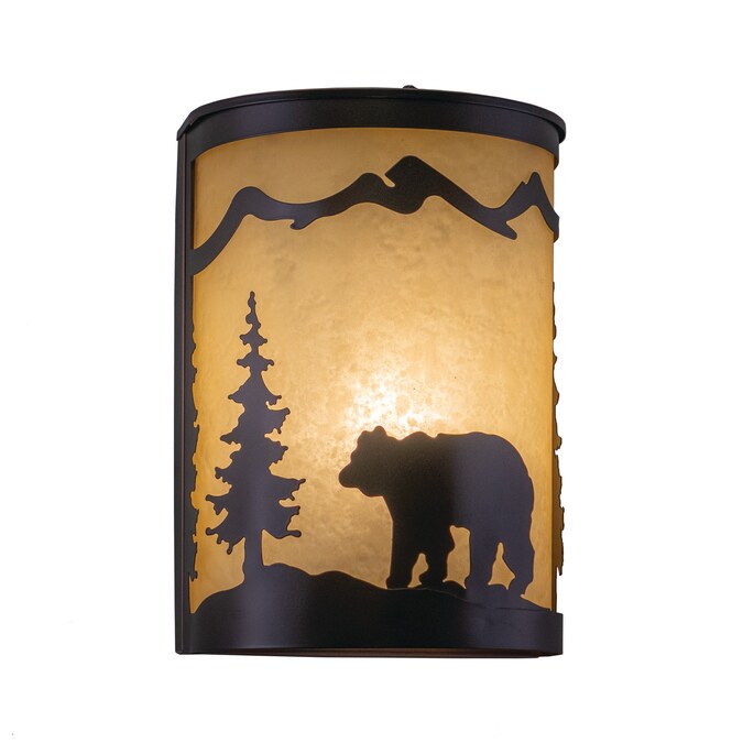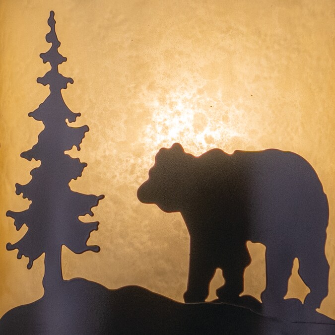 Evoking the spirit of the wilderness, this rustic themed light is clad in a burnished bronze finish and features silhouetted bear imagery atop glowing white tiffany style glass. The classic form of this lamp makes it a great choice for a vacation lodge, cabin or a suburban home – it will complement a variety of home styles: anywhere you want to bring an element of nature. Medium screw base lamping provides maximum light output, and flexibility in bulb choice. This versatile light is outdoor damp rated and can be used indoors as well as outdoors. Mount these lights on your covered porch, hallway, or entryway and experience this stylish look for yourself.