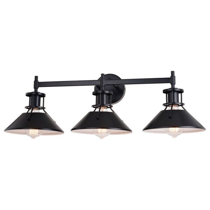 The Canton collection speaks loudly to industrial and farmhouse charm. The black metal shades taper outward to generate the utmost light below. A small cage-like structure allows light to peek out above the shade balancing the show of light. Add this 3-light vanity to any bath, or even a kitchen, for that edgy touch of flair.