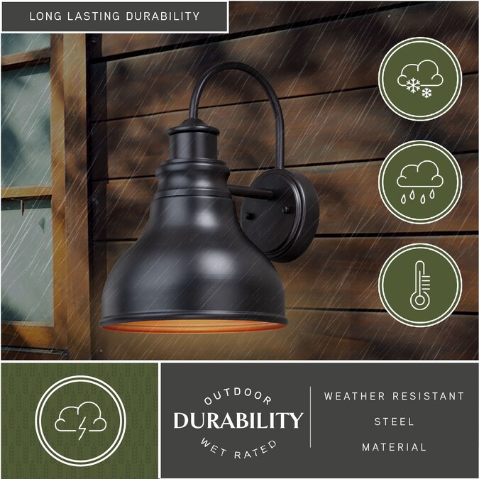 A modern barn light the Delano takes a popular style and adds an updated twist. The Delano is dark-sky compliant and features a gold inner finish, to add extra warmth to the look and feel of this light. Mount these lights on your covered porch, entryway, or garage and experience this stylish look for yourself. It is sure to be a great addition to your home’s exterior décor. It has a built-in dusk to dawn photocell that automatically turns the light on at dusk and turns it off at dawn, saving energy during daylight hours.