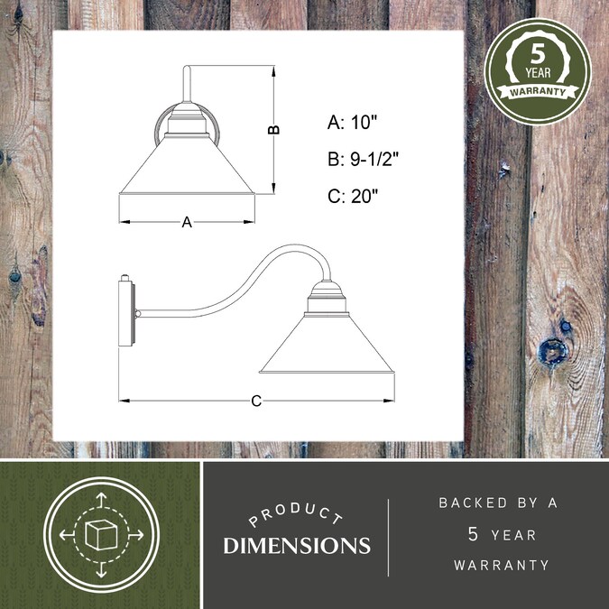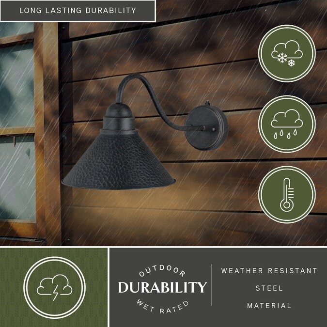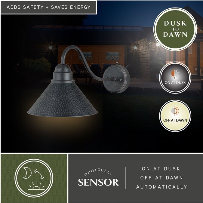 Designed with stately, yet rustic sophistication, the Outland collection is a solid choice for your outdoor space. The finish gives this barn light a warm and inviting elegance, and the finish inside the shade adds to the charm. This fixture is dark-sky compliant and will complement any industrial, cottage, modern country, or farmhouse style home. Dusk to dawn photo cell automatically turns fixture on in the dark and off in the light for added safety and security, saving energy during daylight hours. This outdoor wall light is ideal for your covered porch, entryway, garage, or any other area of your home.
