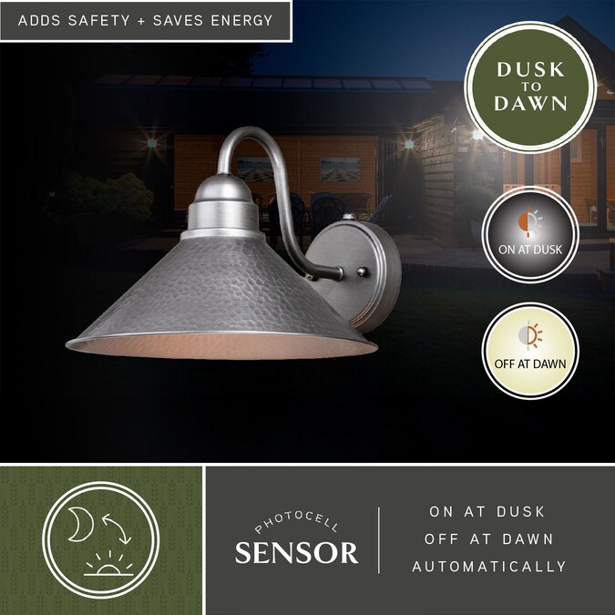 Designed with stately, yet rustic sophistication, the Outland collection is a solid choice for your outdoor space. The finish gives this barn light a warm and inviting elegance, and the finish inside the shade adds to the charm. This fixture is dark-sky compliant and will complement any industrial, cottage, modern country, or farmhouse style home. Dusk to dawn photo cell automatically turns fixture on in the dark and off in the light for added safety and security, saving energy during daylight hours. This outdoor wall light is ideal for your covered porch, entryway, garage, or any other area of your home.
