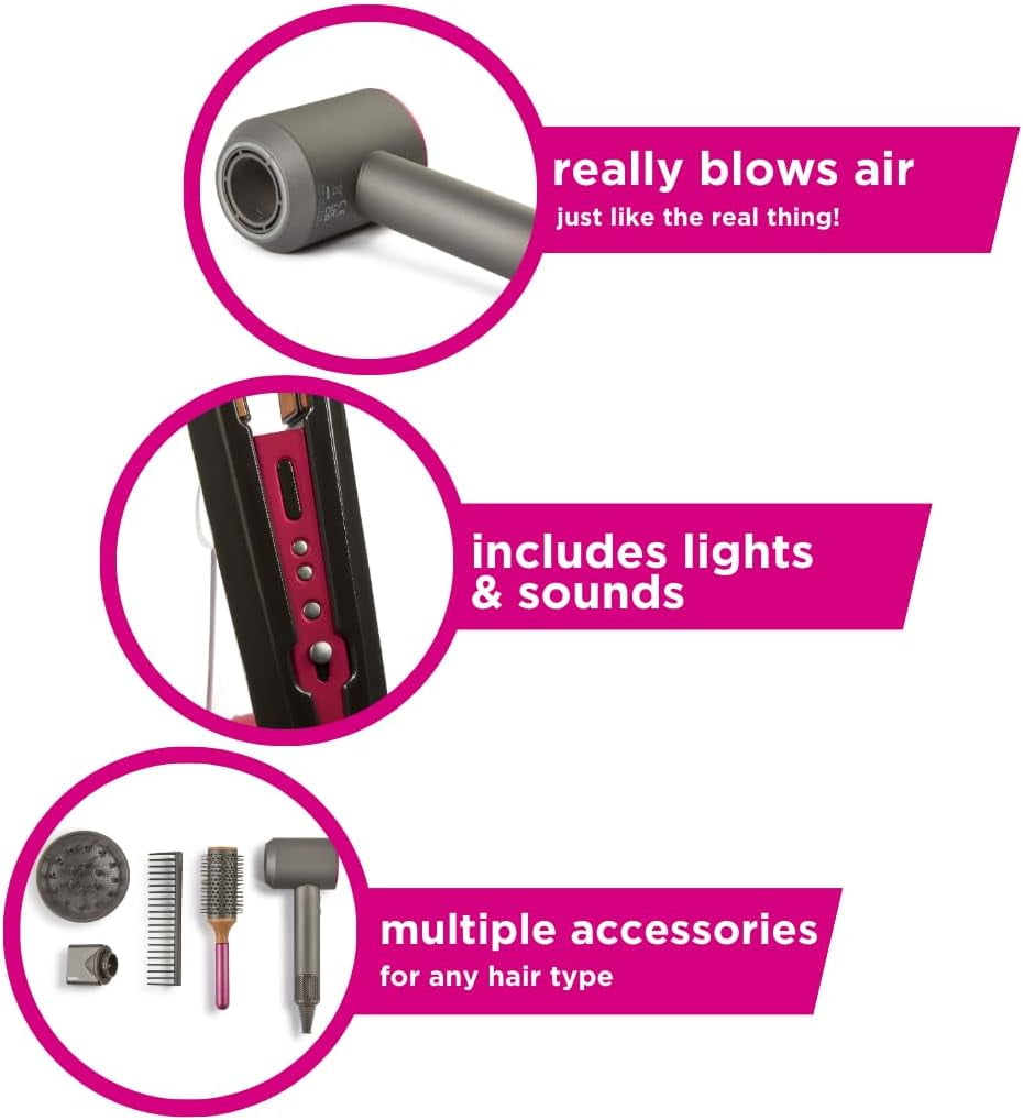 Mimics the renowned Dyson Supersonic hairdryer and Corrale straightener, allowing your child to explore the world of professional-grade styling tools Features realistic elements like a straightener with lights and sounds, and a hairdryer that blows cool air, providing an engaging and interactive styling experience Helps develop valuable life skills such as coordination, cause and effect, and social skills as children experiment with different hairstyles Includes a range of styling accessories, including a nozzle, diffuser, barrel brush, and detangling comb, to ensure a complete salon-like experience Suitable for children aged 3 and up, providing endless hours of fun and learning as they unleash their inner stylist