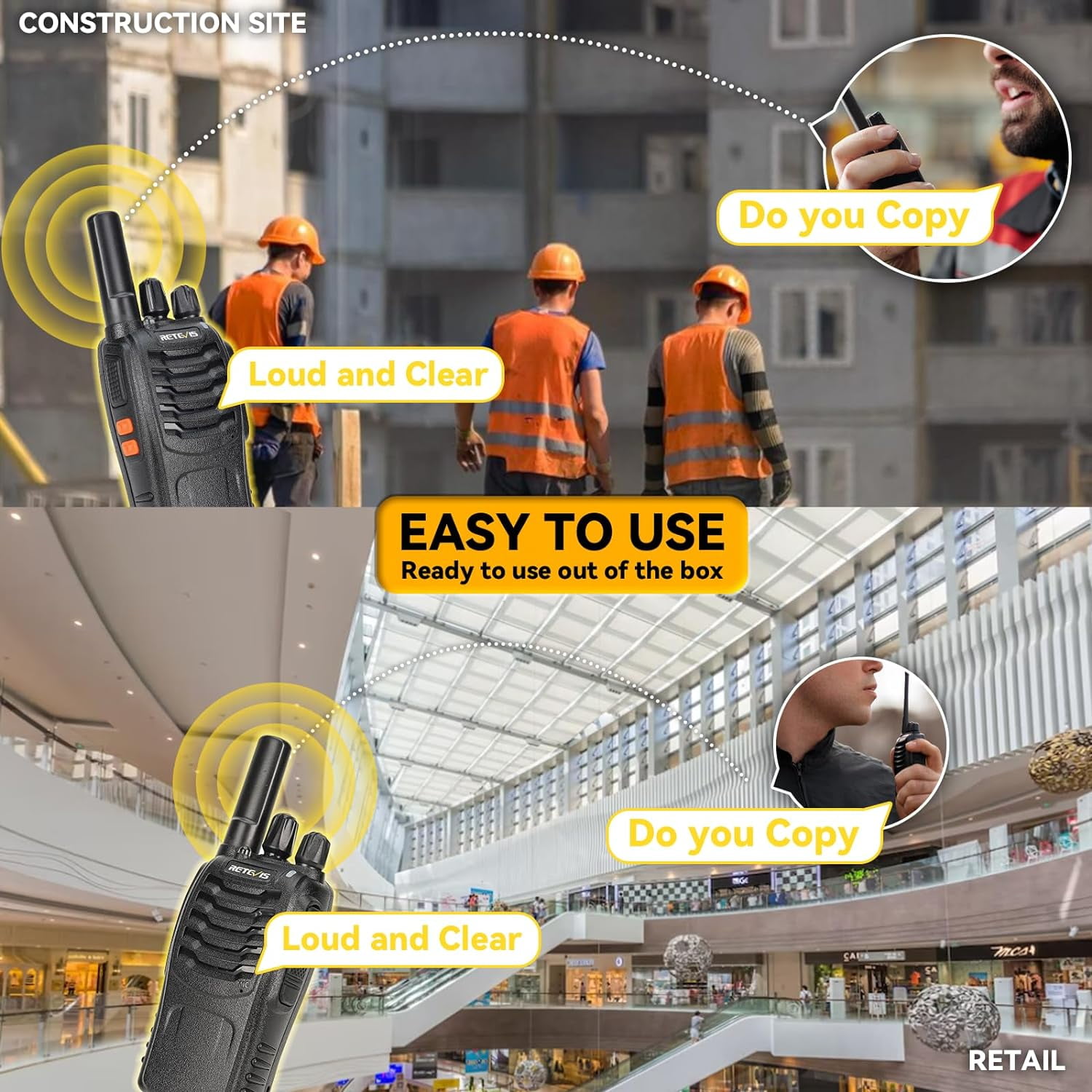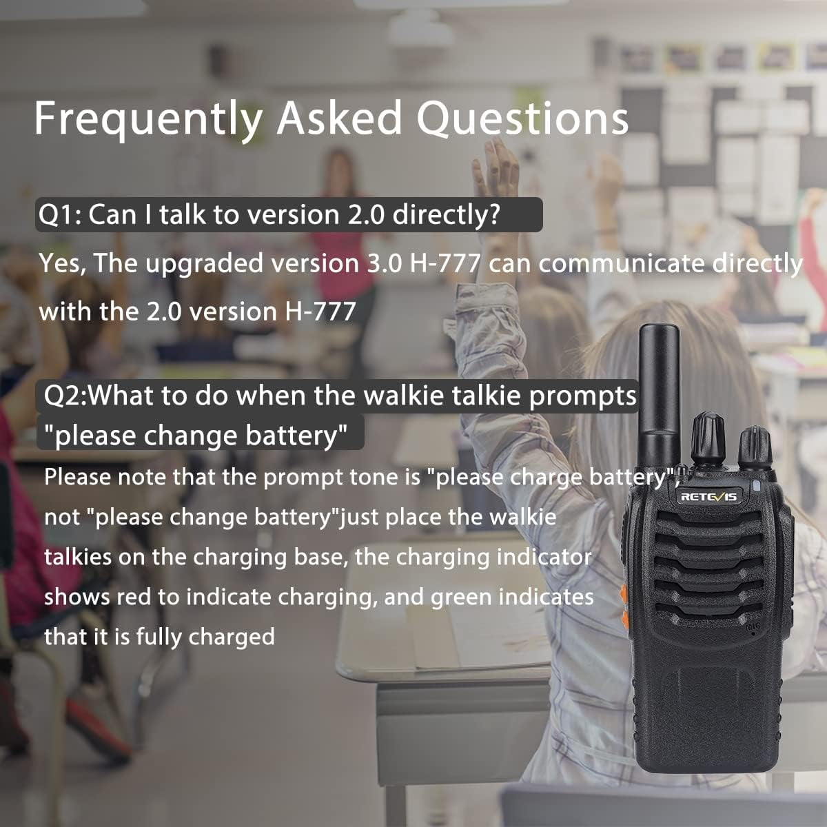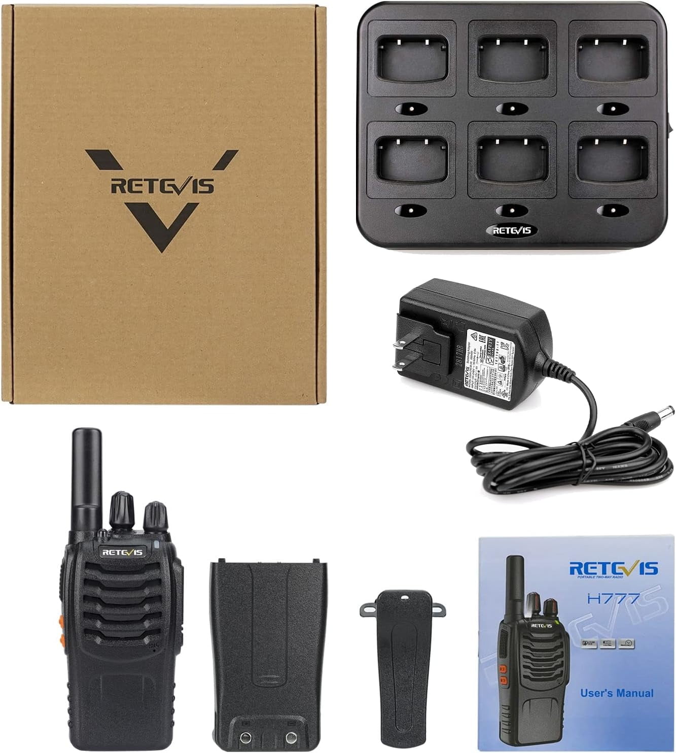 【Universal Compatibility】H-777 4.0 version can compatible with 2.0 and 3.0 version on the same channel out of box; you can also directly talk to walkie-talkies such as RT22 RT27 RT68 B3H RT19 RT21 H777H etc 【Superior Audio Performance】radios walkie talkie with upgraded speaker and squelch function; provides loud sound delivery for every call; suitable for festival parties; seminars and other scenes; event planners can communicate more clearly 【Easy to Use】ready to use out of the box; and functions can be quickly accessed via shortcut keys; VOX; emergency alarm; led flashlight; save time and free the user’s hands 【Lightweight Walkie-Talkie】ergonomic 4.02×2.20×1.34inch; ultra-light 0.26lb; short antenna prevents snagging and easy to grip; suitable for restaurant waiters during busy dining peak hours 【Long Battery Life】upgrade Type C; equipped with a 1000mAh Li-ion battery; continuous working for 12 hours; support long-term wedding planning activities, and the rechargeable 2 way radios will continue to work 【Multifunctional walkie-talkies】hands-free; emergency alarm; squelch; LED flashlight; power saving; low battery reminder; our walkie talkies is only FRS walkie talkies; the FCC ID is 2AAR8H777 【6 Way Multi Gang Charger】H-777 walkie talkies with 6-way gang charger can charge six radios or six batteries at the same time; with multiple safety charging protections; you don’t have to worry about charging overnight; saving you time and space 【Lifetime Customer Support】we provide 2 year warranty and 30 days no reason to return; 2 year warranty for radio body and 1 year warranty for accessories
