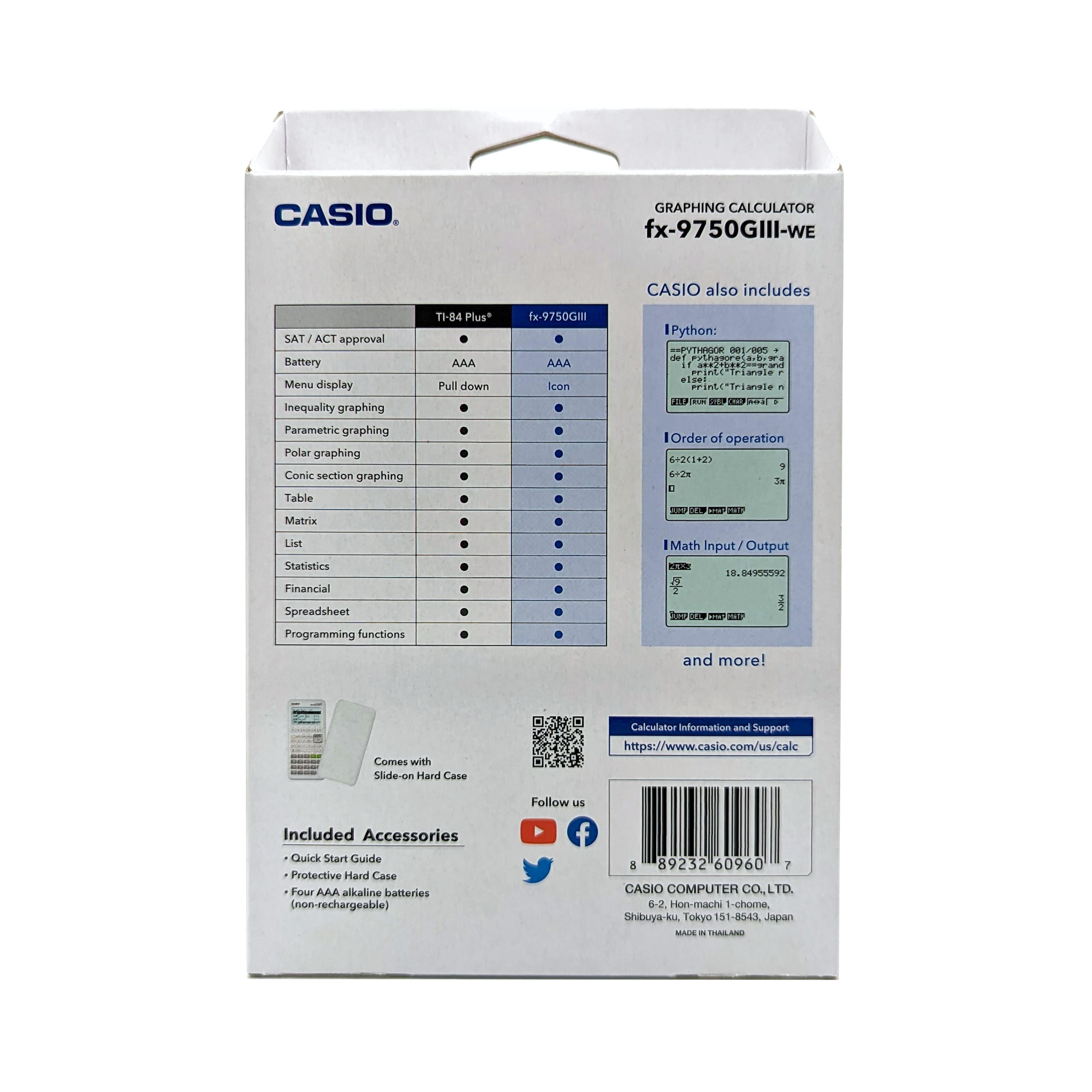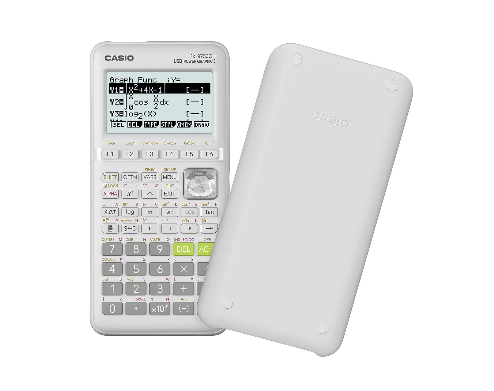 Casio FX-9750GIII Graphing Calculator 3MB Flash Memory Natural Textbook Display Spreadsheet capabilities Unit-to-unit connectivity Powered by 4 AAA batteries (included) Icon-menu provides easy access to advanced functions Graph rectangular, polar and parametric functions and inequalities, graphical analysis, streamlined solving for intercepts, intersections, etc. Capable of graphing x= relations Built-in graphing of conic sections Easily calculate values for given independent/dependent values Interactive Equation Solver Prior Entry Recall Create tables of values from given functions and generate plots and graphs from tables Statistics regressions and graphical displays Complex number calculations Numerical differentiation and integration Recursive sequences Capture, clip & paste capabilities Matrix operations and inverses