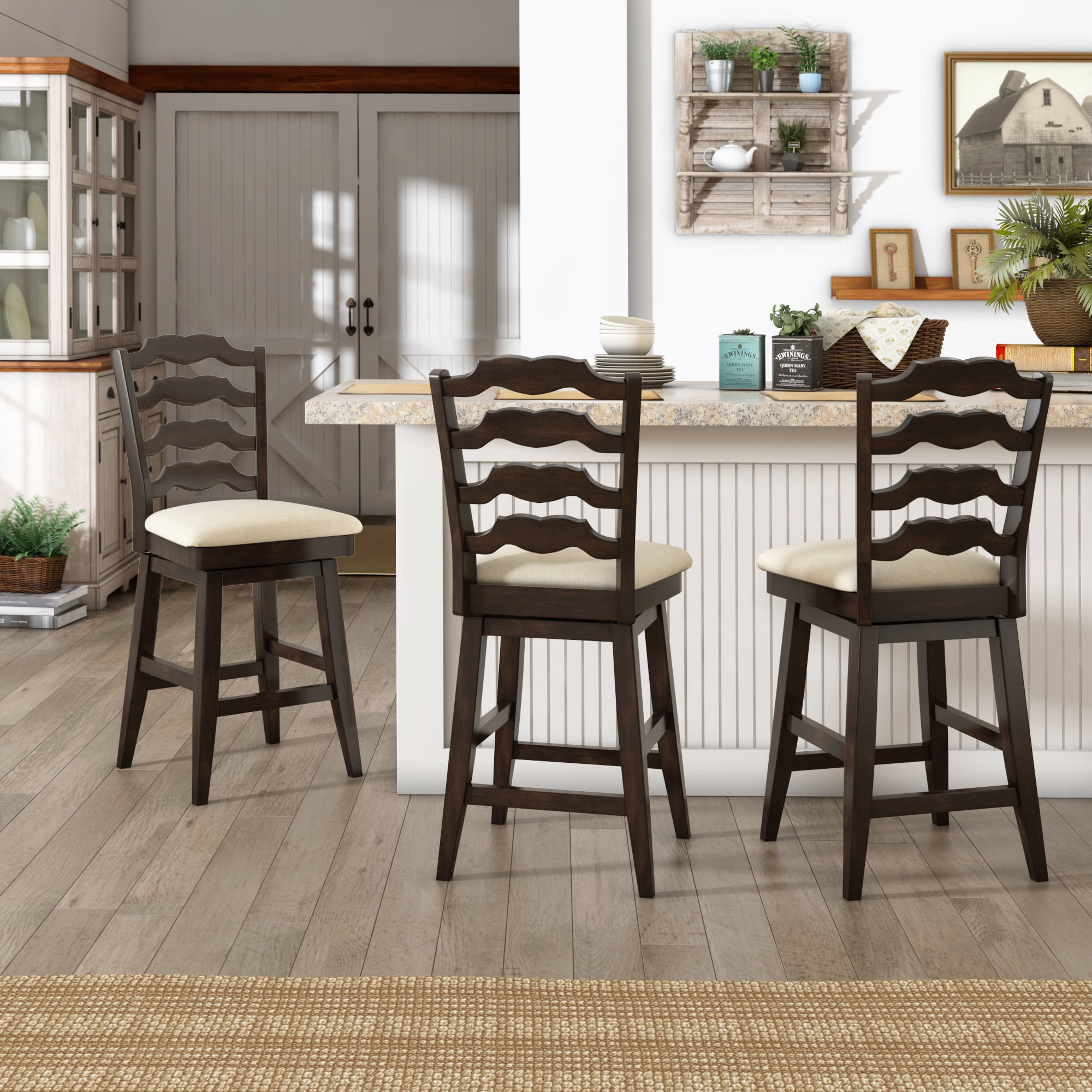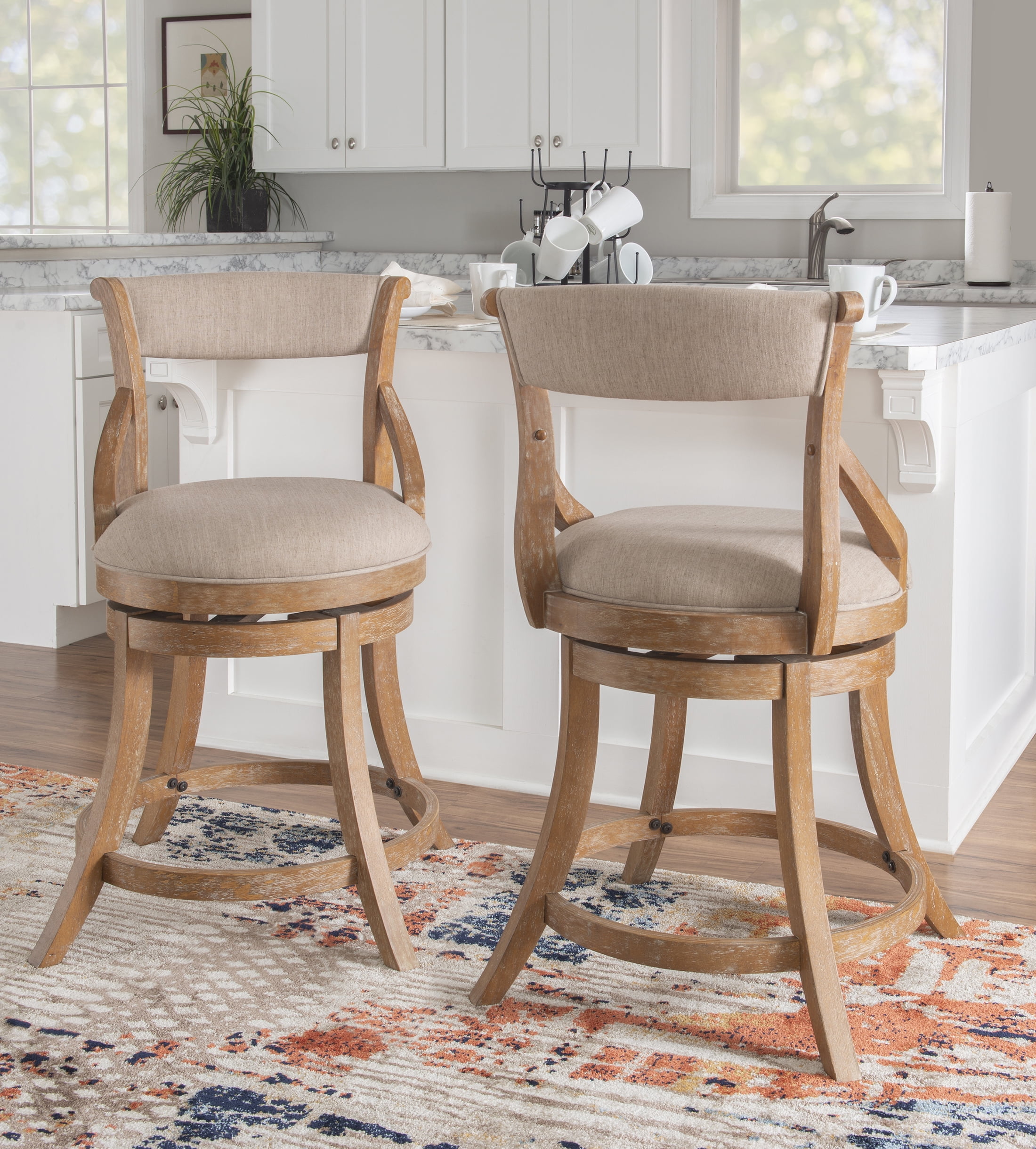Heavy Duty, weight capacity tested to 400 lbs Seat height is 26″, perfect for table counters of 30″ to 35″ Swivels full 360 degrees Wood base and legs finished in natural with a white wash Upholstered padded seat and back in beige fabric Contoured legs create extra stability Seat framed with subtle arms that slide easily under counter Foot rest support Assembled Dimensions: 22″ W x 24″ D x 40″ H Ships in one box