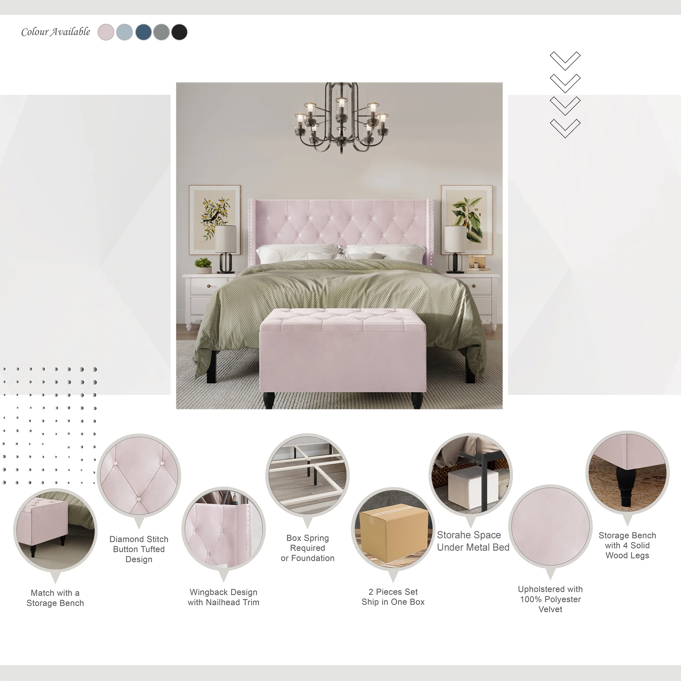 Revitalize your bedroom with the opulent charm of our expertly crafted bed, meticulously constructed from solid wood and enveloped in sumptuous 100% polyester velvet upholstery. The frame takes center stage, boasting a diamond button tufted headboard and a timeless wingback design enriched with intricate nailhead trim. Included with this bed is a matching storage bench, designed to complement the bed’s aesthetics while adding functional storage. With an array of sizes – Twin, Full, Queen, and King, tailoring the bed to your space has never been easier. Choose from our captivating color palette: Silver Grey, Light Grey, Light Blue, Black, Light Pink, and Navy Blue. The bed requires a box spring or foundation for optimal support. While assembly is necessary, we’ve taken care of the details by providing all the essential hardware and comprehensive instructions. To further simplify the process, the bed is thoughtfully packaged in a single box, ensuring a hassle-free setup.