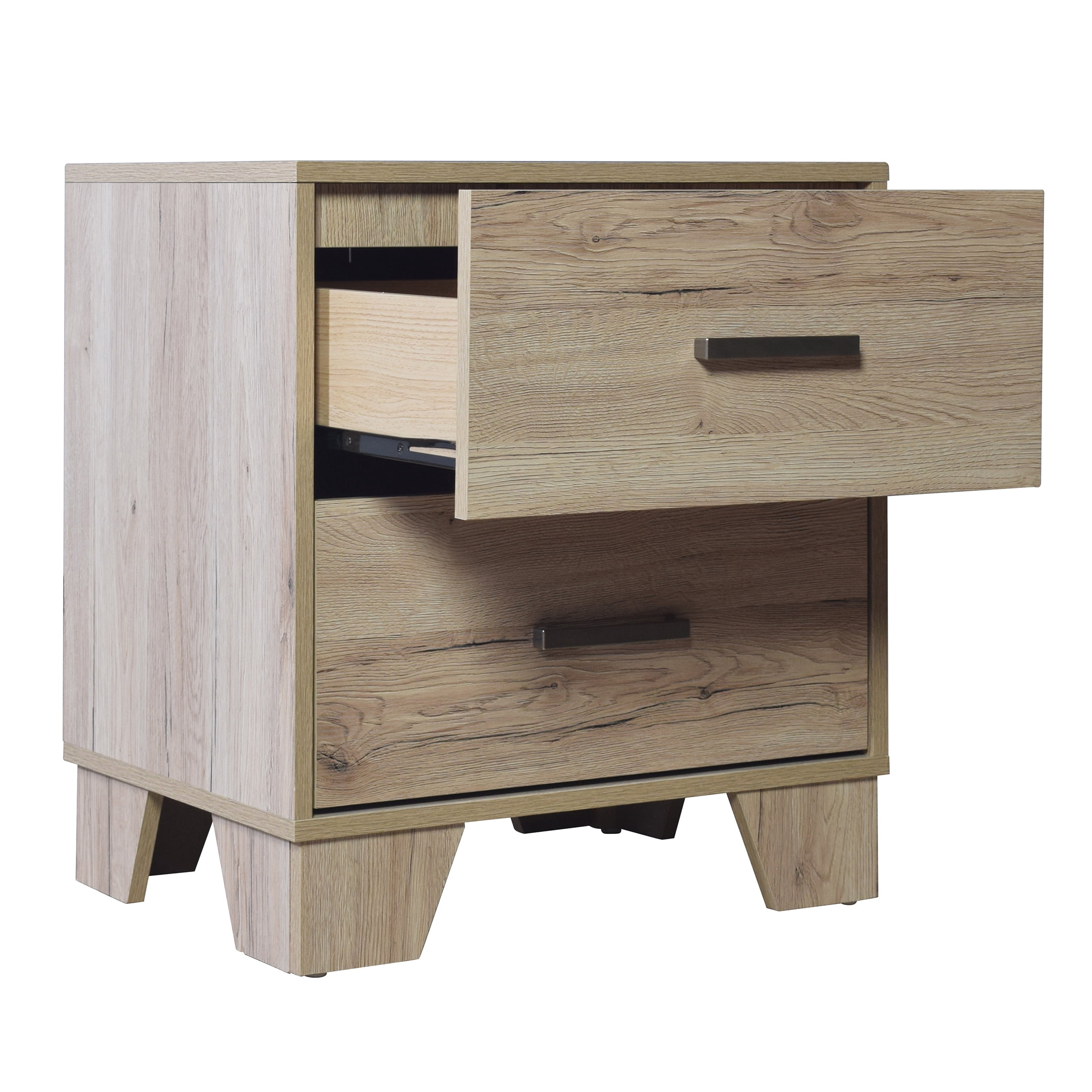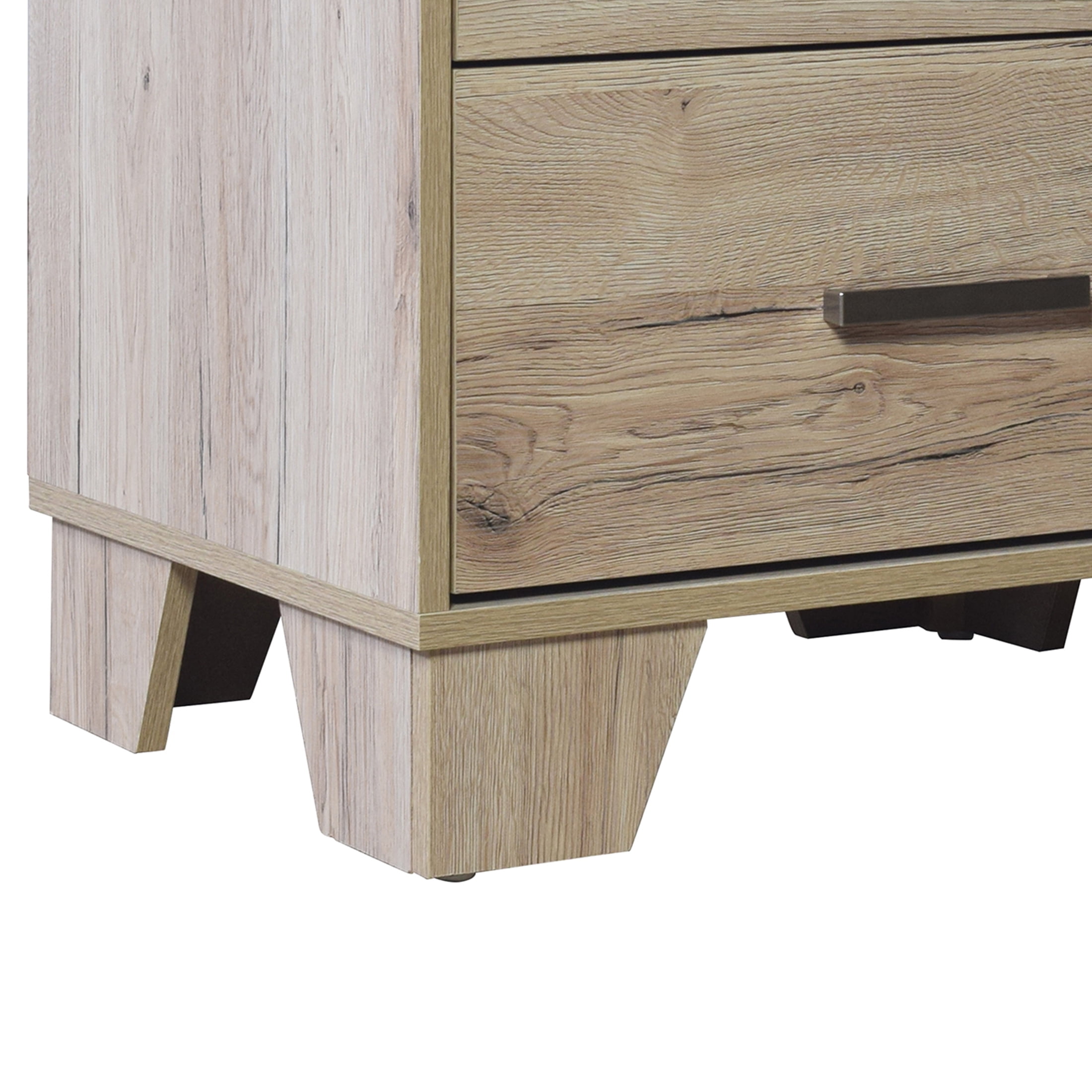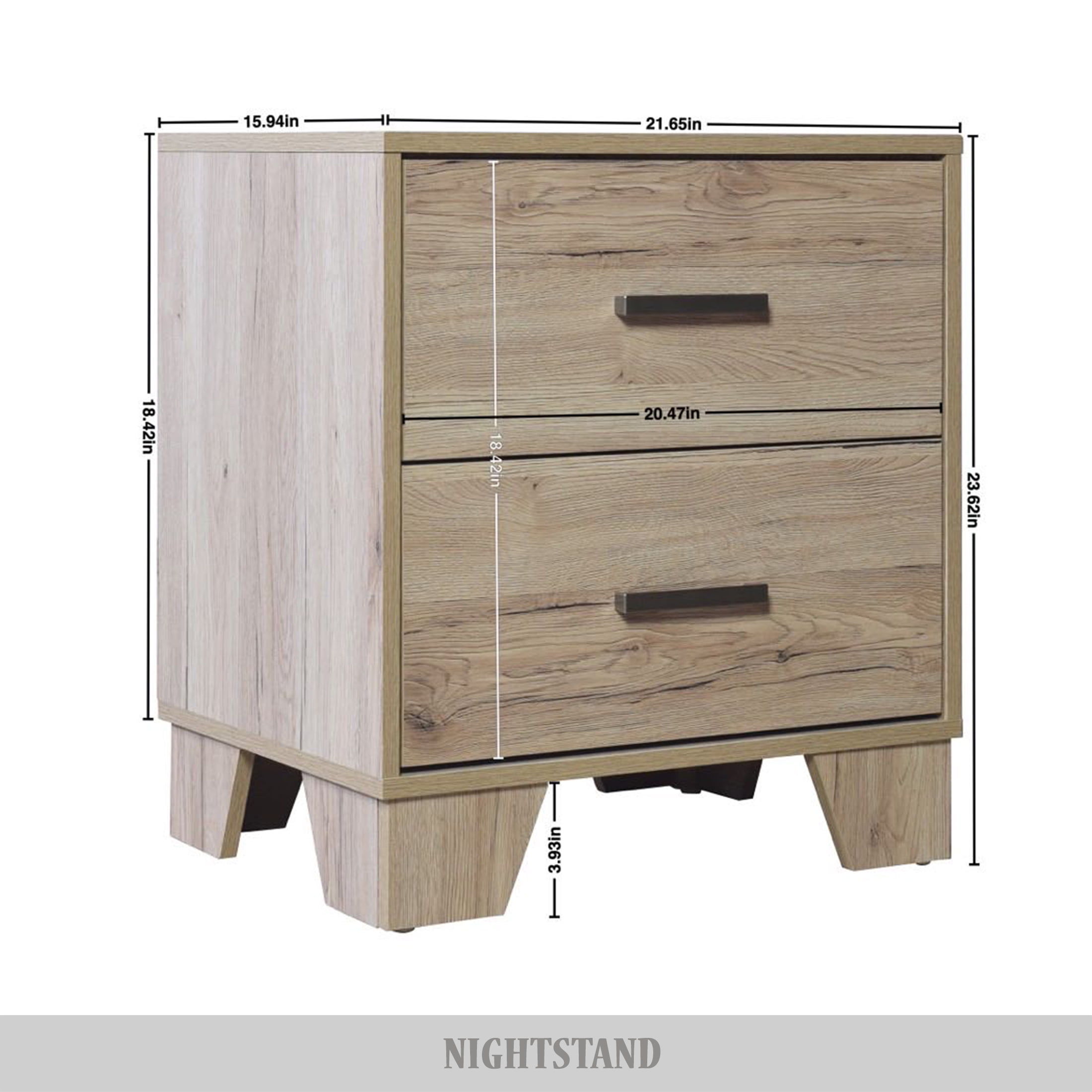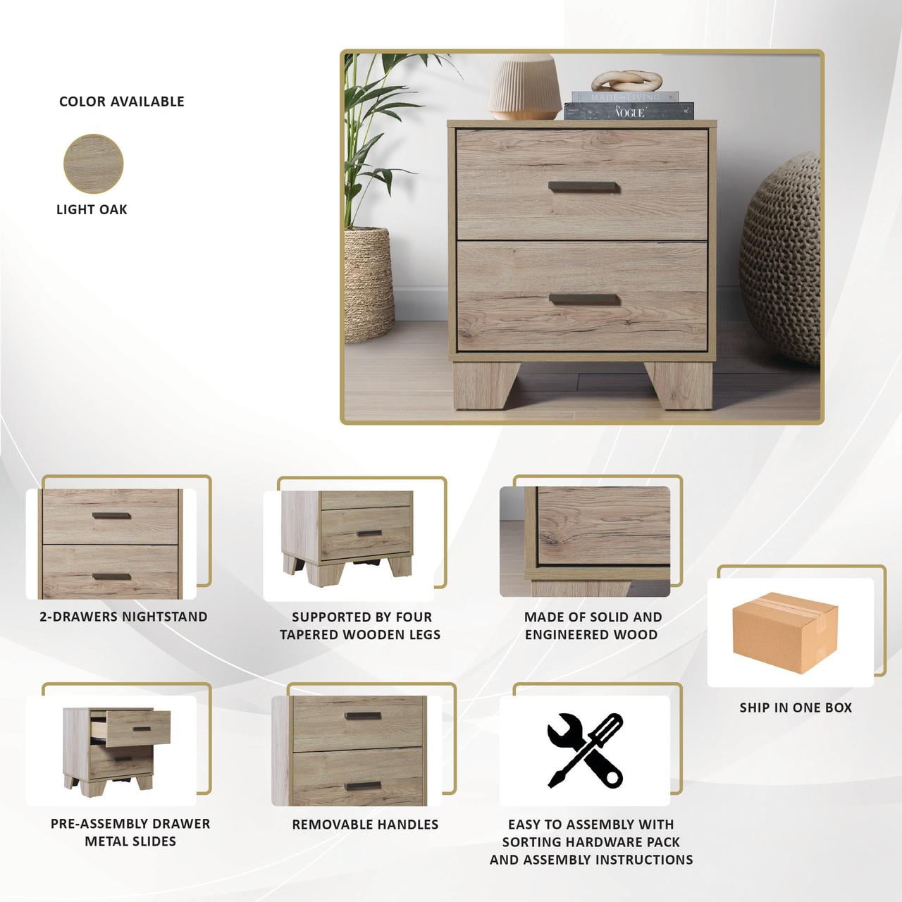 Introducing the must-have adult nightstand that will effortlessly complete the look of your bedroom. This exceptional piece features two spacious drawers, providing ample storage space for all your personal belongings. The drawers are equipped with pre-assembled metal slides, ensuring they open and close smoothly and effortlessly, offering you a hassle-free experience. Crafted with a blend of solid and engineered wood, this nightstand guarantees unmatched durability and longevity. Its robust construction makes it a perfect choice for those seeking furniture that will withstand the test of time. The spacious top surface of the nightstand serves as a functional centerpiece, allowing you to place essential items within easy reach. Whether it’s a stylish table lamp, your favorite book, or other bedside essentials, this nightstand offers the perfect spot to keep them handy. Supported by four sturdy tapered wooden legs, this nightstand guarantees stability and reliability. The tapered legs add a touch of elegance and sophistication to the design, elevating the overall look of the nightstand. The nightstand is designed for easy assembly, thanks to the included sorting hardware pack and assembly instructions. It conveniently ships in one box, making the setup process hassle-free and convenient. Available in Sanremo Light Oak color, adding a sophisticated flair to your space.
