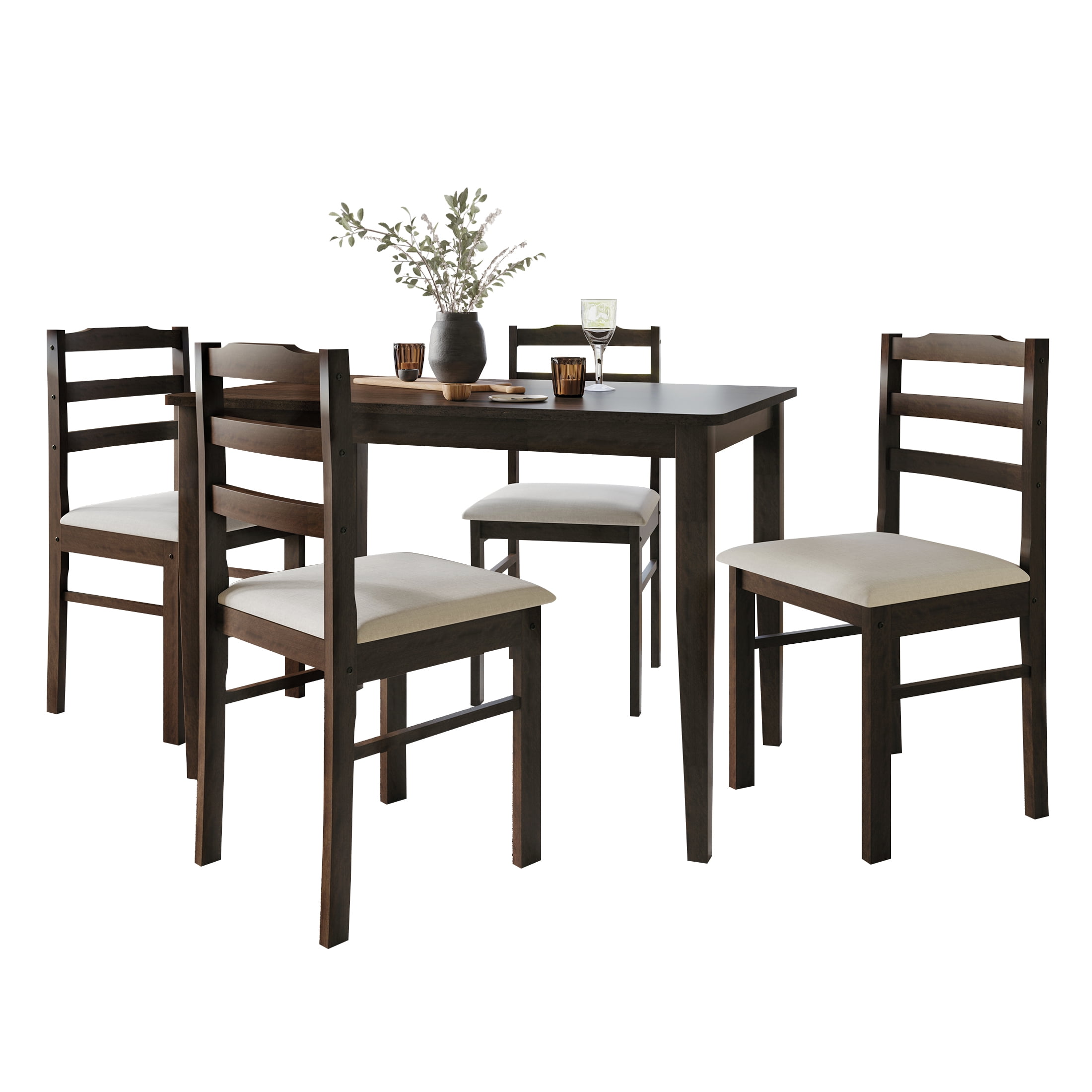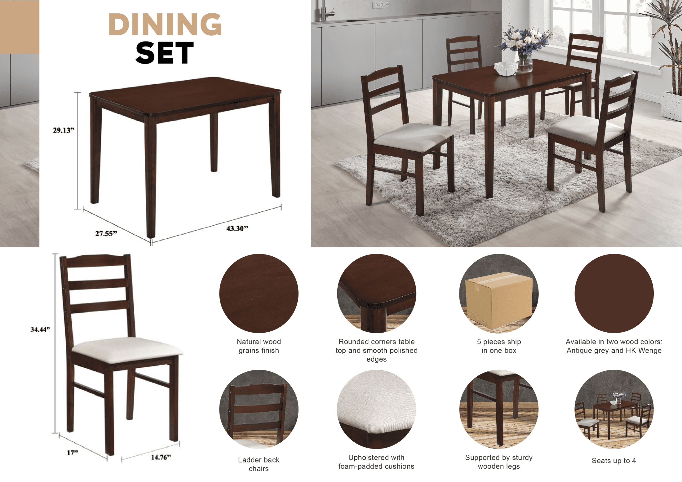 Includes: 1 dining table and 4 chairs The natural wood grains finish gives sensational tradition and classy look to your dining space The dining chairs offer comfortable seating with foam cushions
