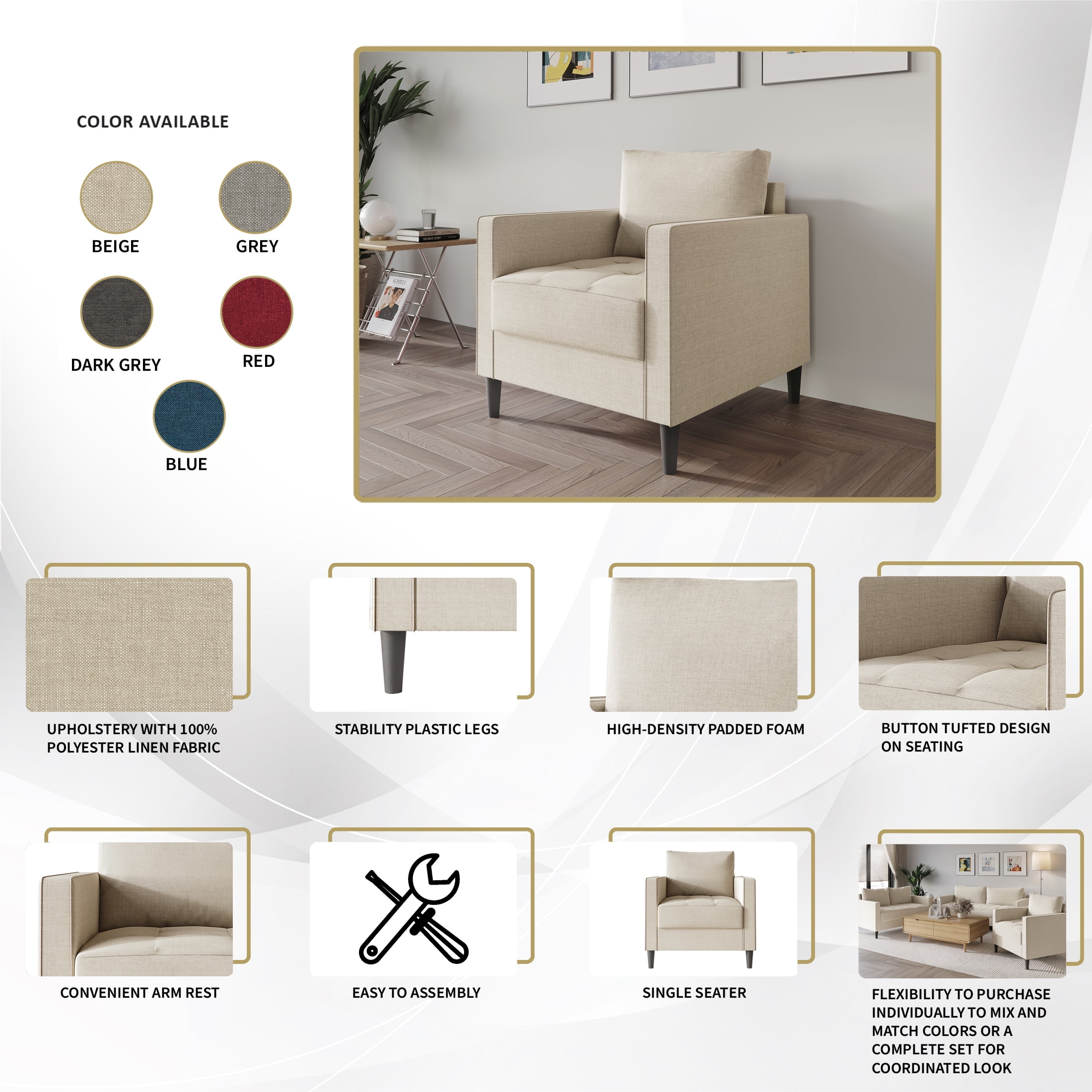 Contemporary and minimalist designs effortlessly blend into a variety of decor styles High density foam offer comfort and superior seating experience Removable back cushions Upholstered with 100% linen fabric for easycare and long-lasting usage Crafted with a sturdy frame, high-quality materials and dark finishing plastic legs Available in red, blue, dark grey, grey and beige Easy assembly required Product overall dimension: L:31.52 x W:31.91 x H:35.46 ; Seating dimension: L:20.47 x W:23.03 x H: 19.49 Ships in One Box