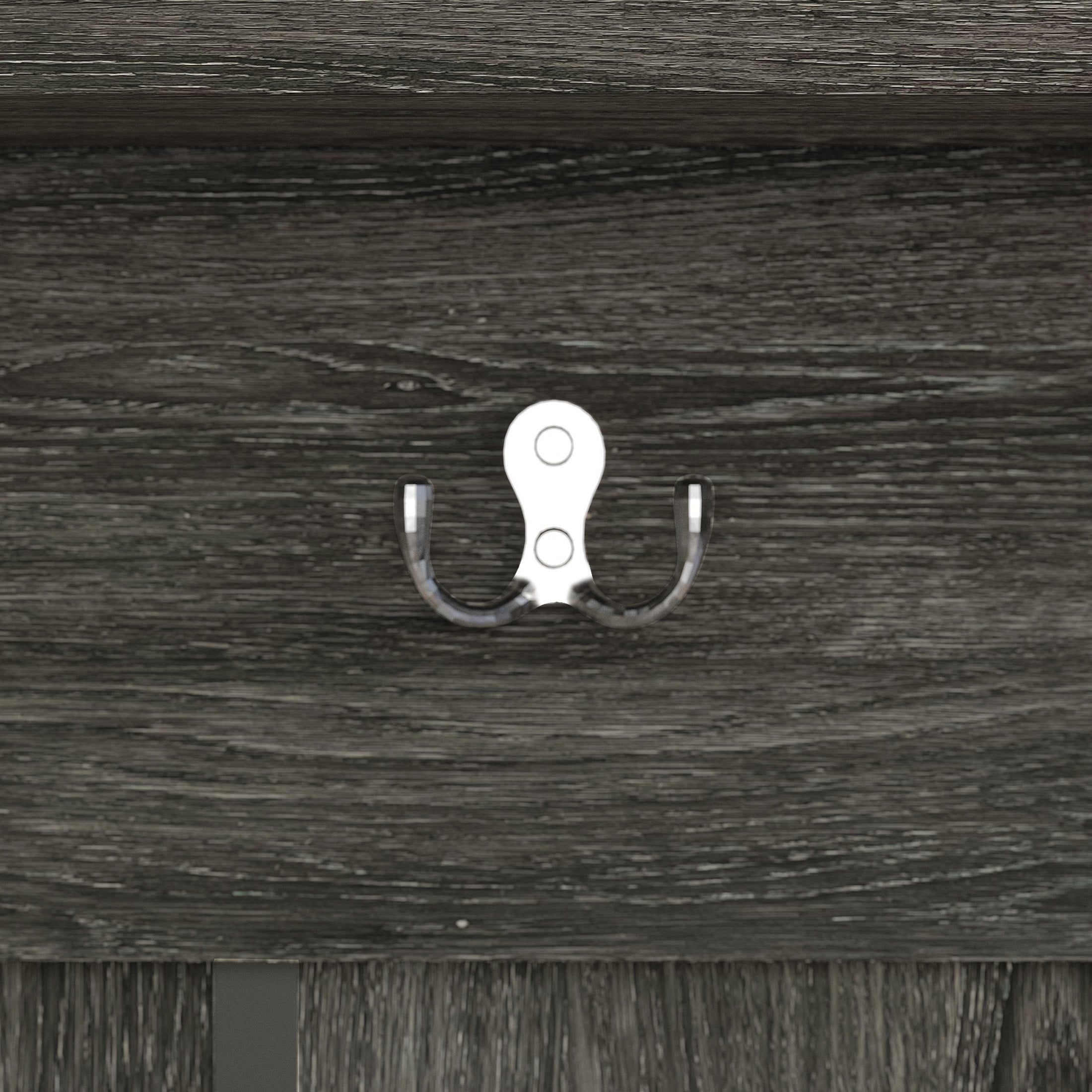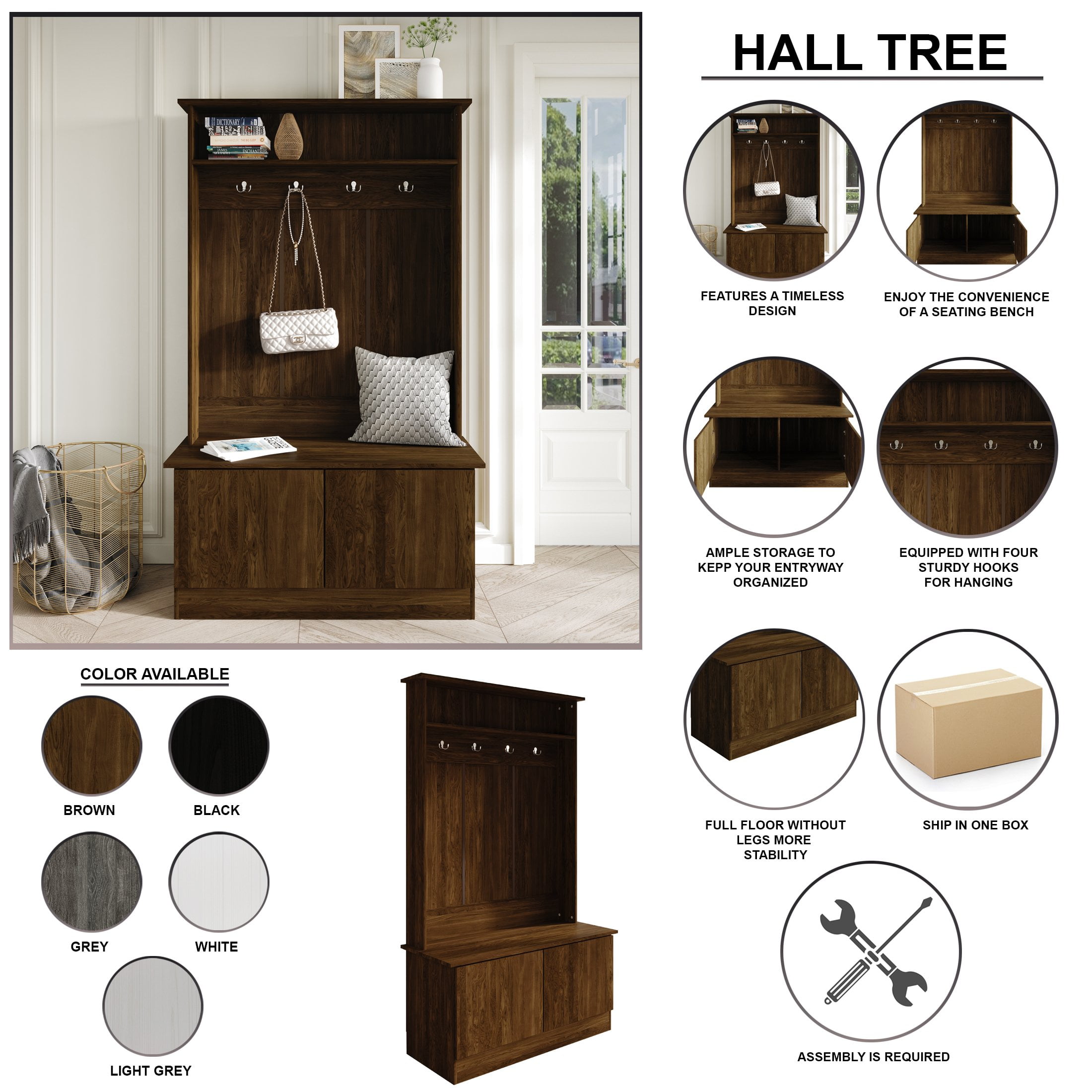 Timeless design suits various living room or entryway styles Provides ample storage while maintaining a tidy space Double prong hook ideal for hanging coats, hats, towels, and bags Constructed from a combination of solid wood and engineered wood for durability Legless full floor design enhances stability and simplifies cleaning Includes a builtin bench or seating area, along with two cabinets featuring doors Available in multiple colors: Dark Grey, Light Grey, Brown, Black, and White Ships in one box for easy assembly
