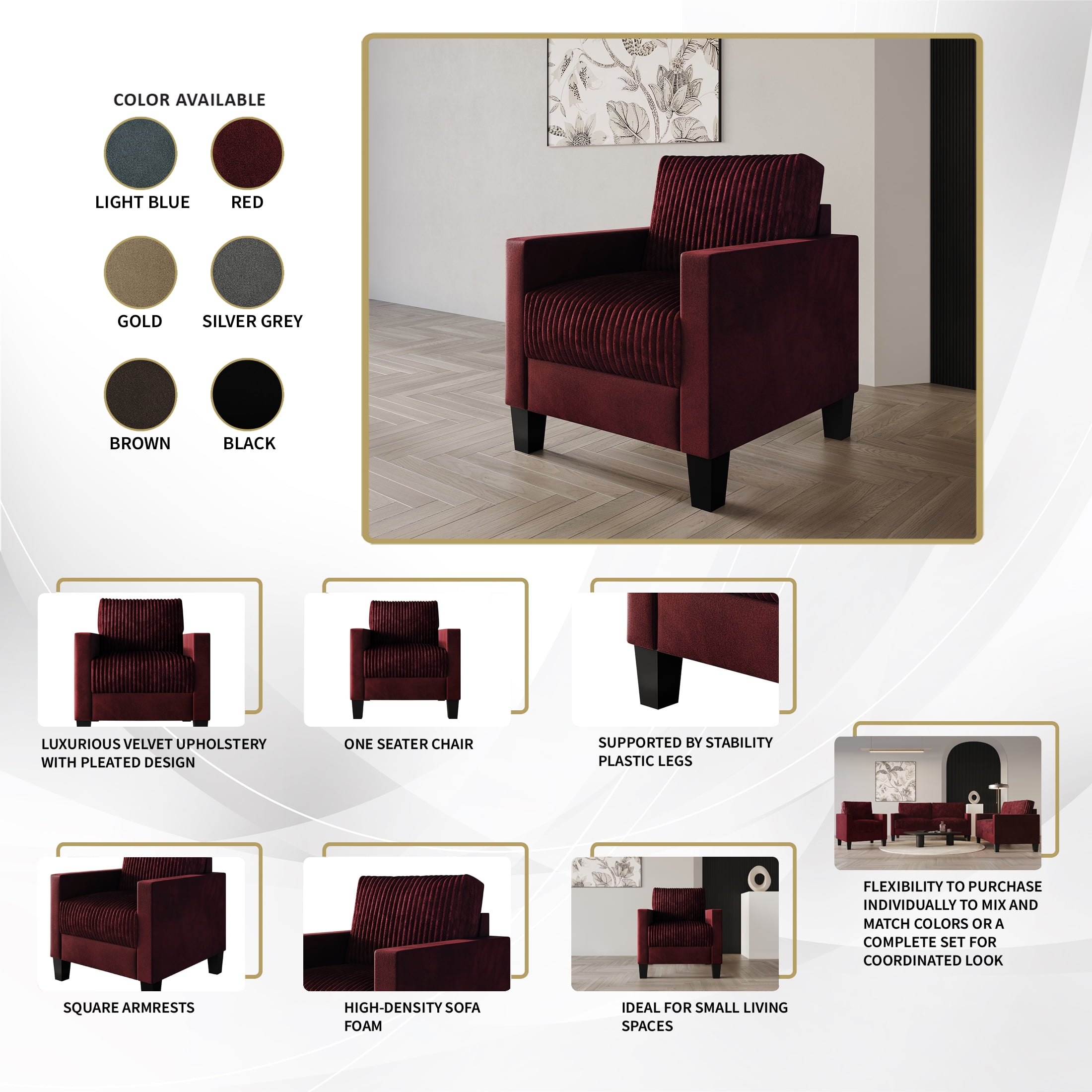Luxurious velvet upholstery featuring a pleated design for enhanced elegance High-density foam padded on back cushion and seat for comfortable and superior seating comfort Supported by four sturdy plastic legs for enhanced stability and support The chair is a single-seater, designed for one person Equipped with square armrests for modern style and comfortable arm support Available in light blue, grey, red, black, brown, and champagne colors to suit various d??cor preferences Assembly is required, with assembly instructions provided Ship in one box