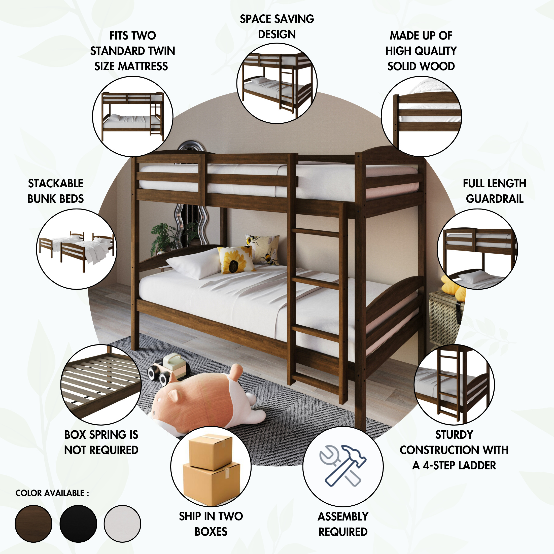 Can be set up as a traditional bunk bed or as two separate beds Provides flexibility for growing children or guest arrangements Clean lines and timeless design that complements a variety of interior styles Made from high-quality, durable wood to ensure long-lasting use Includes slat kits for both top and bottom bunks, eliminating the need for box springs Equipped with full-length guardrails on the top bunk to ensure safety Comes with clear instructions and all necessary tools for hassle-free assembly Ship in one box Available in various finishes: Walnut, White and Black