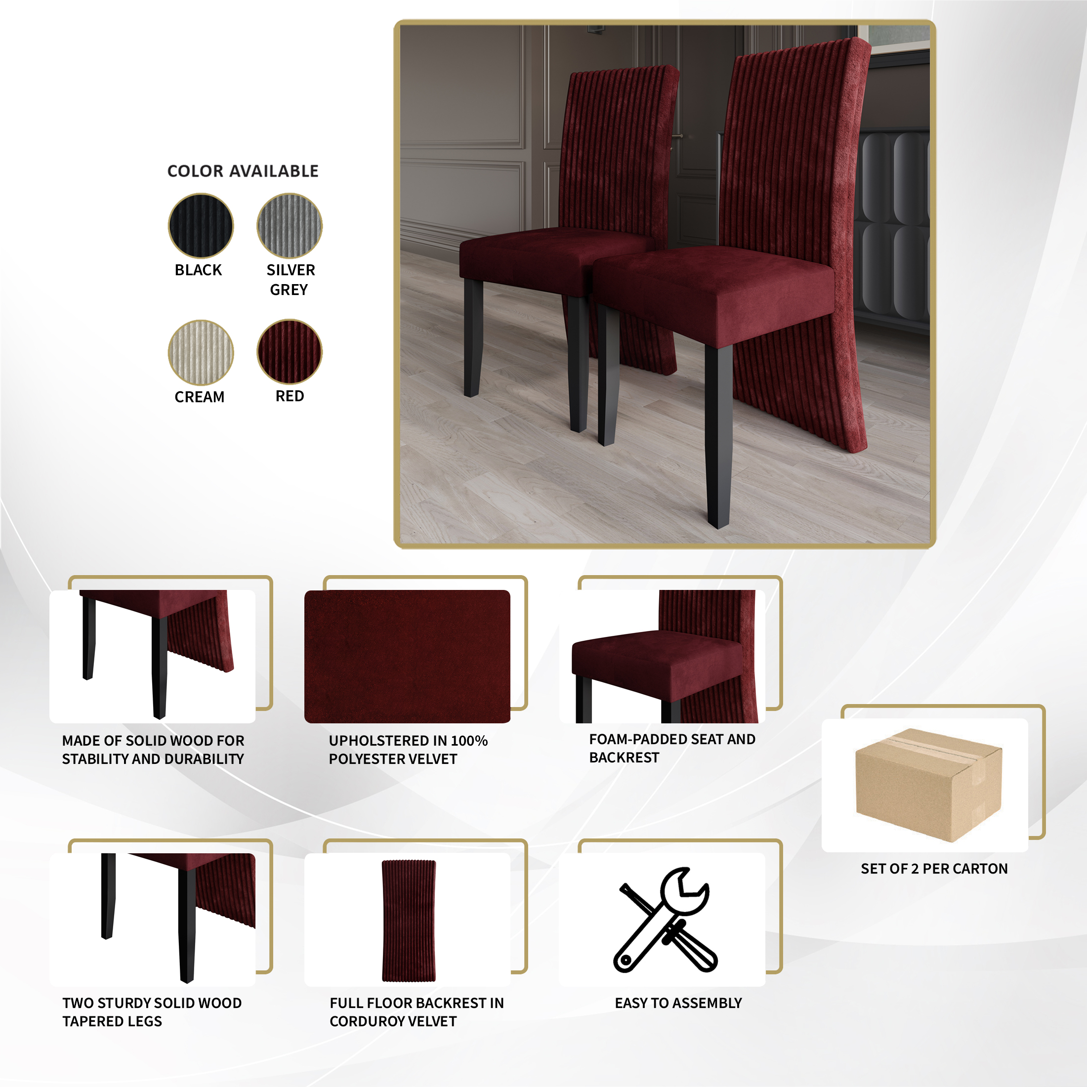 Set of two: Each carton includes 2 chairs The minimal vertical stitching design subtly enhances overall elegance with its simplistic detail Wrapped in polyester velvet fabric, this chair exudes a sophisticated look and feel Designed with a thick cushion seat and ergonomic backrest, this chair ensures optimal comfort during meals The durable wooden legs provide stable and secure seating support The backrest is integrated into the chair’s support leg design Offered in four vibrant upholstery colors: red, grey, black, and cream Assembly is easy and straightforward with included instructions Ship in one box