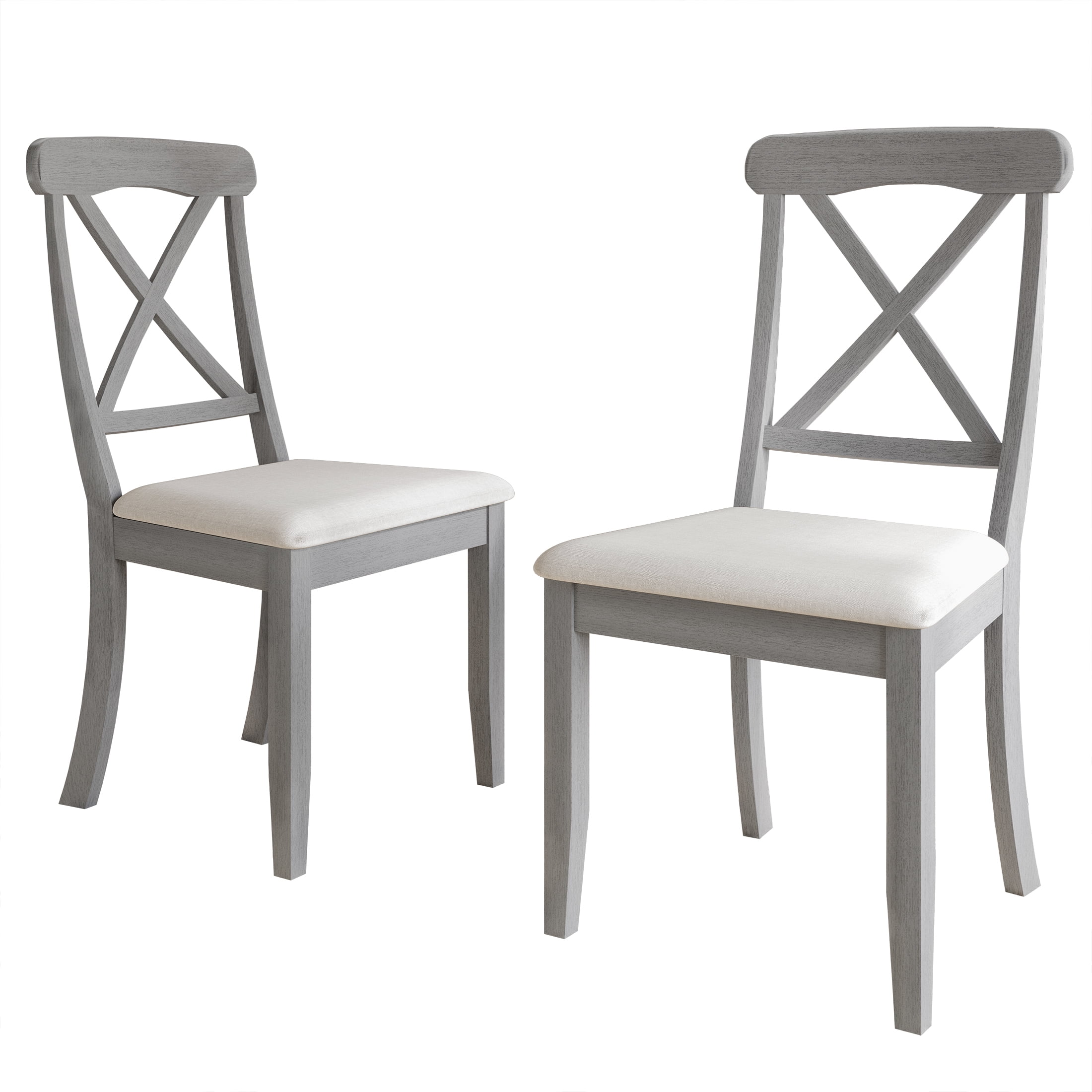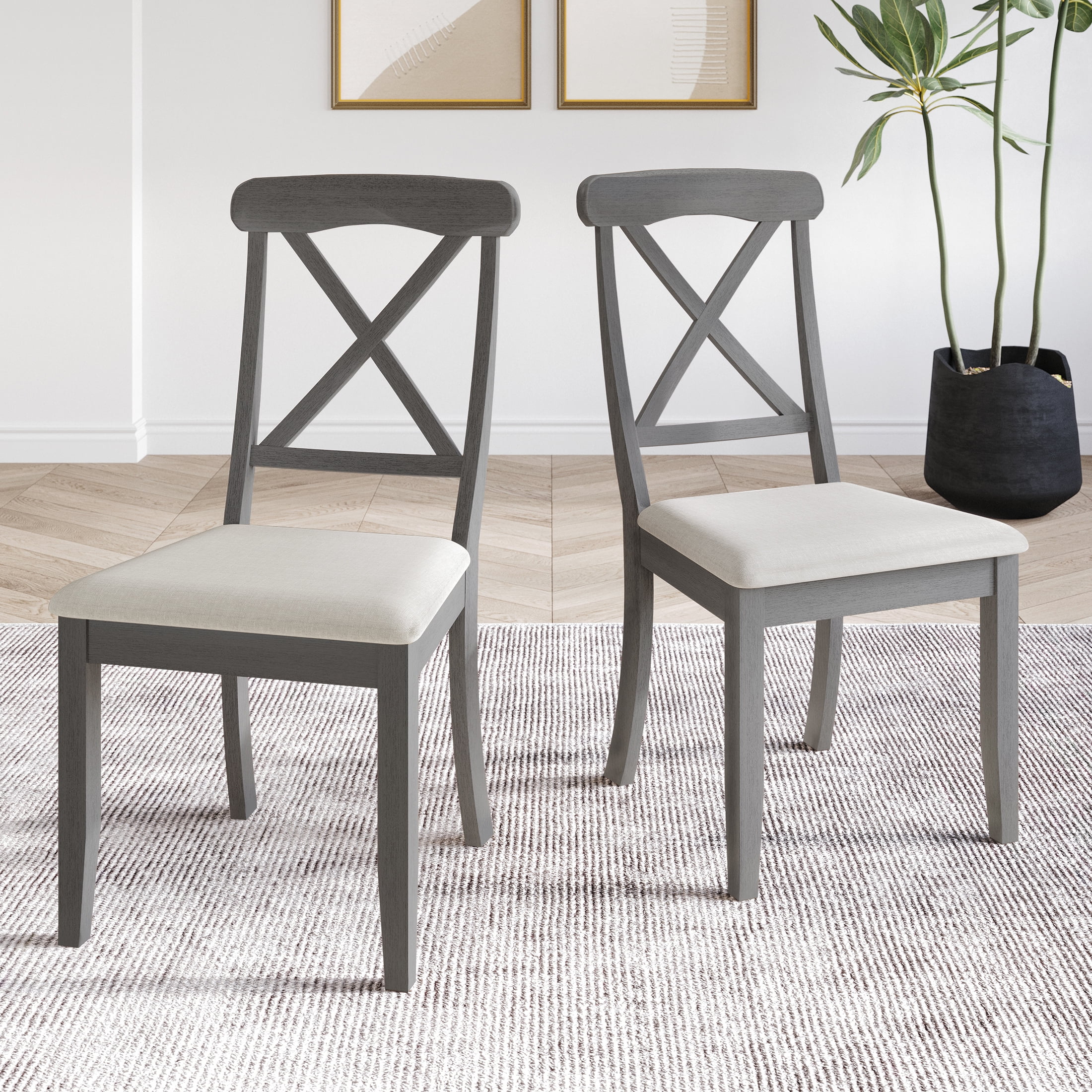 Upgrade your dining space with our durable wooden dining chairs. Featuring a seat cushioned in 100% polyester linen fabric with high-density foam for ultimate comfort. The classic X-cross high backrest embodies charming farmhouse-style design. With four sturdy solid wood legs, assembly is effortless. Available in Brown, Natural Oak, Black, White, and Grey finishes, these chairs effortlessly complement any decor. Each order includes a set of two chairs, simplifying and enhancing your dining area with style. Product Dimensions in inches: Length: 19.70 x Width: 22.85 x Height: 37.43