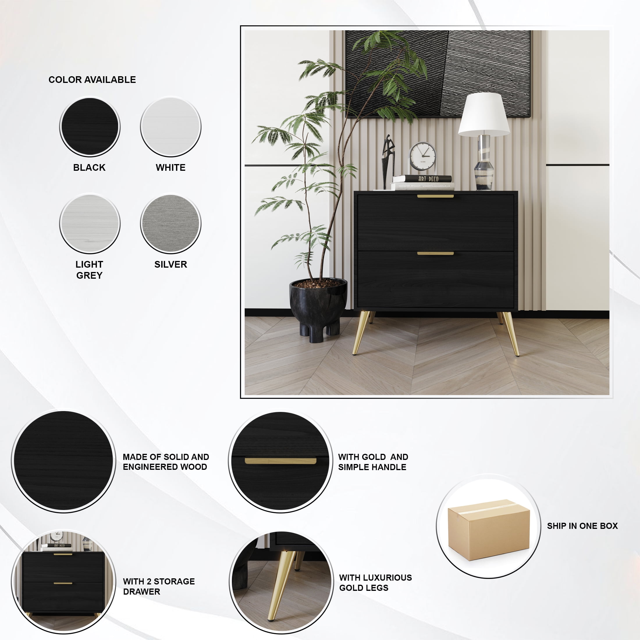 Elevate your bedroom’s allure with our sophisticated adult 2-Drawer Nightstand. Featuring two expansive drawers, it offers abundant storage options, ensuring your essentials are always within reach. Expertly crafted from a blend of solid and engineered wood, this nightstand guarantees unwavering stability and long-lasting durability. The nightstand stands on robust gold-colored metal legs, adding a contemporary charm that’s further elevated by its exquisite gold drawer handles. Cleaning and assembly are hassle-free, allowing you to enjoy the beauty and functionality of this nightstand with ease. Available in captivating color options – black, white, silver, and light grey.