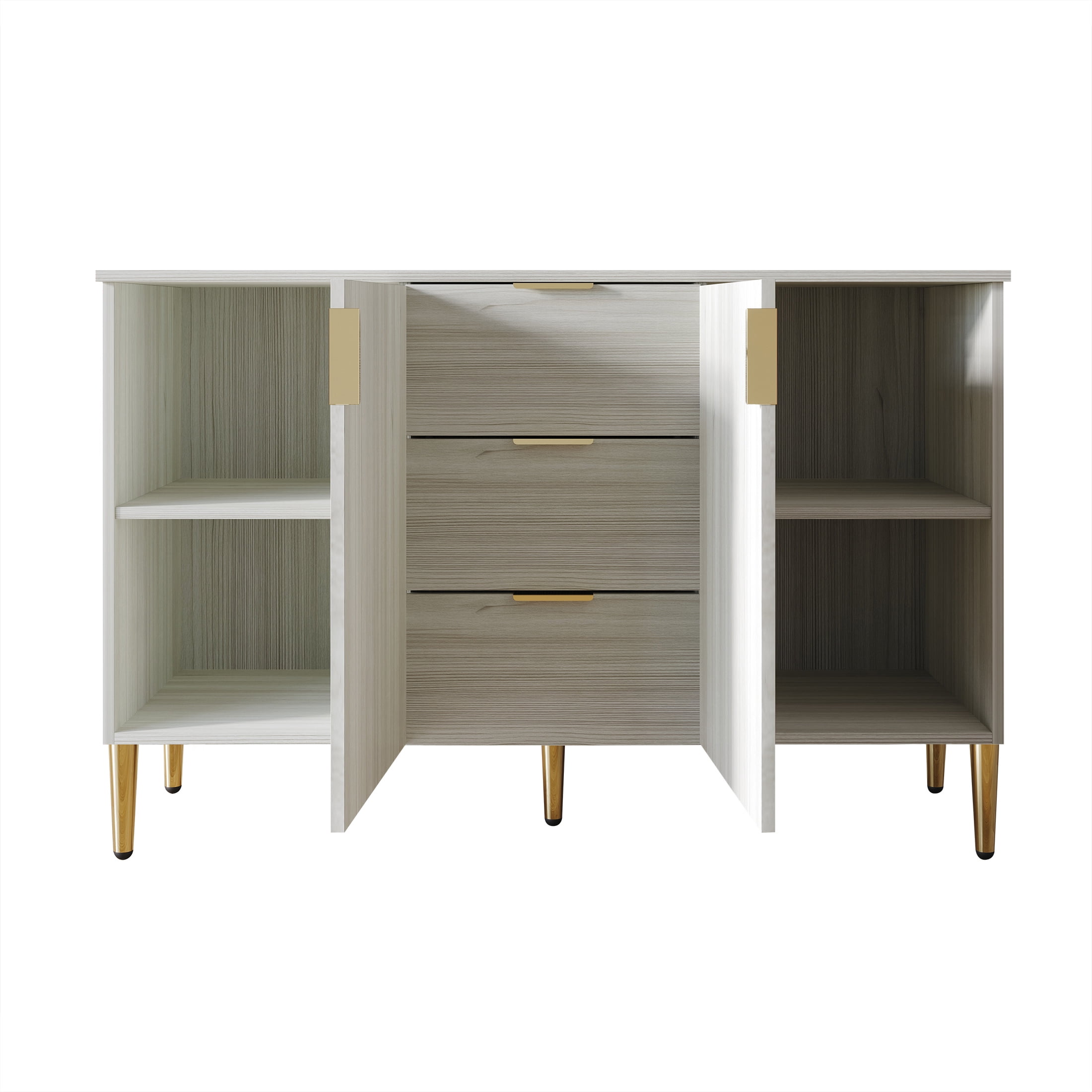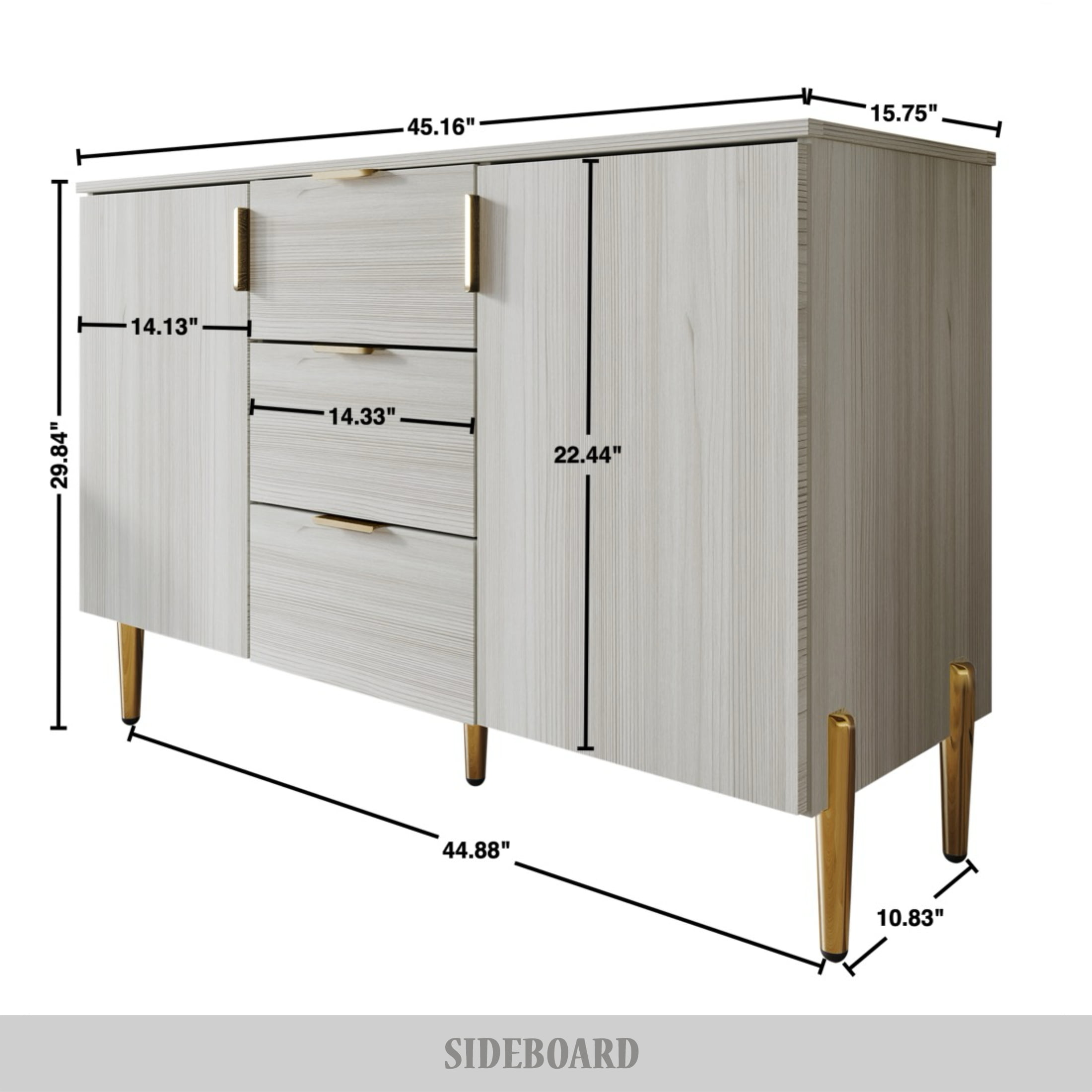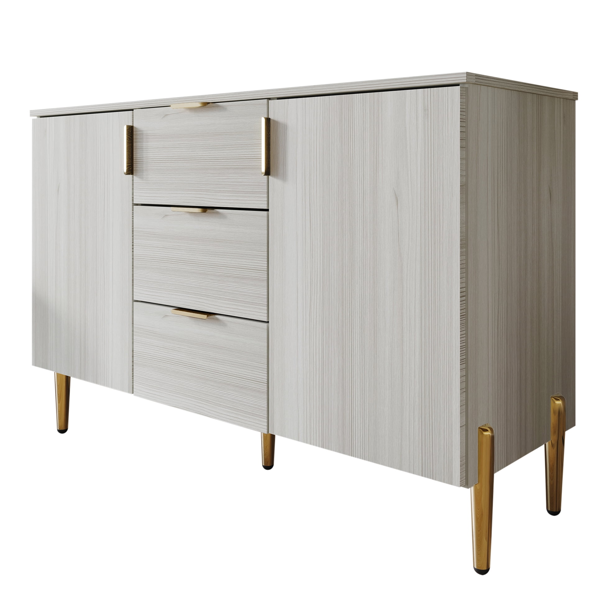 Castle Place Multifunction Modern Sideboard, Engineered Wood Light Grey Multifunction sideboard cabinet featuring three spacious drawers and two large cabinets for ample storage Clean lines design complemented by golden metal legs adds a touch of glamour to your space Generous enclosed storage space helps keep your room tidy and organized Constructed from engineered wood with a veneer finish for enhanced stability, durability, and sturdiness Easy to care for and clean, maintaining its pristine appearance