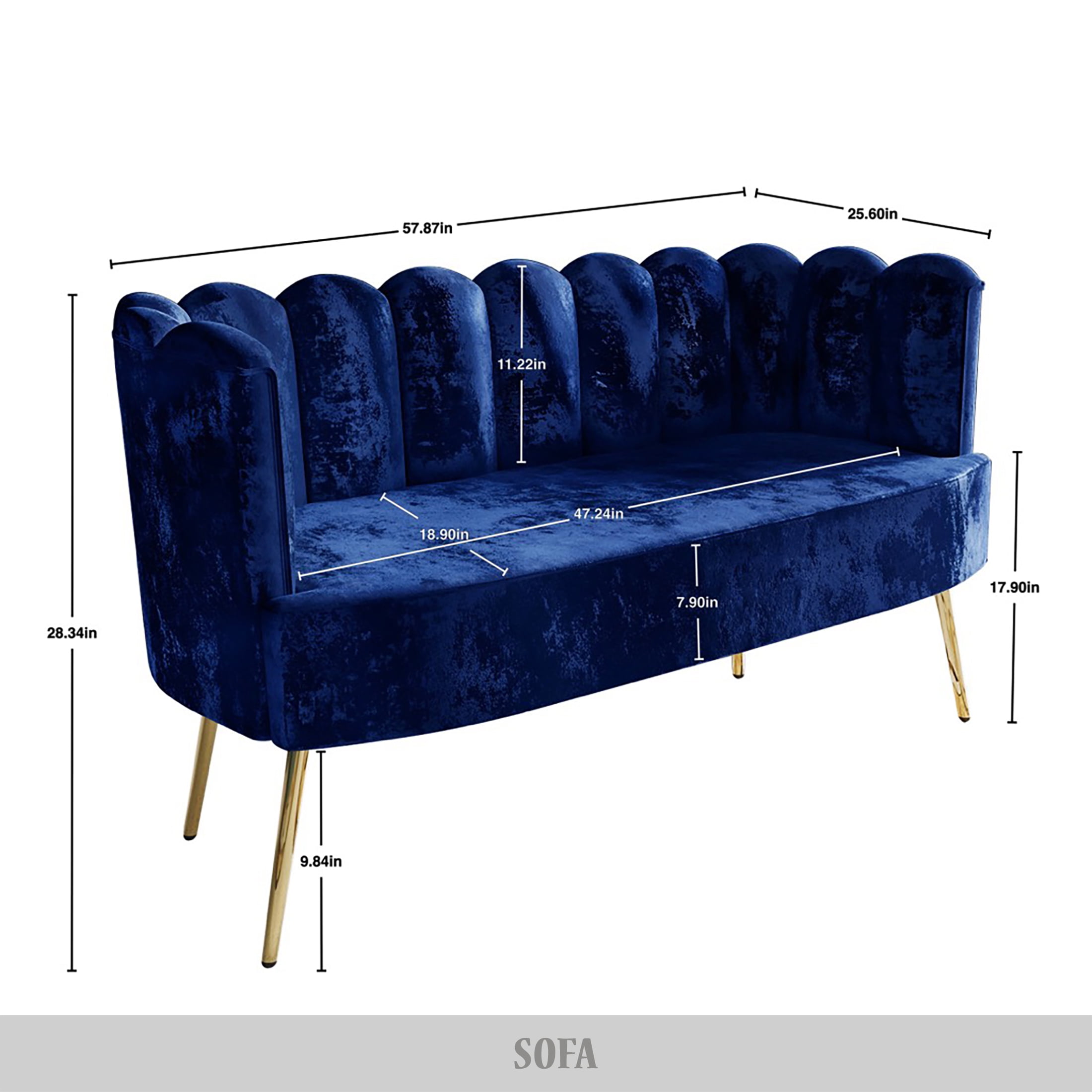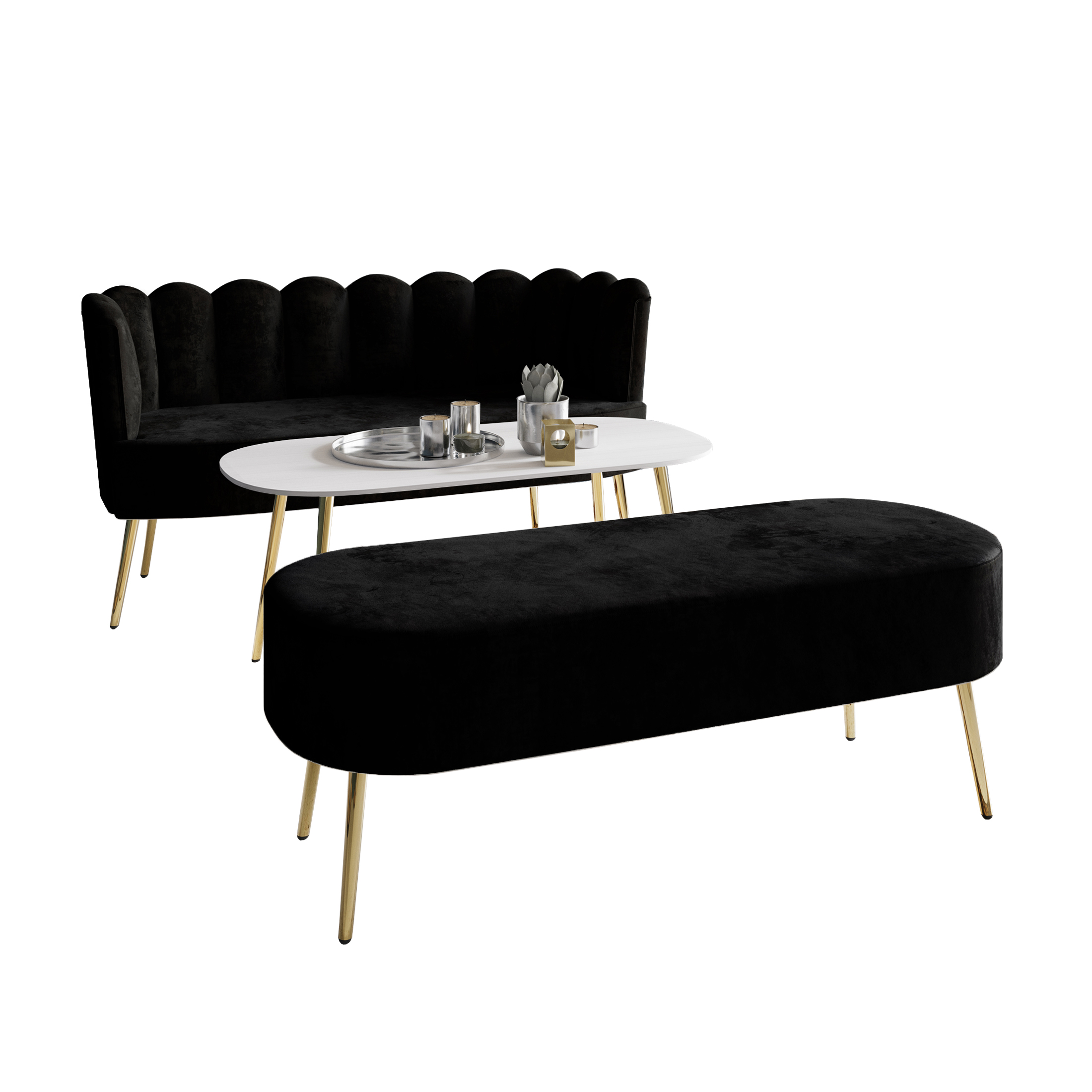 Modern Design : Suitable for any decoration style All parts and instructions are included and easy for an adult assembly in minutes Ship in one box Sturdy golden metal legs Available in five various velvet colors: Light pink, Black, Navy blue, Silver grey and Light grey Made of solid woods to provide strong support Comfortably padded sofa and bench provide unrivaled comfort Included: 1 adult sofa, 1 bench and 1 coffee table