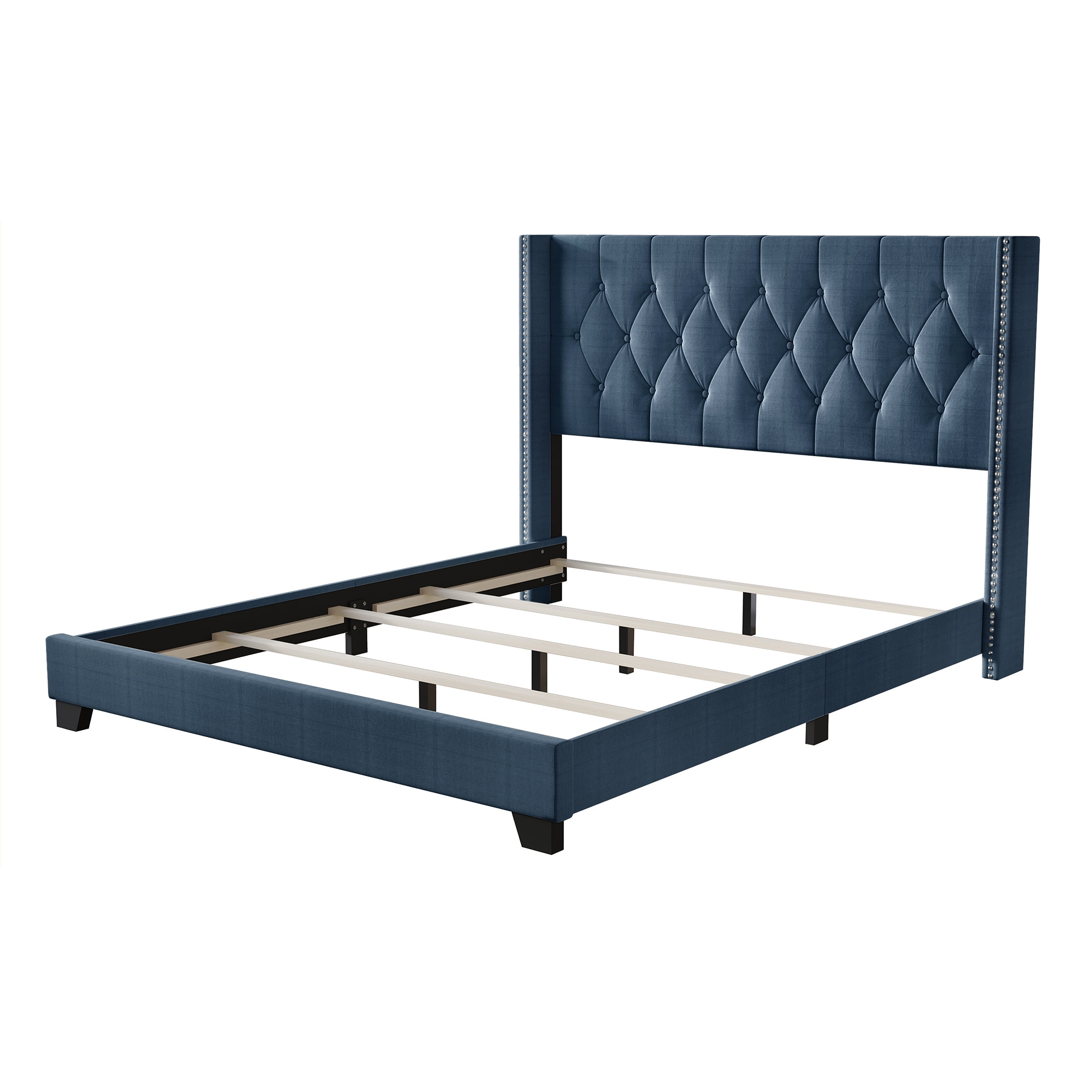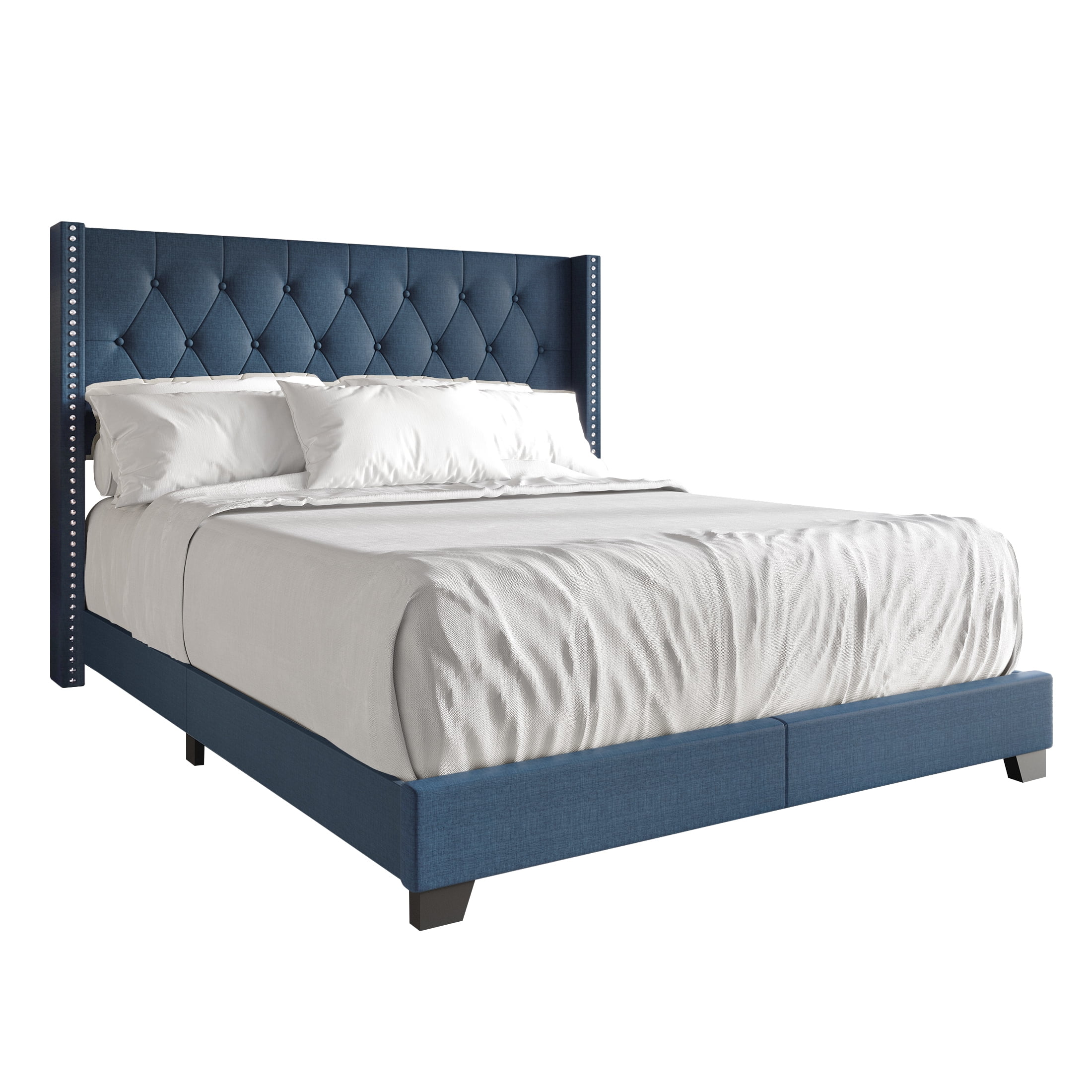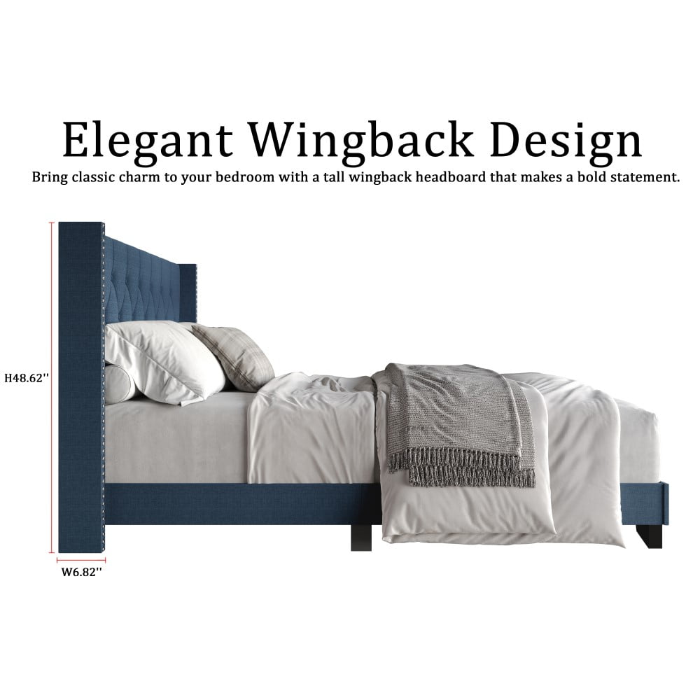 Castle Place Nailhead Trim Wingback Linen Upholstered Bed, Blue, Full