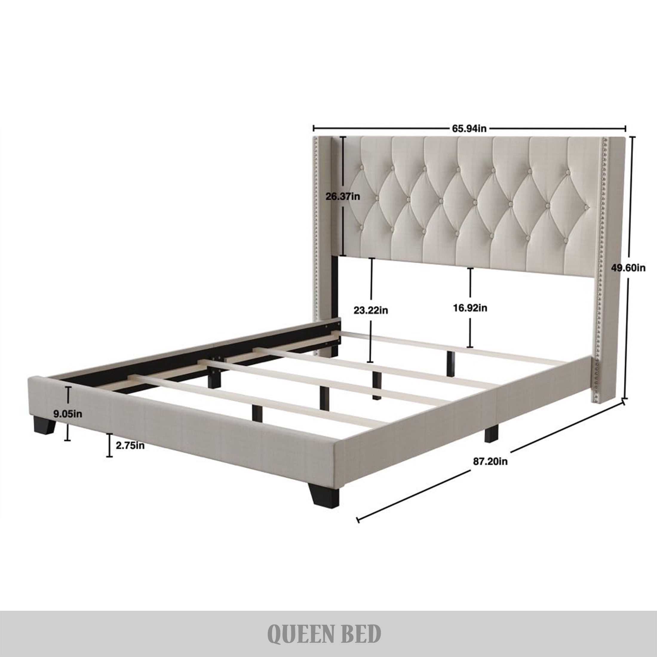Button tufted with diamond shape design on the headboard added glamorous and charm to your space. Made of solid wood upholstered in high quality and durable 100% polyester linen fabric Hand-applied chrome nail head trim along the wingback of headboard to exudes elegant look of your bedroom Box Spring Required or Foundation With four center support legs for Full/Queen sizes; Eight center support legs for King size Available in three size : Full, Queen and King Available in three colors: Warm grey, Charcoal grey and Blue Ship in one box Easy for an adult assembly