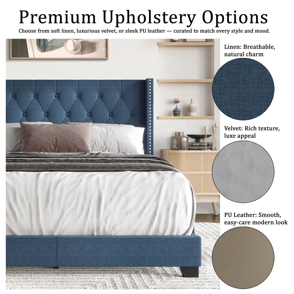 Button tufted with diamond shape design on the headboard added glamorous and charm to your space. Made of solid wood upholstered in high quality and durable 100% polyester linen fabric Hand-applied chrome nail head trim along the wingback of headboard to exudes elegant look of your bedroom Box Spring Required or Foundation With four center support legs for Full/Queen sizes; Eight center support legs for King size Available in three size : Full, Queen and King Available in three colors: Warm grey, Charcoal grey and Blue Ship in one box Easy for an adult assembly