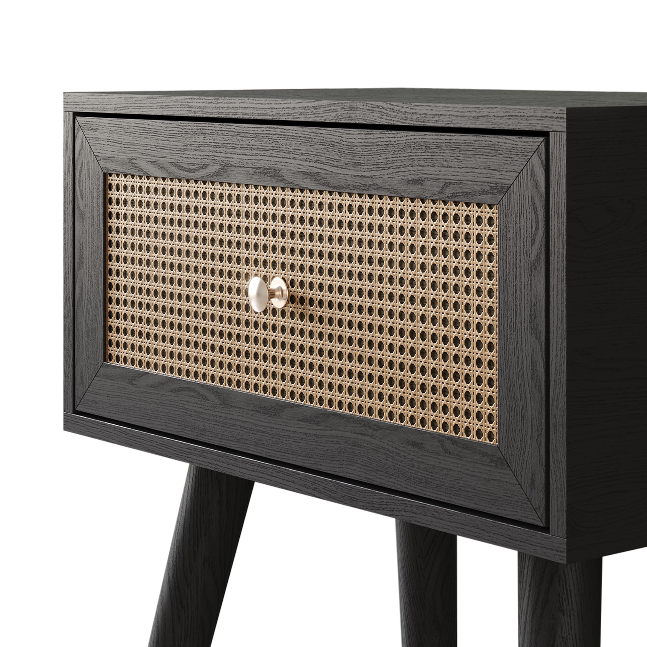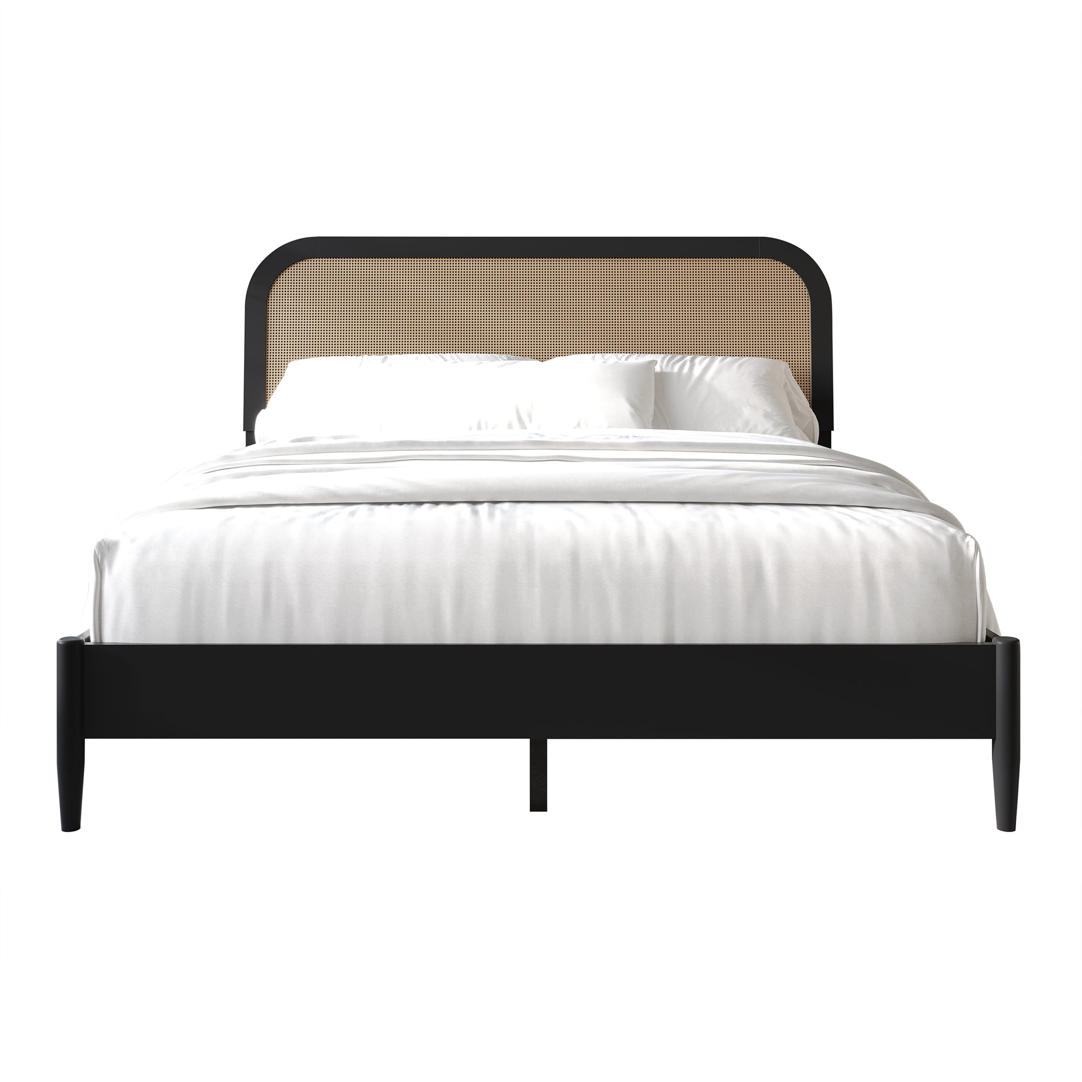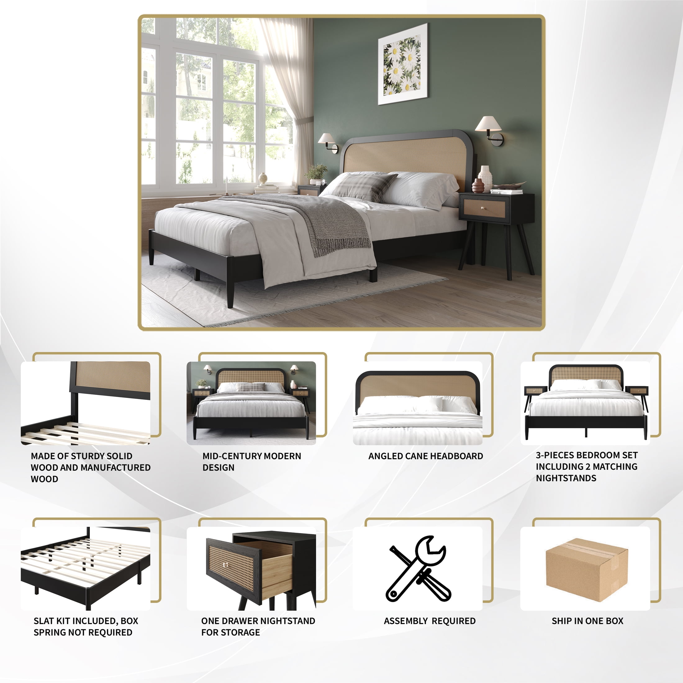 Set included 1 bed and 2 matching nightstands Bed and nightstand in black color with a coffee cane panel in the center for a sleek design The headboard with curved ends and a central coffee cane design exudes stylish elegance Made from solid rubberwood and MDF wood frame With four center support legs for Full/Queen sizes; Eight center support legs for King size Slat kit is included, box spring not required Available in Full, Queen, King sizes Easy assembly is required, and clear assembly instructions are provided Ship in one box