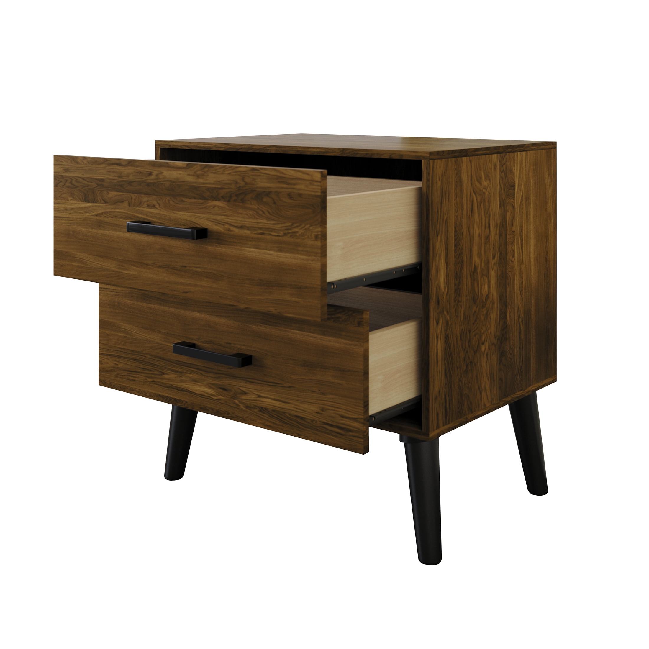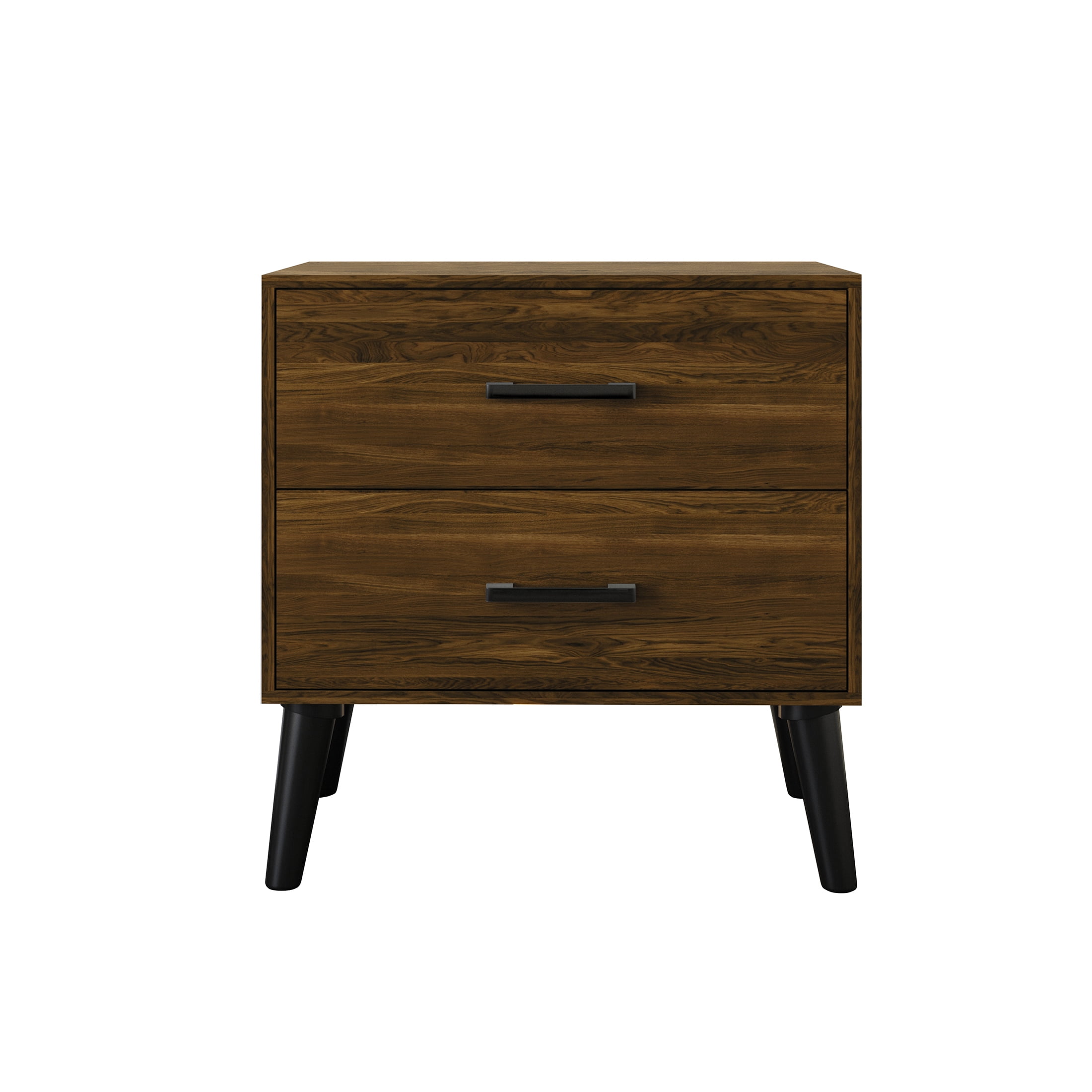 2-drawers with pre-assembly drawer metal slides Generously sized tabletop provides ample space for bedroom essentials, conveniently within arm’s reach. Enhanced by four elegantly tapered solid wood legs, ensuring both stability and long-lasting durability. Easy care and cleaning Available in Brown, Dark Grey and Light Grey. Ship in one box