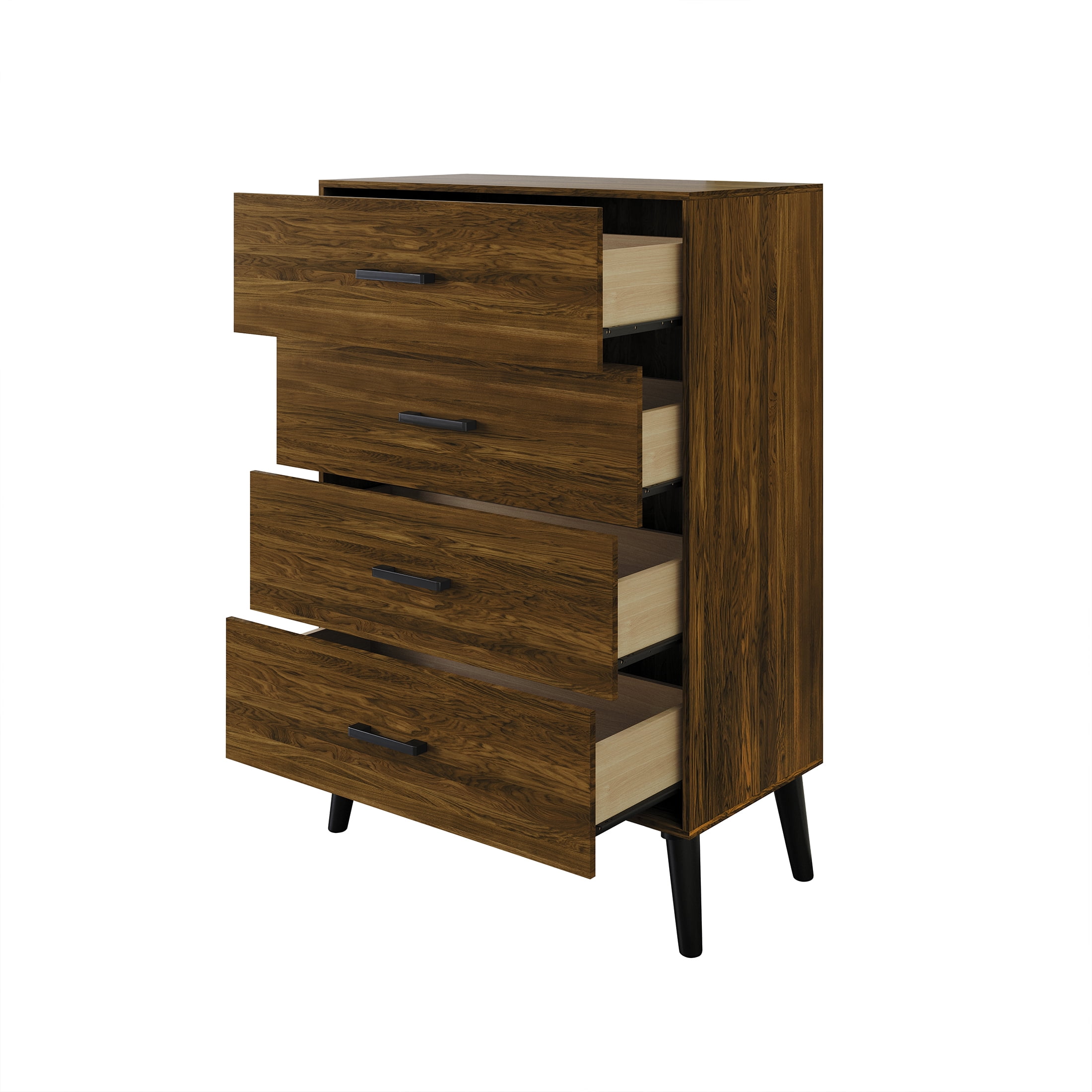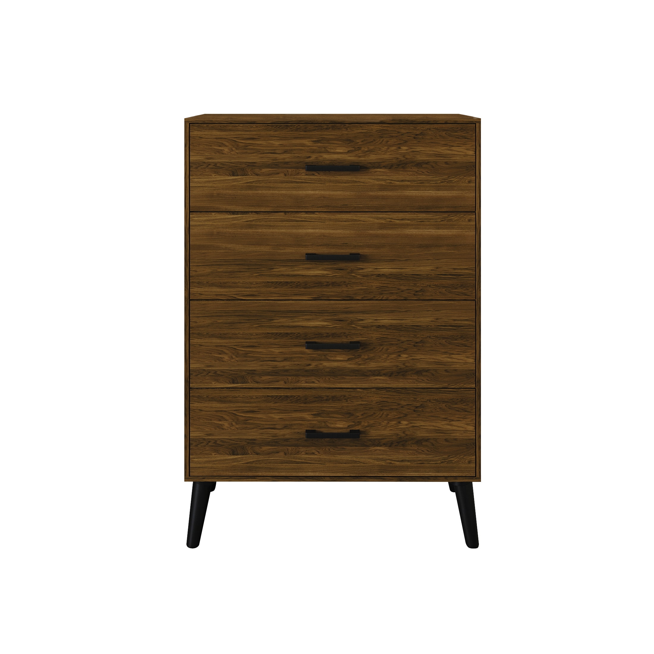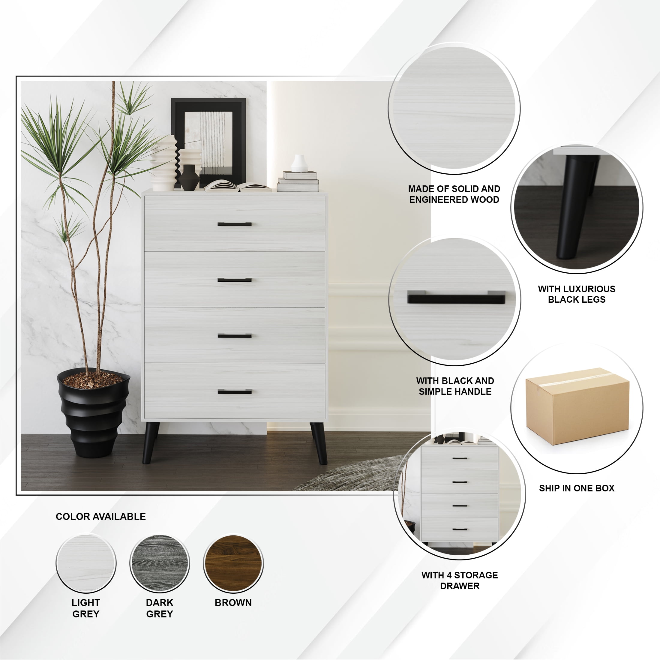 Featuring four tiers of wooden drawers equipped with pre-assembled metal slides. Enhanced by four elegantly tapered solid wood legs, ensuring both stability and long-lasting durability. Constructed from a combination of solid wood and engineered wood. Easy care and cleaning Available in Brown, Dark Grey and Light Grey. Ship in one box