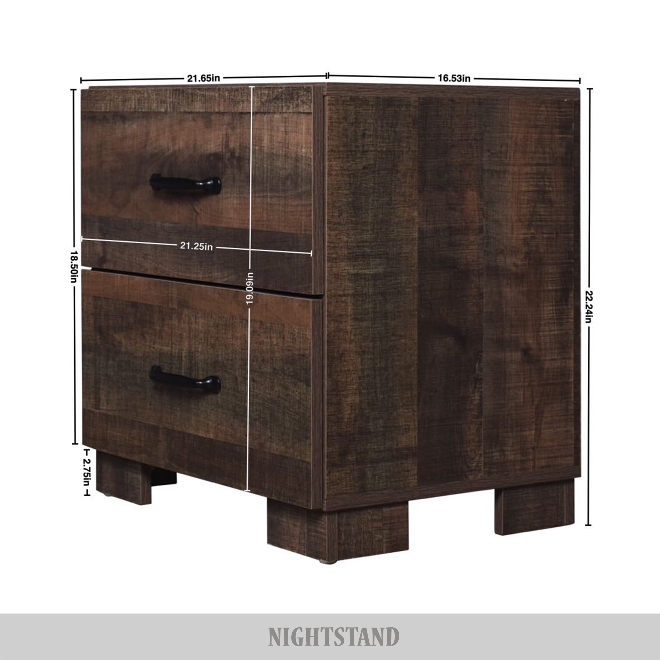 Dimensions: 21.67 x 16.55 x 22.26 Inches 2-drawers with pre-assembly drawer metal slides Material: Manufactured Wood Finish: Rustic Brown Oak Wipe Clean with Cloth Easy Assembly Required