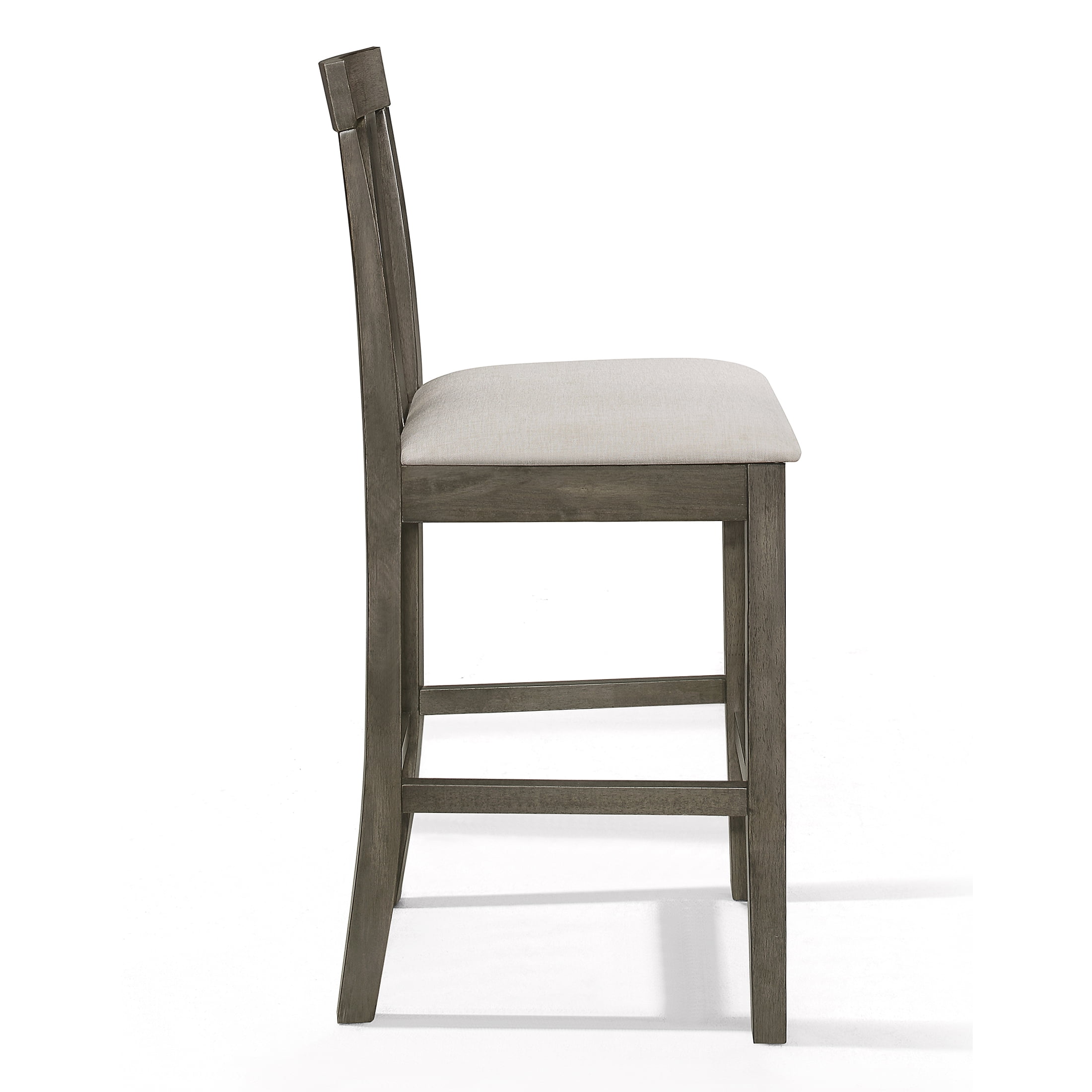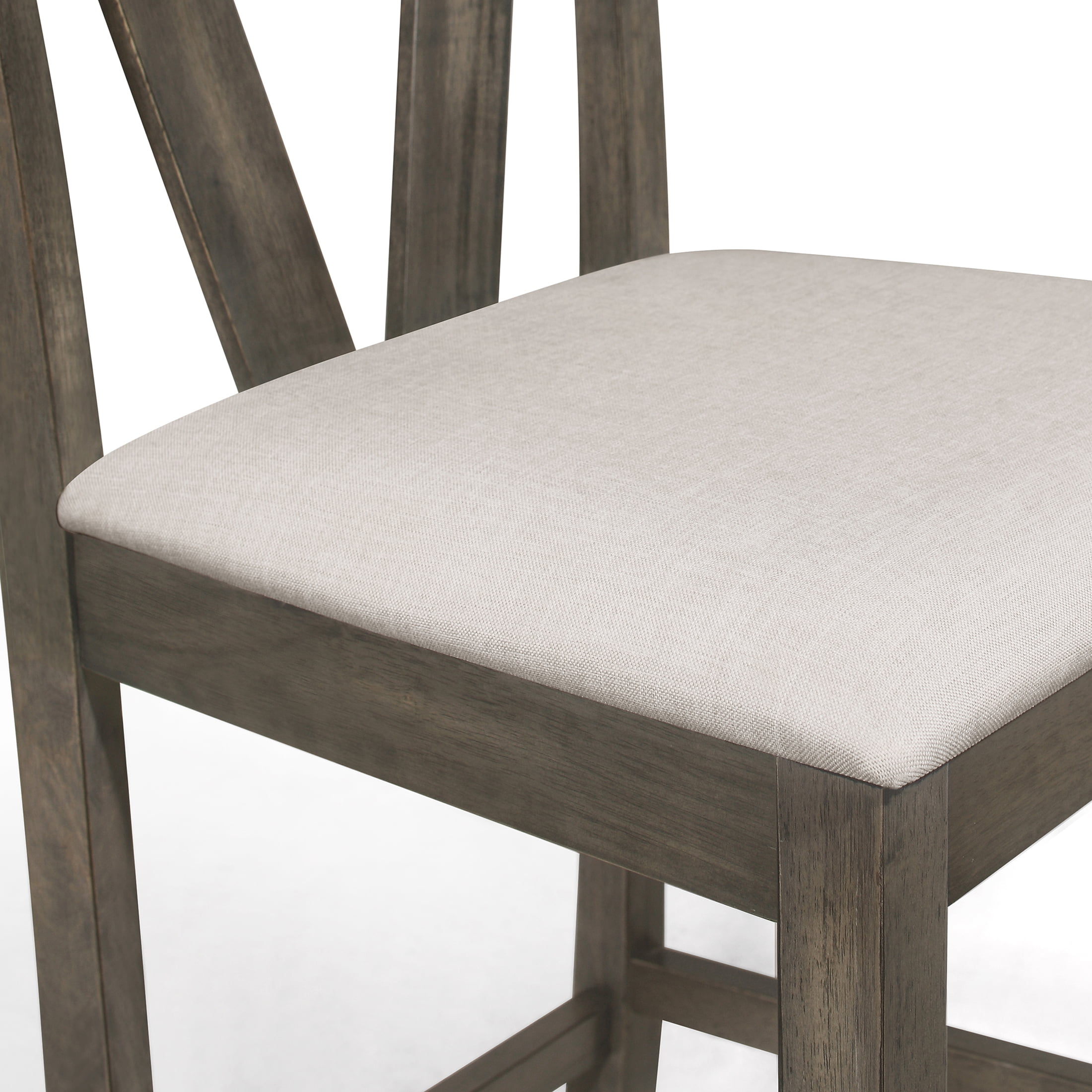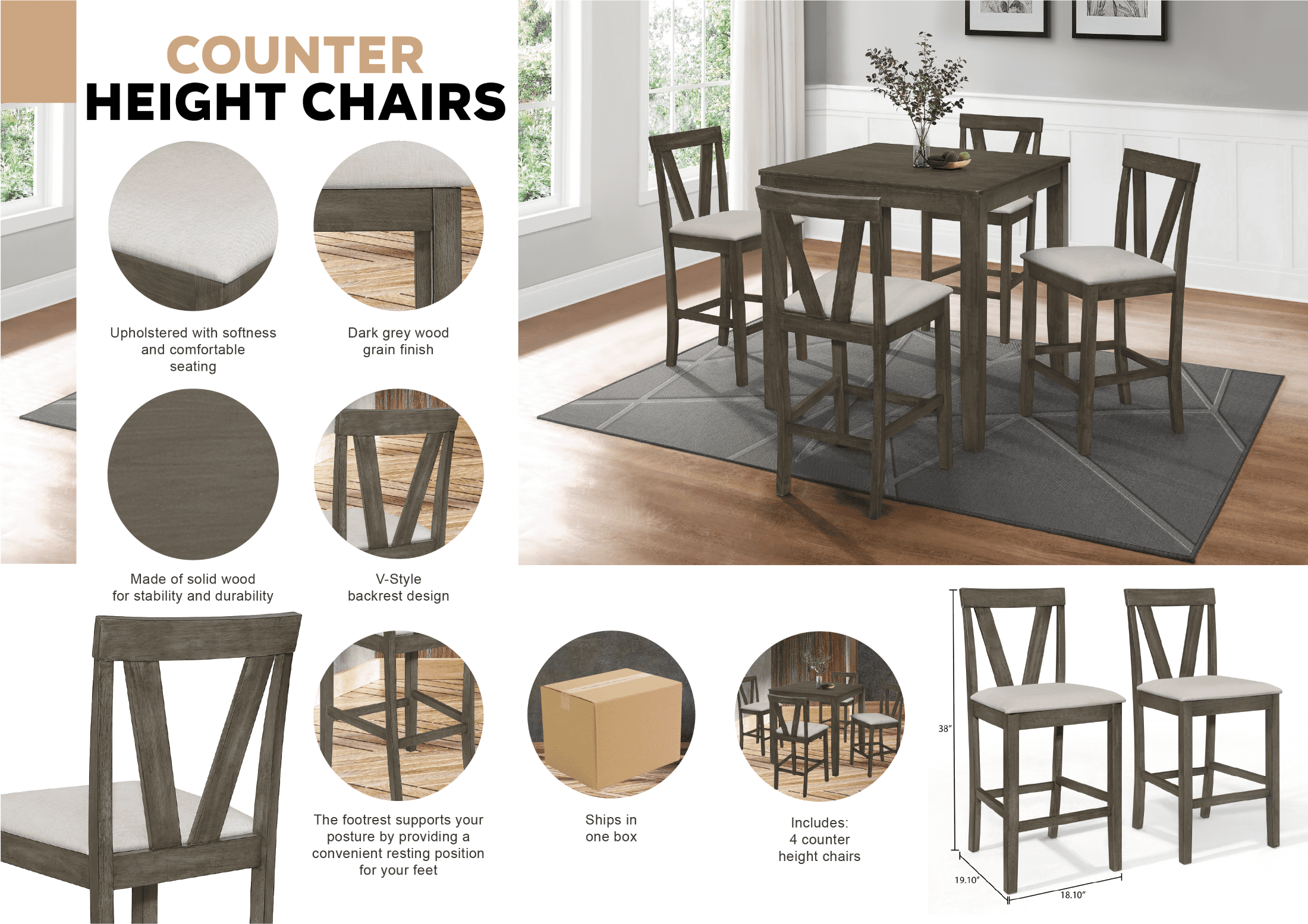 Includes: 4 counter height dining chairs Dining chair seats are upholstered in warm grey linen fabric for durability and padded with foam for comfortable seating V-shaped back chairs design The dining chairs are ergonomically designed for comfortable dining The footrest supports your posture by providing a convenient resting position for your feet Dark grey counter height dining table with warm grey upholstered linen seats gives your dining area an understated yet elegant look Available in Dark grey color Ships in one box