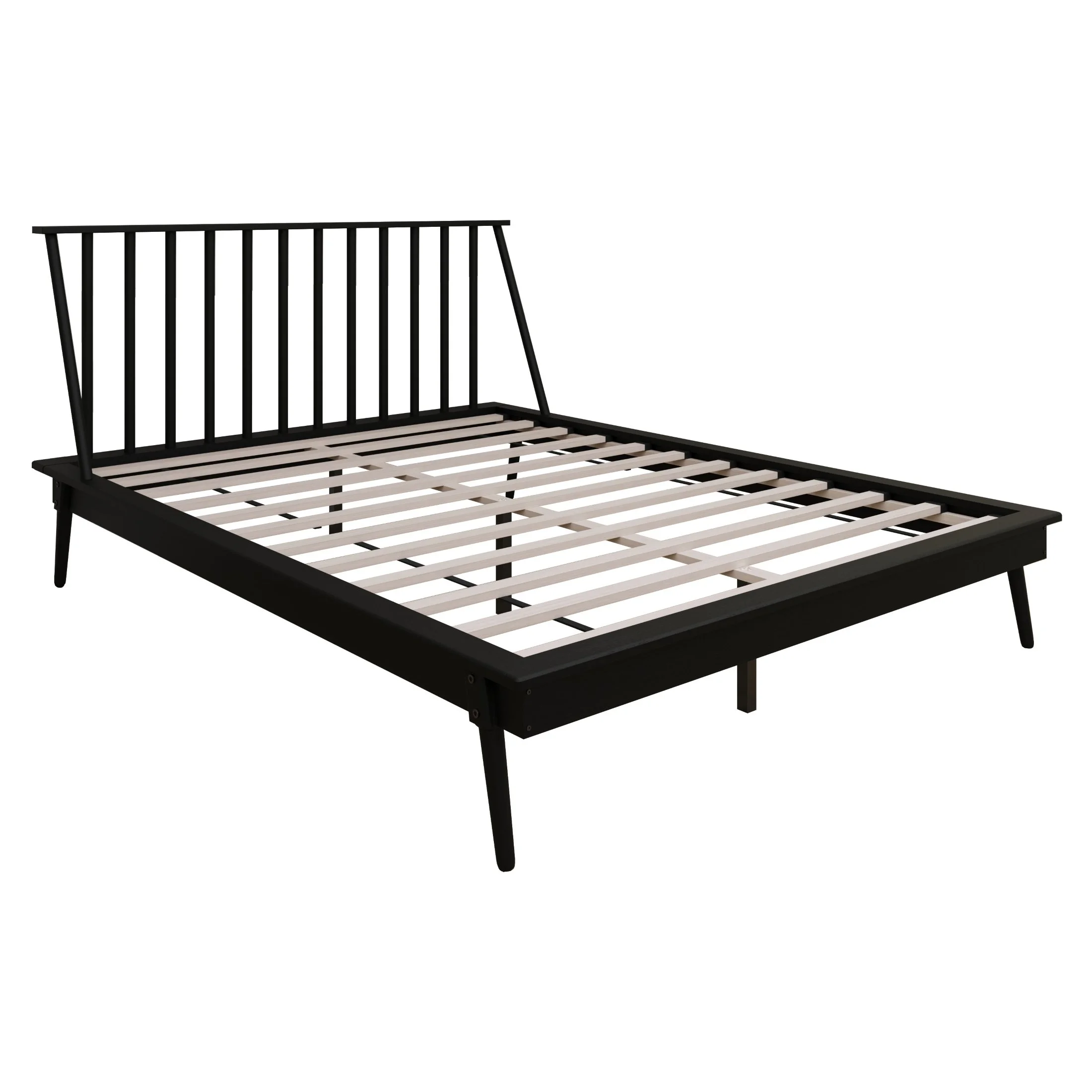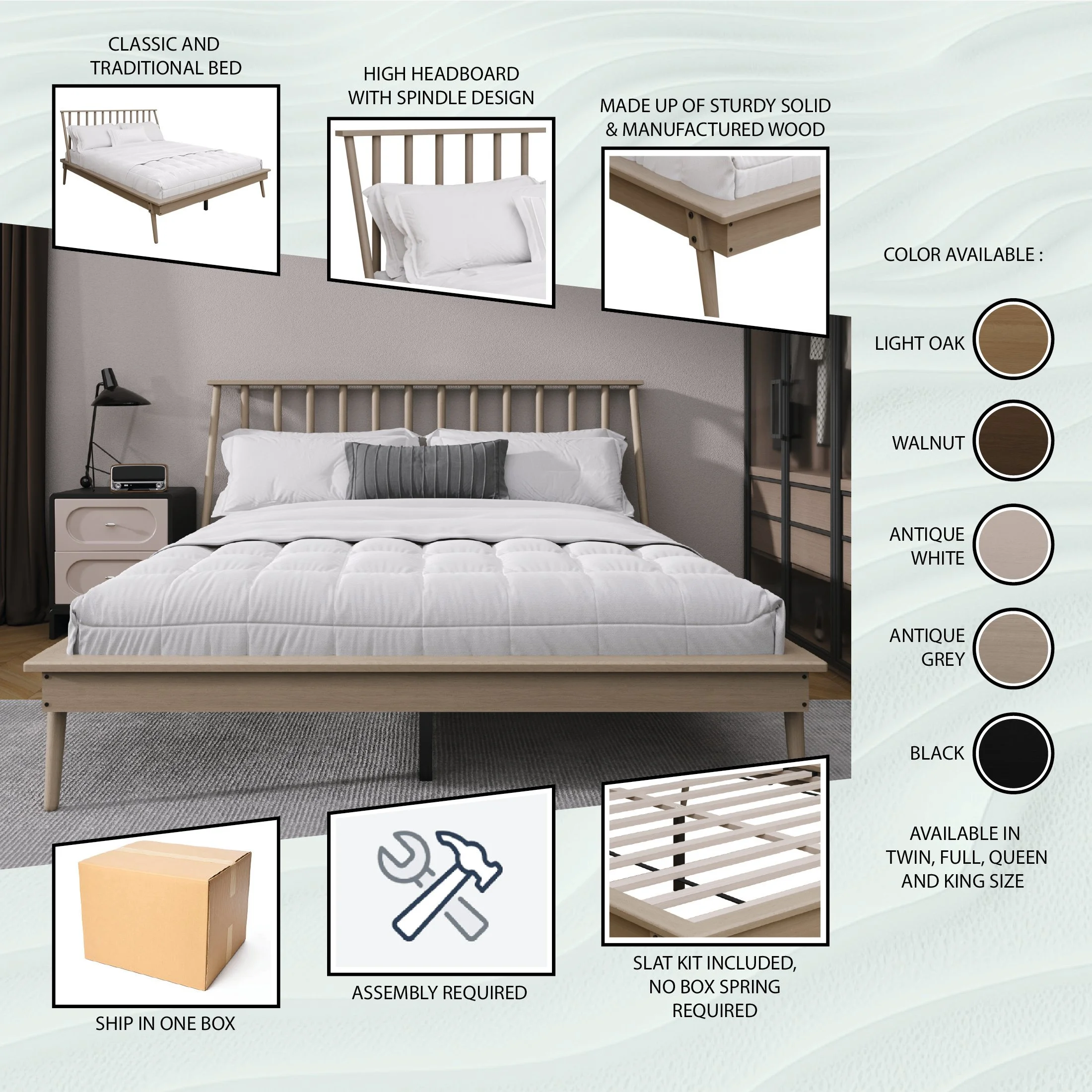 Featuring a high headboard with a spindle design brings a touch of elegance and timeless Crafted with sturdy solid wood and reliable manufactured wood for durability Slat kit included eliminates the necessity for a box spring Available in various colors: Black, White, Antique Grey, Walnut, Light Oak Choose the perfect size fit for your space: Twin, Full, Queen, King size Easy cleaning and convenient maintenance with the ample space underneath With a recommended mattress thickness of 8 to 12 inches Ship in one box Easy assembly Age Group: Suitable for adults