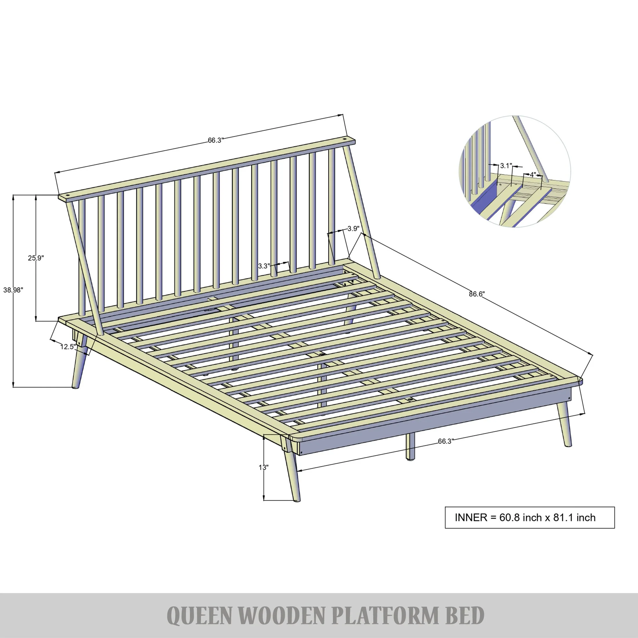 Revitalize your space with our vintage-inspired wooden bed, designed for suitable adults seeking timeless charm and elegance. The high headboard, featuring a classic spindle design, adds enduring grace to your decor. Crafted from sturdy solid and manufactured wood, this bed ensures long-lasting durability. The included slat kit eliminates the need for a box spring, simplifying setup. Available in Twin, Full, Queen, and King sizes, it offers ample under-bed space for easy cleaning. With a recommended mattress thickness of 8 to 12 inches, it ships in one box for convenient, hassle-free assembly. Twin: 76.04″L x 44.92″W x 39.40″H; Weight Capacity: 300lbs Full: 76.04″L x 59.89″W x 39.40″H; Weight Capacity: 400lbs Queen: 80.97″L x 66.19″W x 39.40″H; Weight Capacity: 500lbs King: 80.97″L x 81.95″W x 39.40″H; Weight Capacity: 600lbs