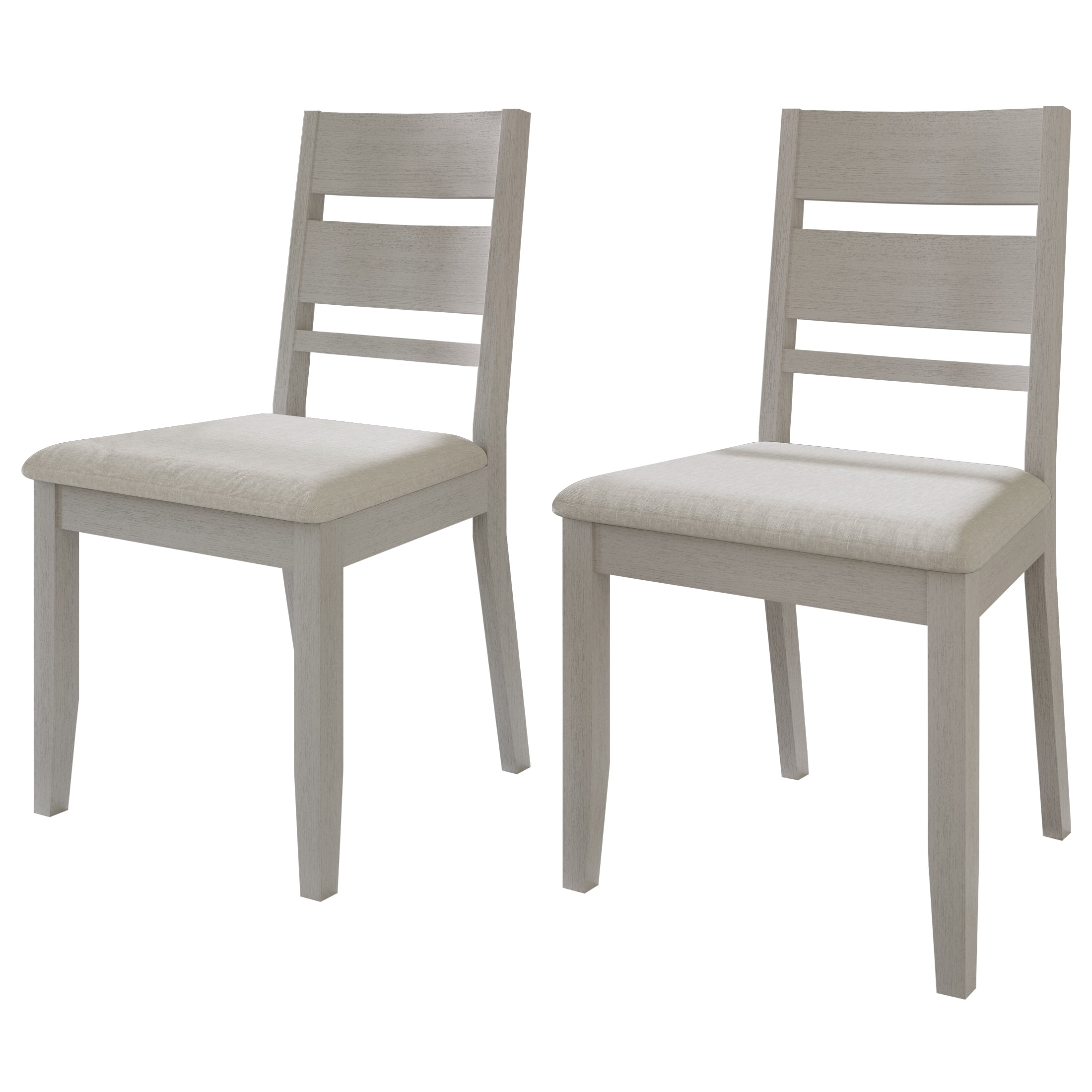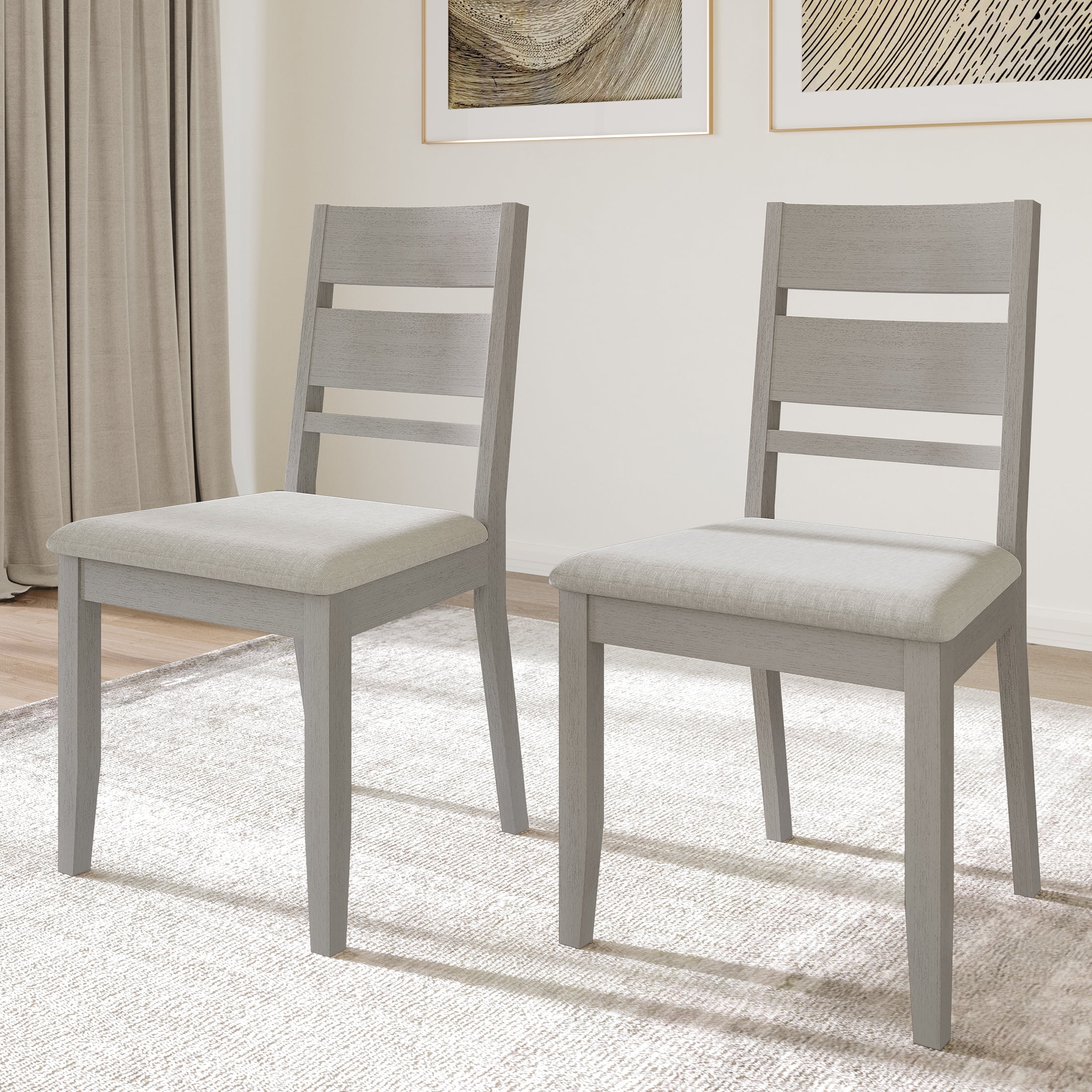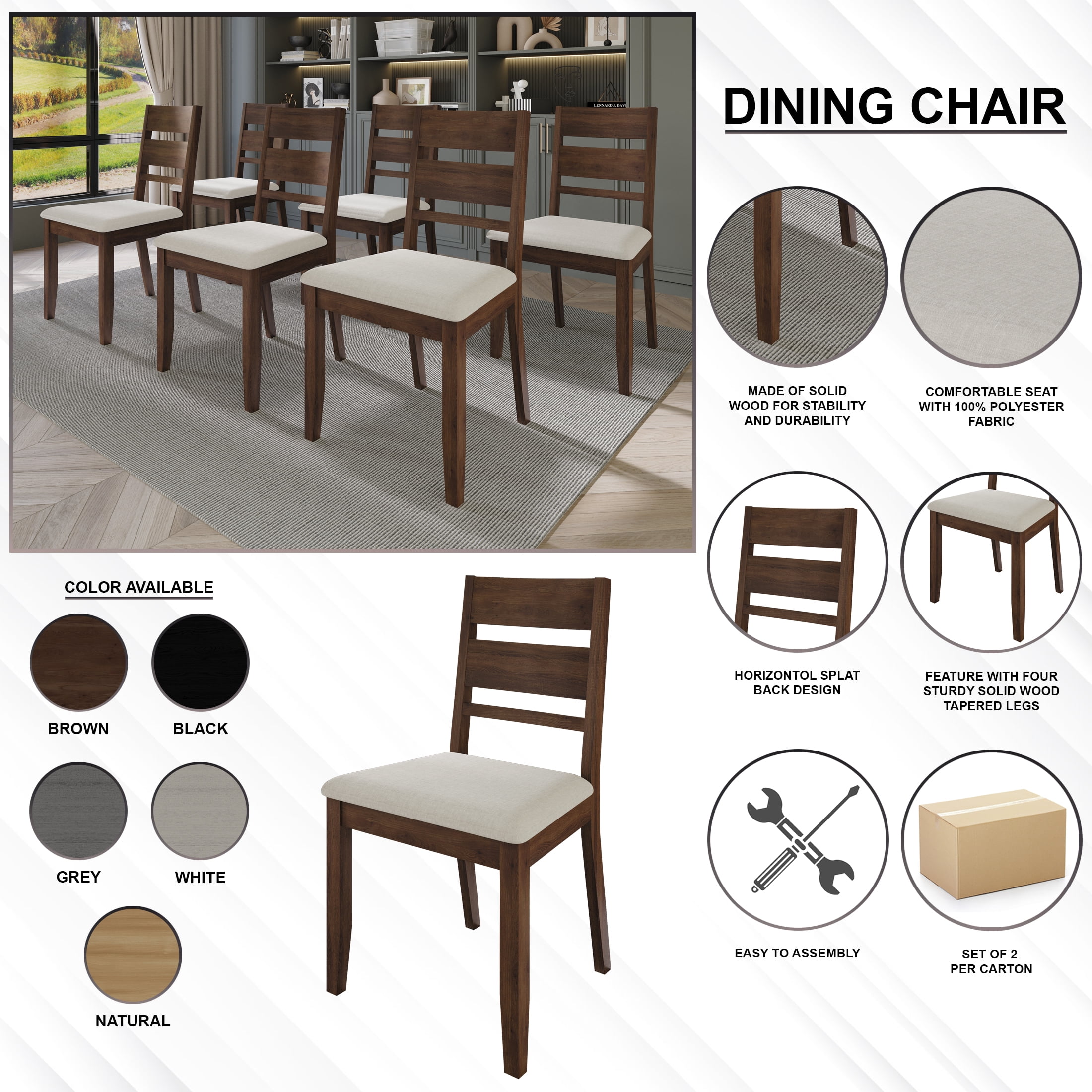 Features minimalist and elegant horizontal splat back design Crafted from sturdy wood to guarantee both stability and enduring durability Seat upholstered with 100% polyester linen fabric and high-density foam for excellent sitting experience Available in multiple finishing colors: Brown, Natural Oak, Black, White and Grey Supported by four sturdy, tapered solid wood legs to guarantee stability Assembly is straightforward and hassle-free. Set of 2 per carton