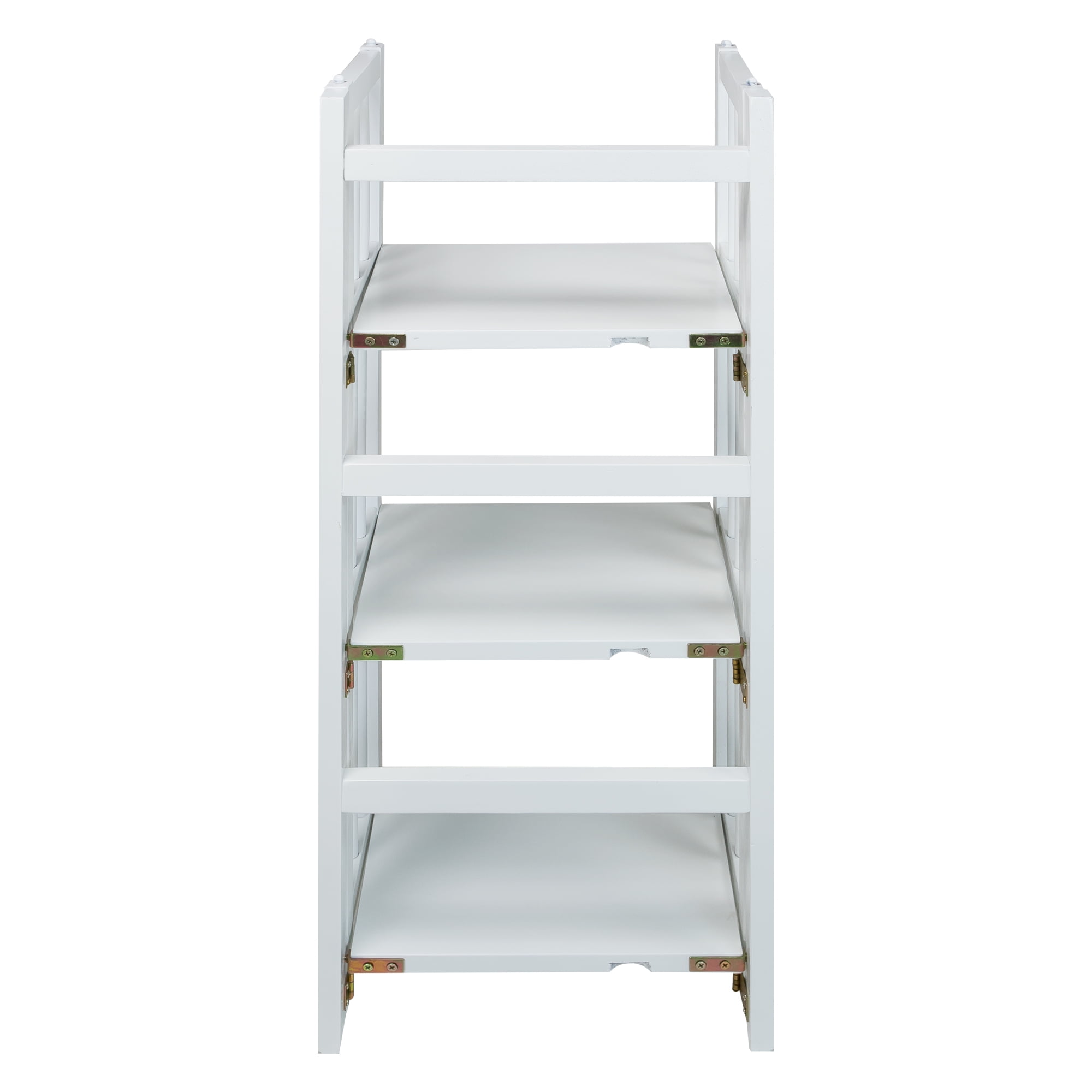 Durable, attractive, and ideal for apartments, dorm rooms, and bedrooms Wood construction is built to last a long time Foldable design makes transporting and moving around easy 3 shelves with a weight capacity of 25 pounds each create plenty of room for decorations, books, and other items Rich finish adds a durable seal to increase longevity 4 legs provide balanced support Material: Wood Color: White Dimensions (W x D x H) 14 x 11.5 x 38 inches Weight: 10 pounds
