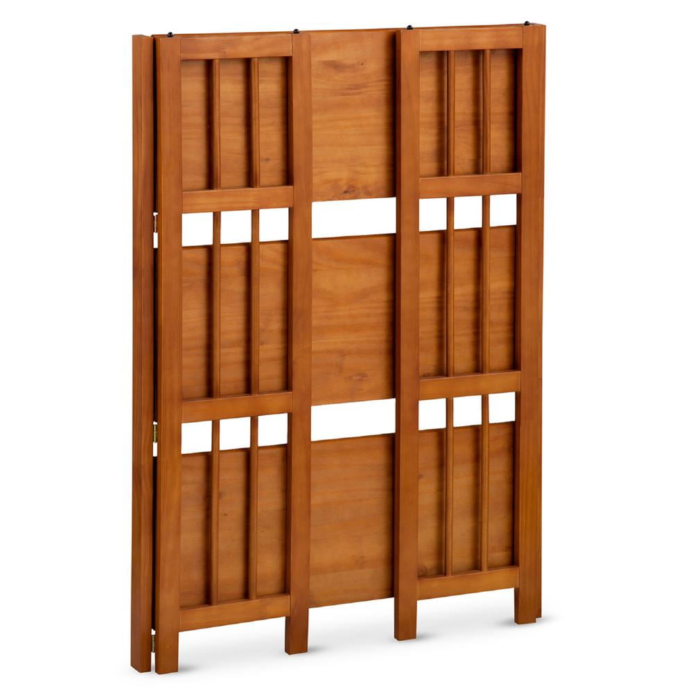 Stack up to 2 units high. Foldable design makes for effortless storage, transport, or rearrangement. 3 sturdy 27. 5″- wide shelves support your belongings. Chestnut finish accentuates your decor. Solid wood construction for increased durability and longevity. No assembly required.