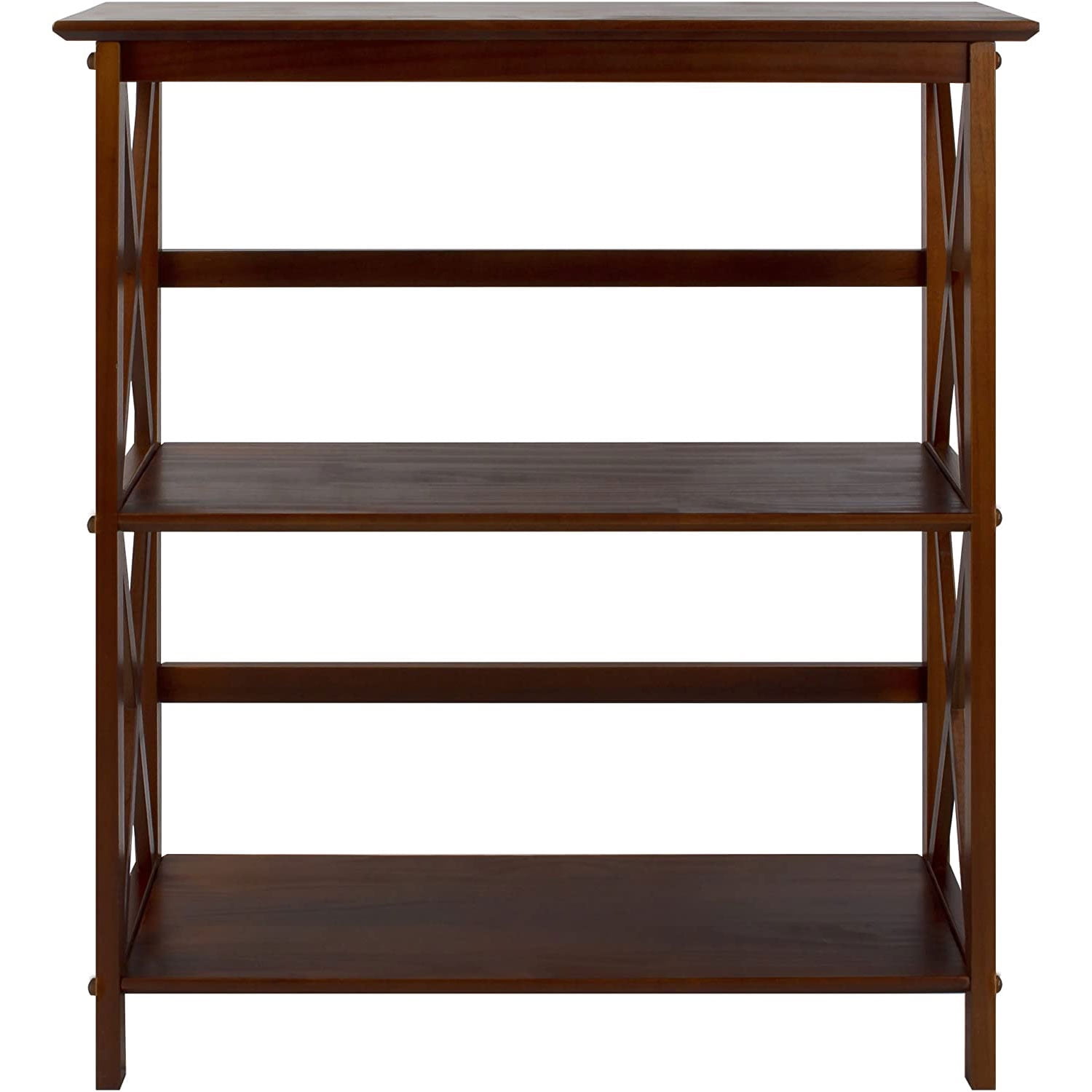 This simple contemporary wooden Montego X-Design Style Bookcase by Casual Home is perfect for any bedroom, dorm room, or home office. The 3 shelves will provide plenty of storage space for any room with each shelf being abe to hold 25 pounds each. With the dark wood finish, this is a strong modern-looking bookshelf for any home storage or decor. With the contemporary x-design styling on the sides of the bookcase, this piece has a chic, airy look that prevents books or decor from falling. The 4 durable legs provide balance and support for your belongings. The rich wood finishes accentuate your lighter decor in any style of room in your home or office. The solid wood construction has increased durability and will last for many years to come. Assemble hassle-free with the lightweight and easy to assemble design making it easy to move from room to room if needed. Casual Home has created furniture with consumer-centric design and lasting materials for families and homes of all sizes so add their lastest Montego X-Design Style Walnut Bookcase to your home.