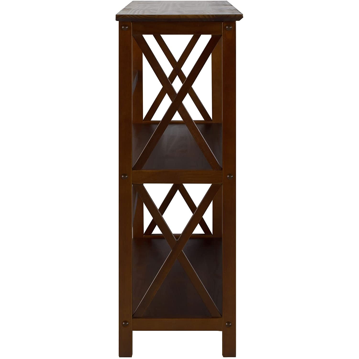 Solid wood construction for increased durability for years to come 3 shelves will provide plenty of storage space for any occasion Each shelf can hold up to 25 pounds of books, decor, and more Darker wood finish allows for a strong modern-looking bookshelf for any home storage or decor Contemporary x-design styling on the sides of the bookcase that prevents books or decor from falling 4 bottom durable legs that provide balance and support for your belonging Lightweight and easy to assemble design making it easy to move from room to room Material: Wood Color: Brown Dimensions (L x W x H): 11.75 x 29.50 x 34 inches Weight: 20 pounds