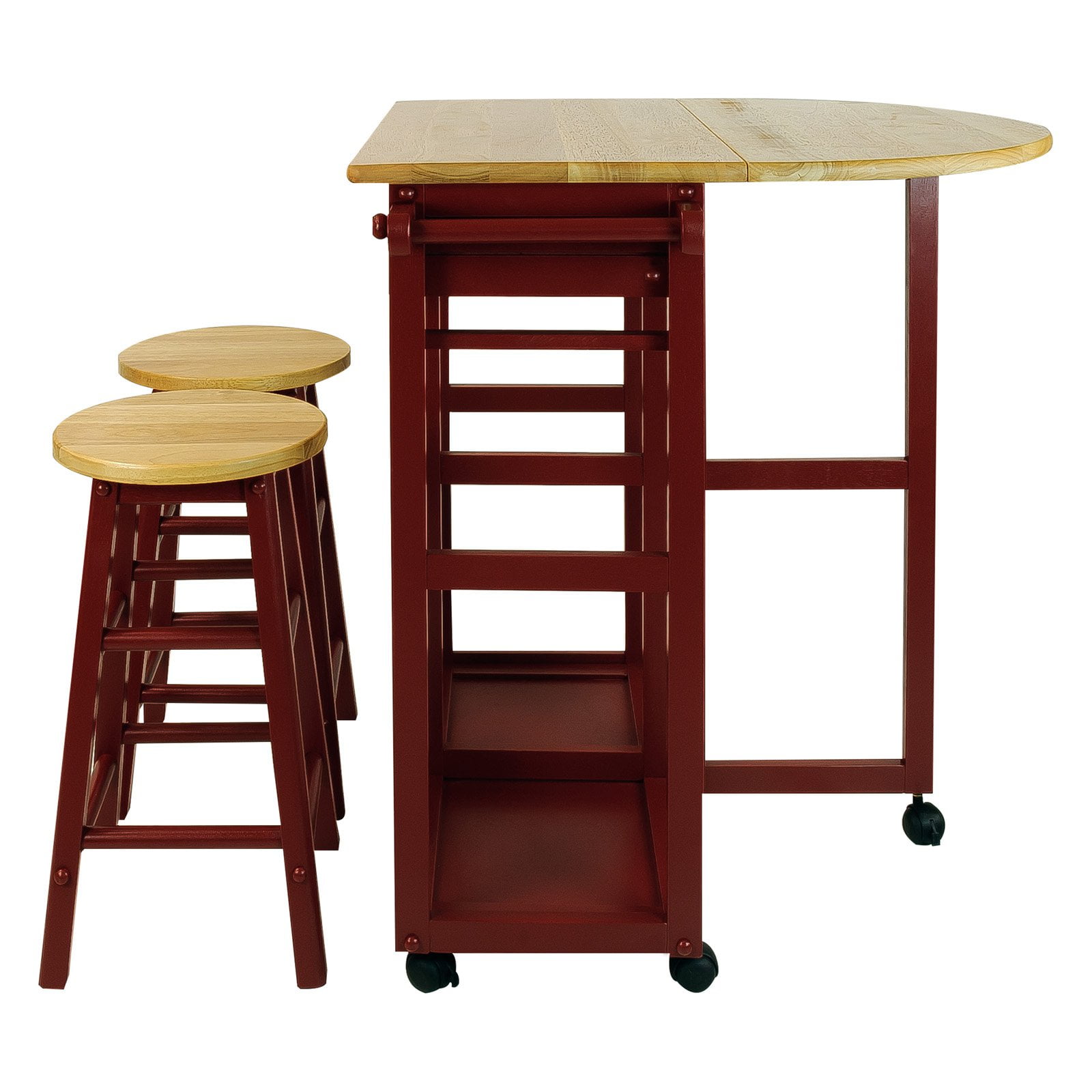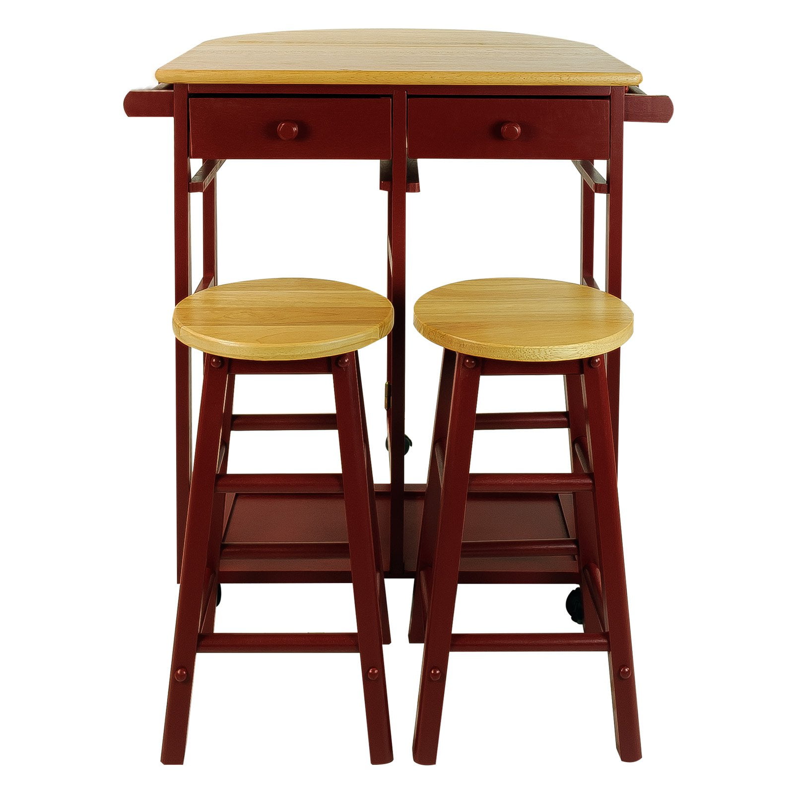 Color: Natural&white Set includes a Table and two Stools. Integrated stool nesting storage design 2 towel racks serve as a convenient place to hang your towels. Lockable wheels provide Mobility and Stability Features a space-saving design with Drop-leaf table top 2 pull-out drawers and matching stools Rolling casters and towel bars Solid wood construction for increased durability and longevity. Light and easy assembly