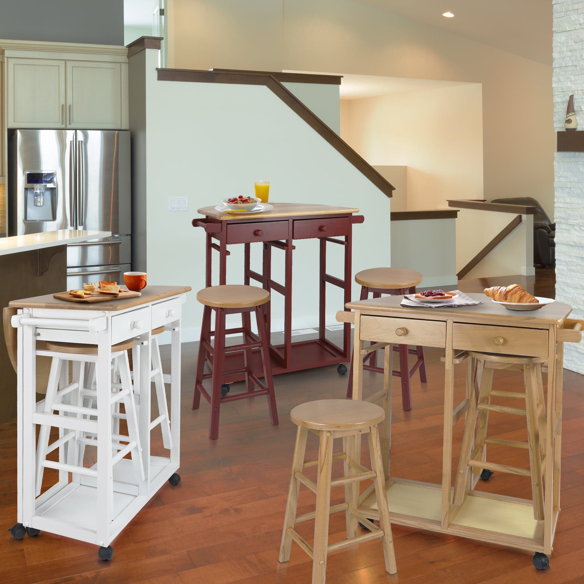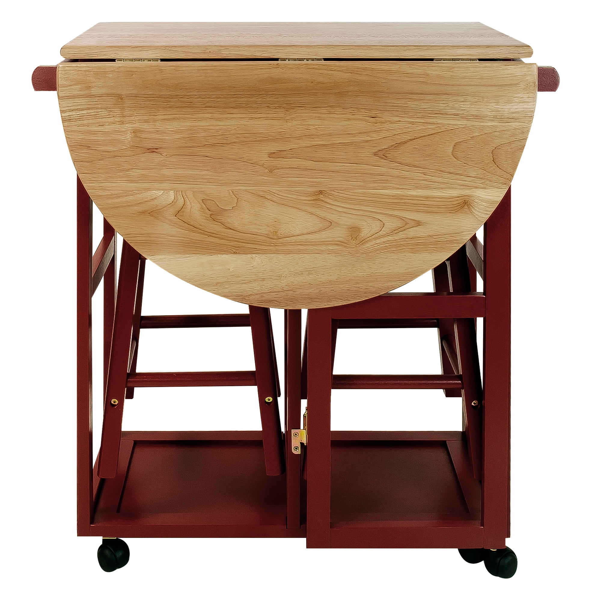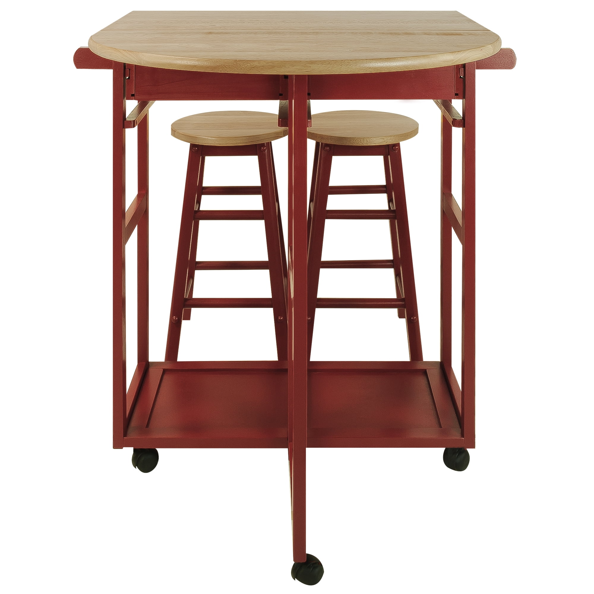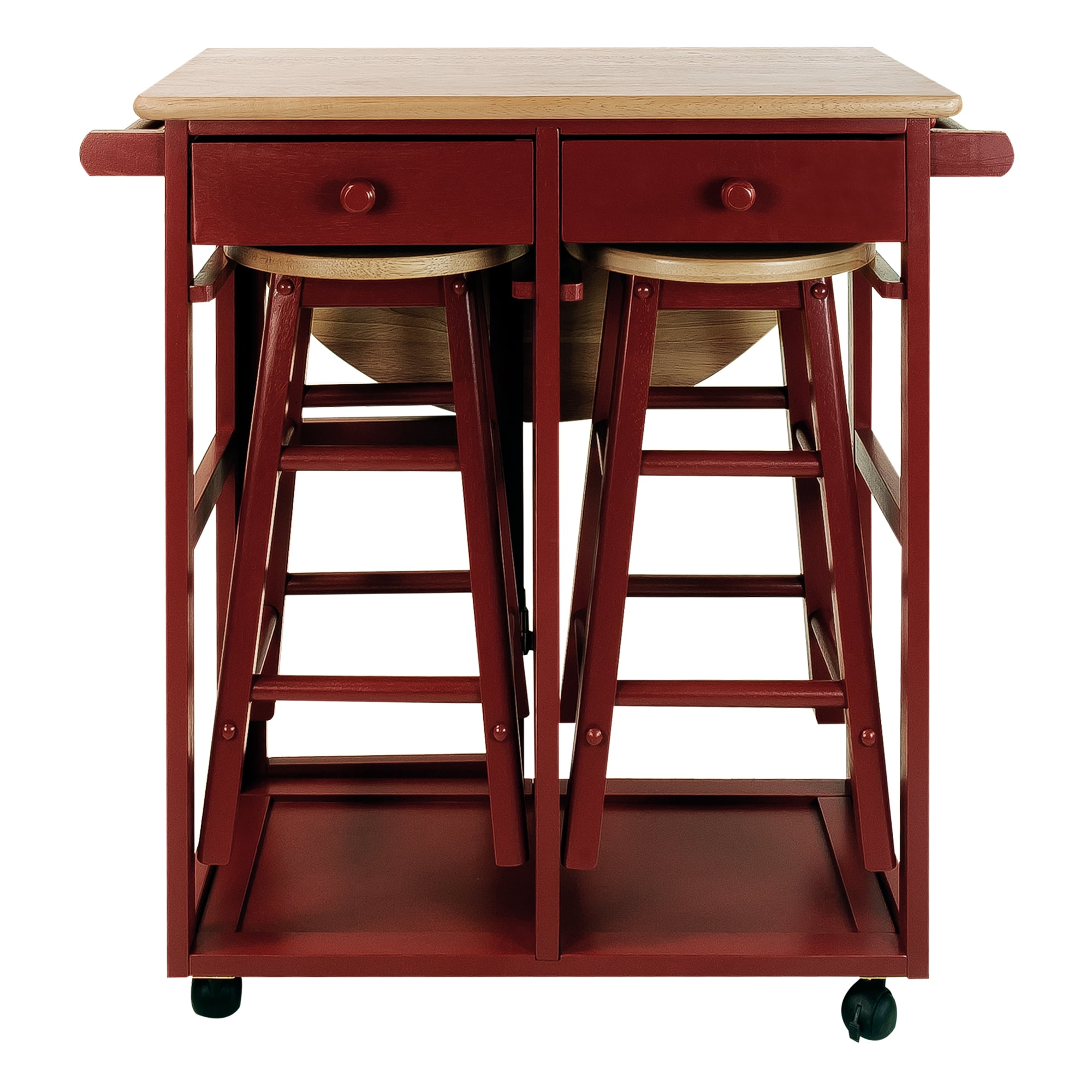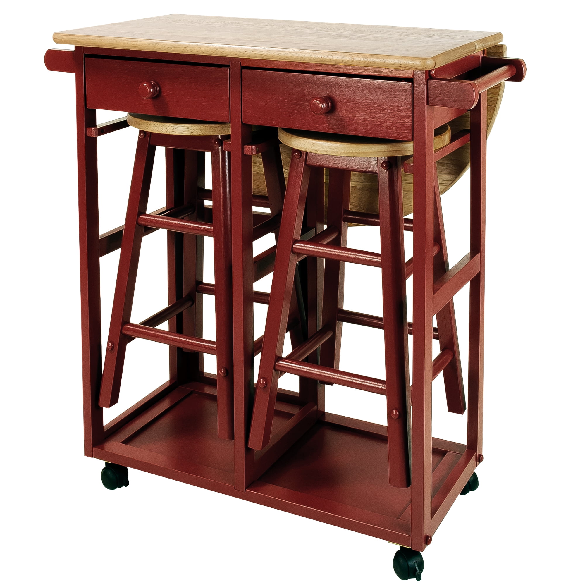 Make breakfast time convenient with this stylish cart that you can easily place anywhere Composed of complete solid hardwood with a space-saving design Drop-leaf table top saves extra space 2 drawers let you conveniently store your placemats, silverware, utensils, or other items 2 towel bars allow you to display a decorative or cleaning towel from the breakfast cart 2 included solid wood stools complete this versatile set Specifications: Table-top thickness: 0.75 inches Top maximum weight: 100 pounds Drop-leaf maximum weight: 22 pounds Drawer maximum weight: 5 pounds Stool maximum weight: 250 pounds Material: Hardwood maple, beech Color: Red Table dimensions (W x D x H): 29.75 x 32 x 33 inches Stool dimensions (W x D x H): 11.5 x 11.5 x 21 Weight: 40 pounds