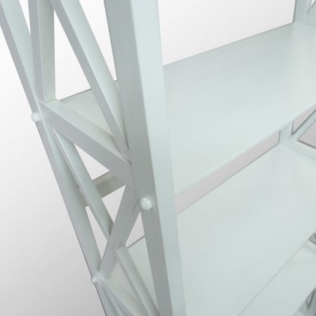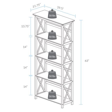 Five (5) spacious shelves provide all the storage space you need Dimensions: 63 inches high x 29.50 inches wide x 11.75 inches deep- Weight Item Weight: 33.5 pounds Product Dimensions (L x W x H): 11.75″ x 29.50″ x 63.00″ Size: 5-Shelf Color: White Contemporary x-design styling gives this piece a chic airy look that prevents books from falling Four (4) durable legs provide balanced support for your belongings Solid wood construction for increased durability and longevity with light and easy assembly Light and easy assembly.