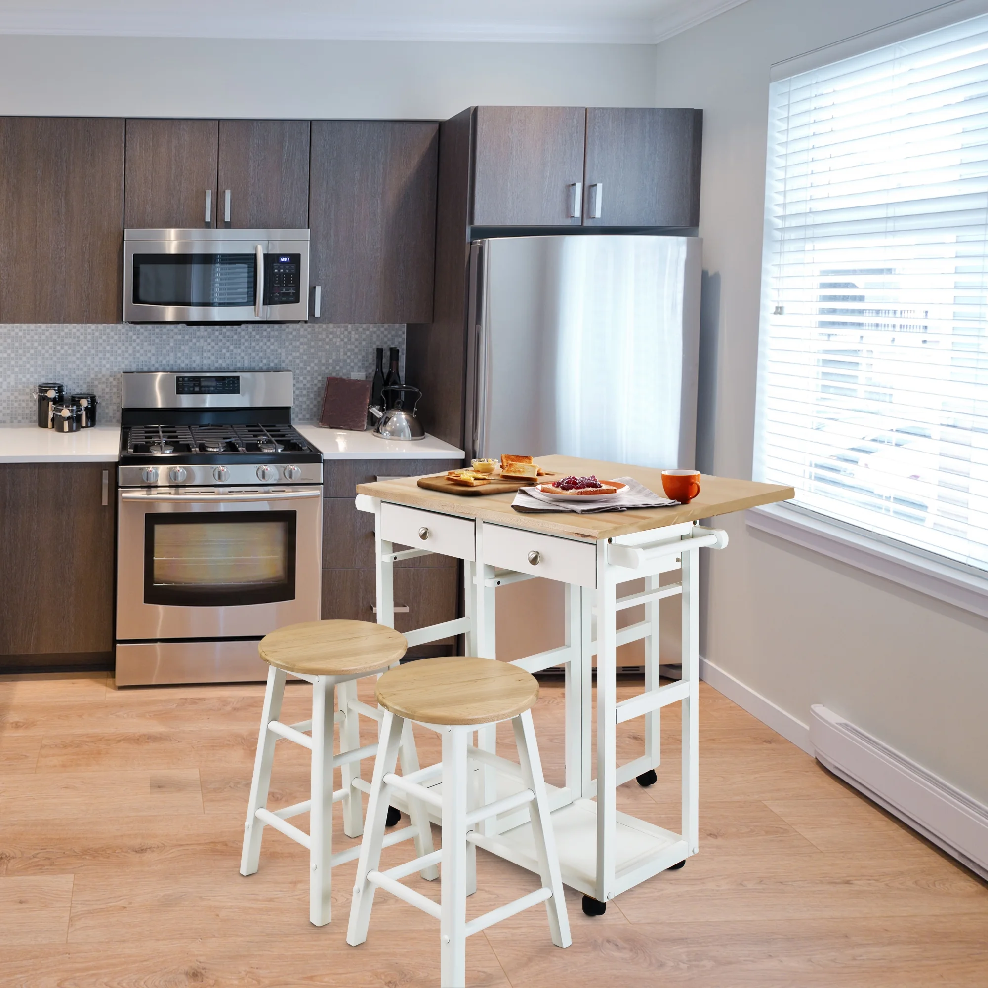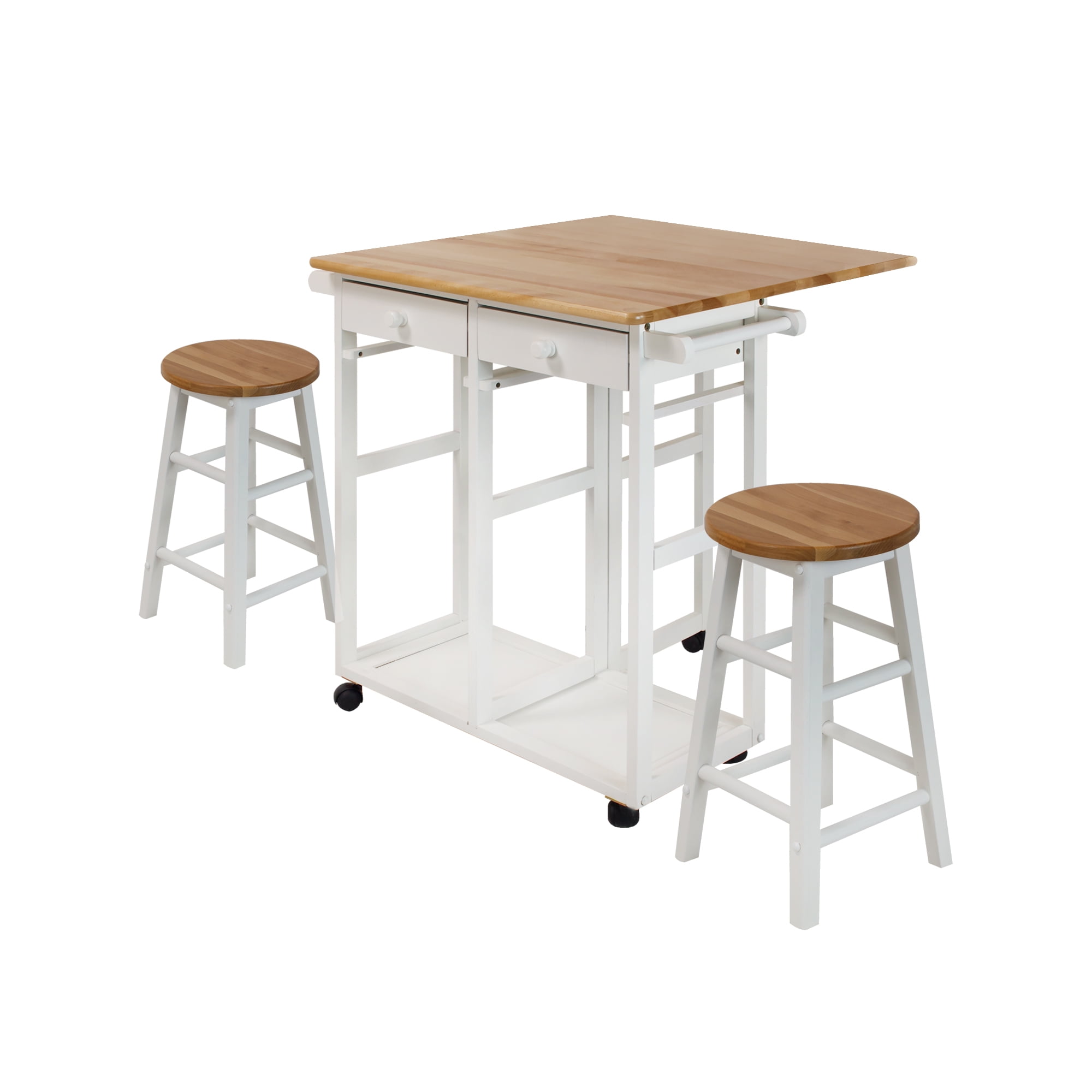 Casual Home New Folding Square 3-Piece Space Saving Dining Table Rolling Cart with Drawer and Two Stools, Two-Tone Finish (Natural White)