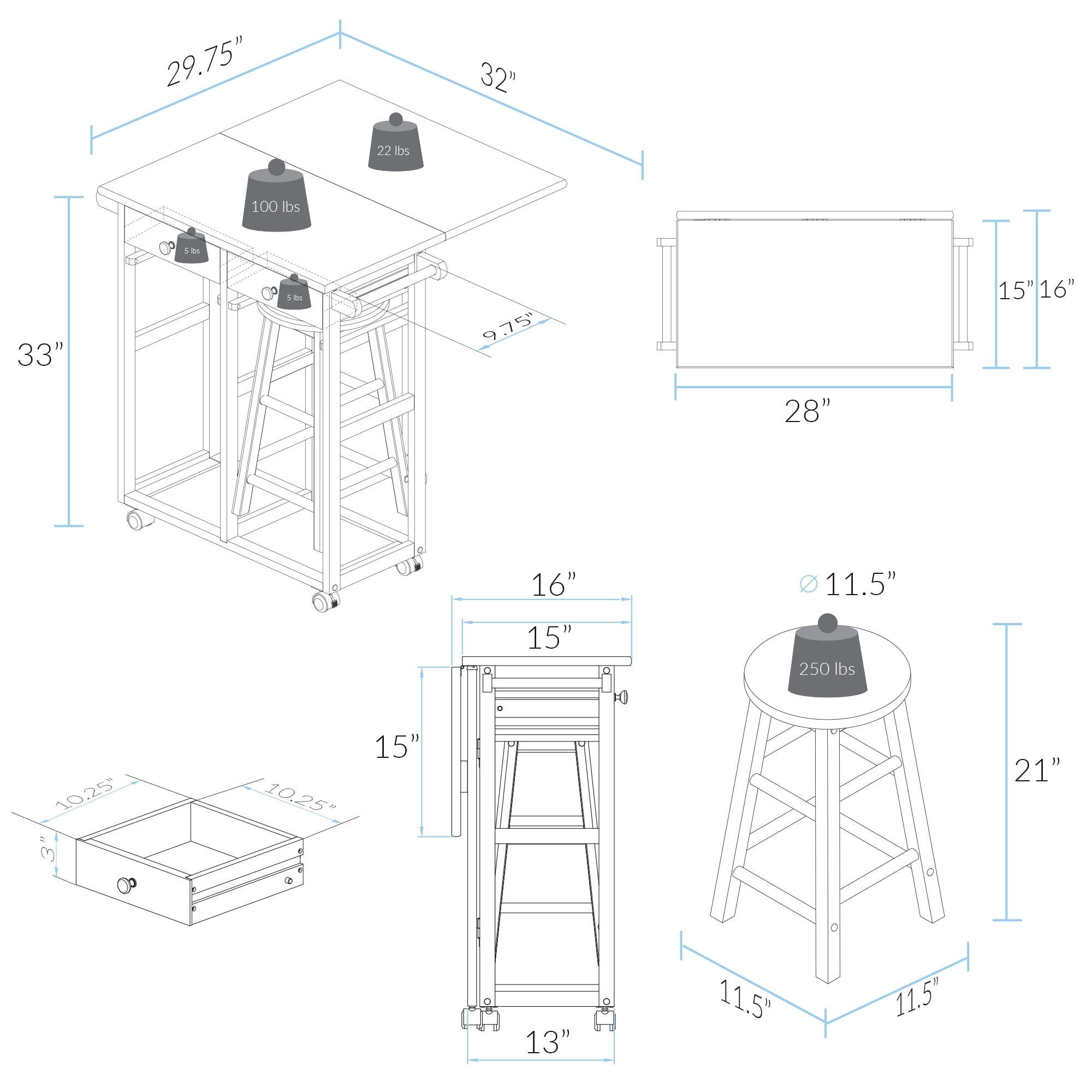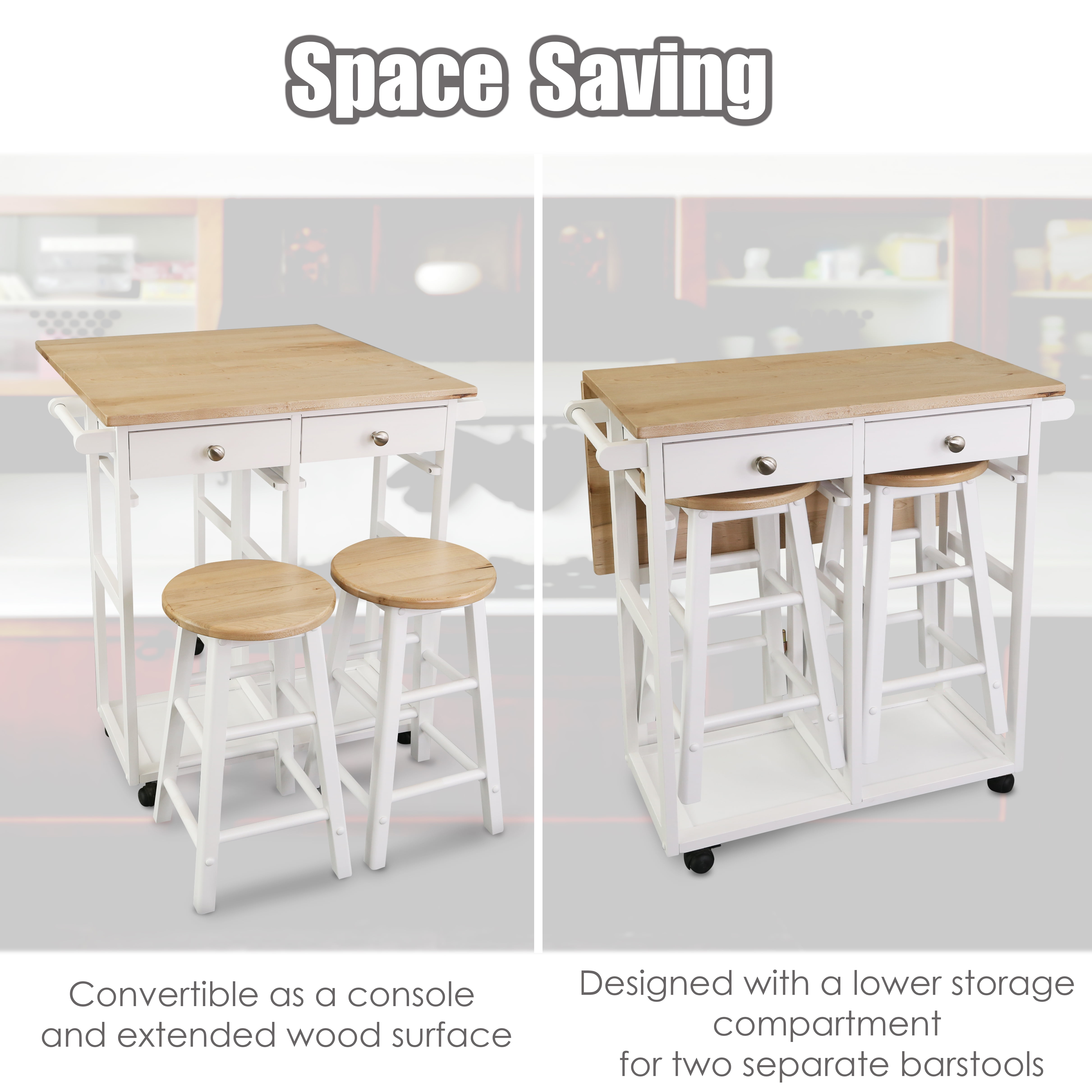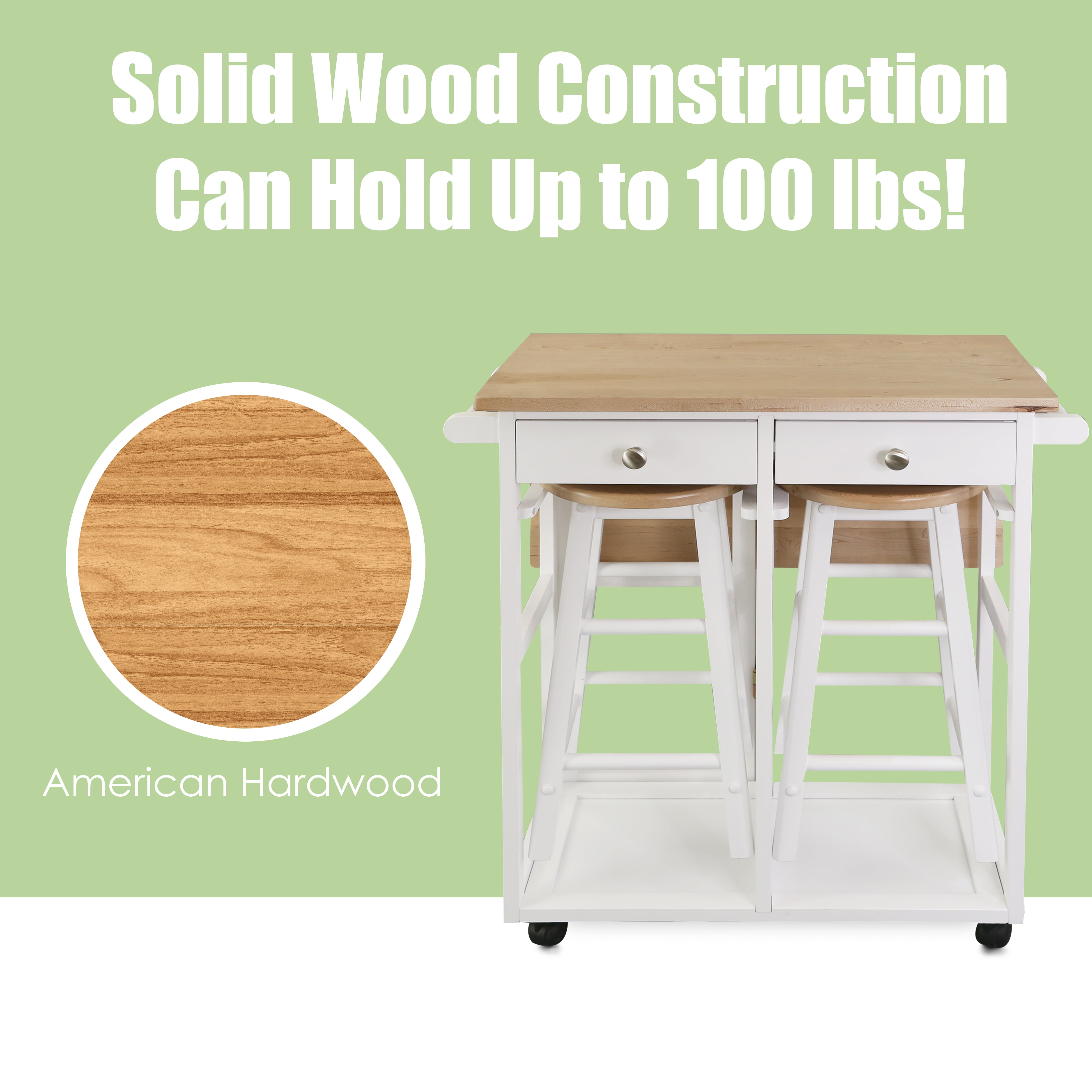 This Folding Square 3-Piece Space Saving Dining Table Rolling Cart comes with two separate barstools made with a strong American maple top. This product includes two drawers, two towel handles, and a barstool storage compartment. The well-crafted square-shaped top was designed to maintain a balance of proportion, making this product even more stable! It’s a versatile space-saving solution for any kitchen. Whether using it as a breakfast nook, mini bar, or a cozy dining area; it’ll provide a happy and satisfied atmosphere.
