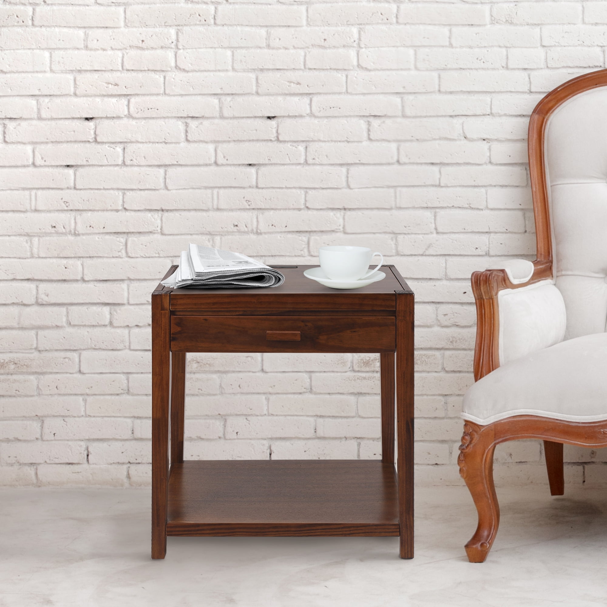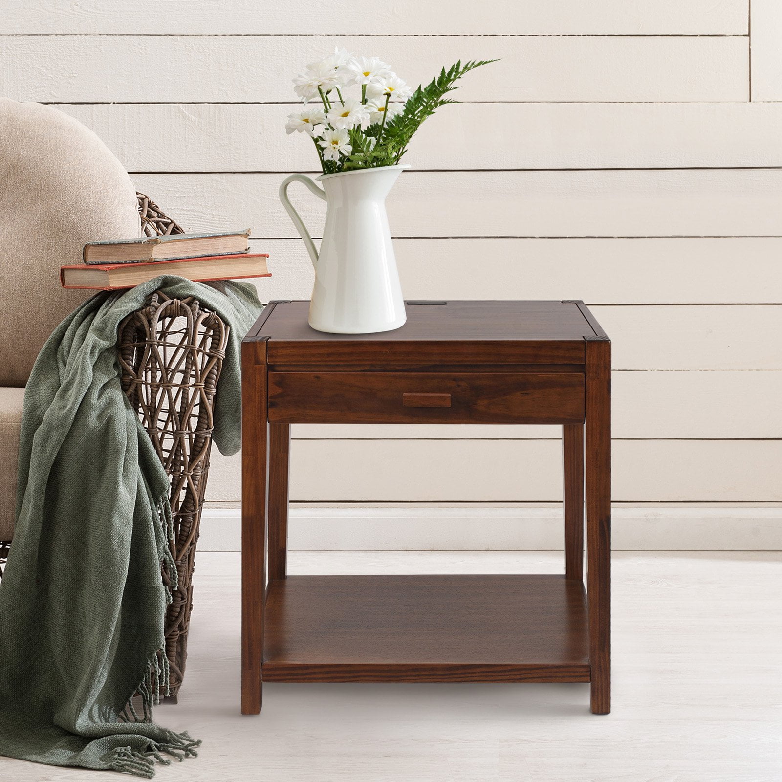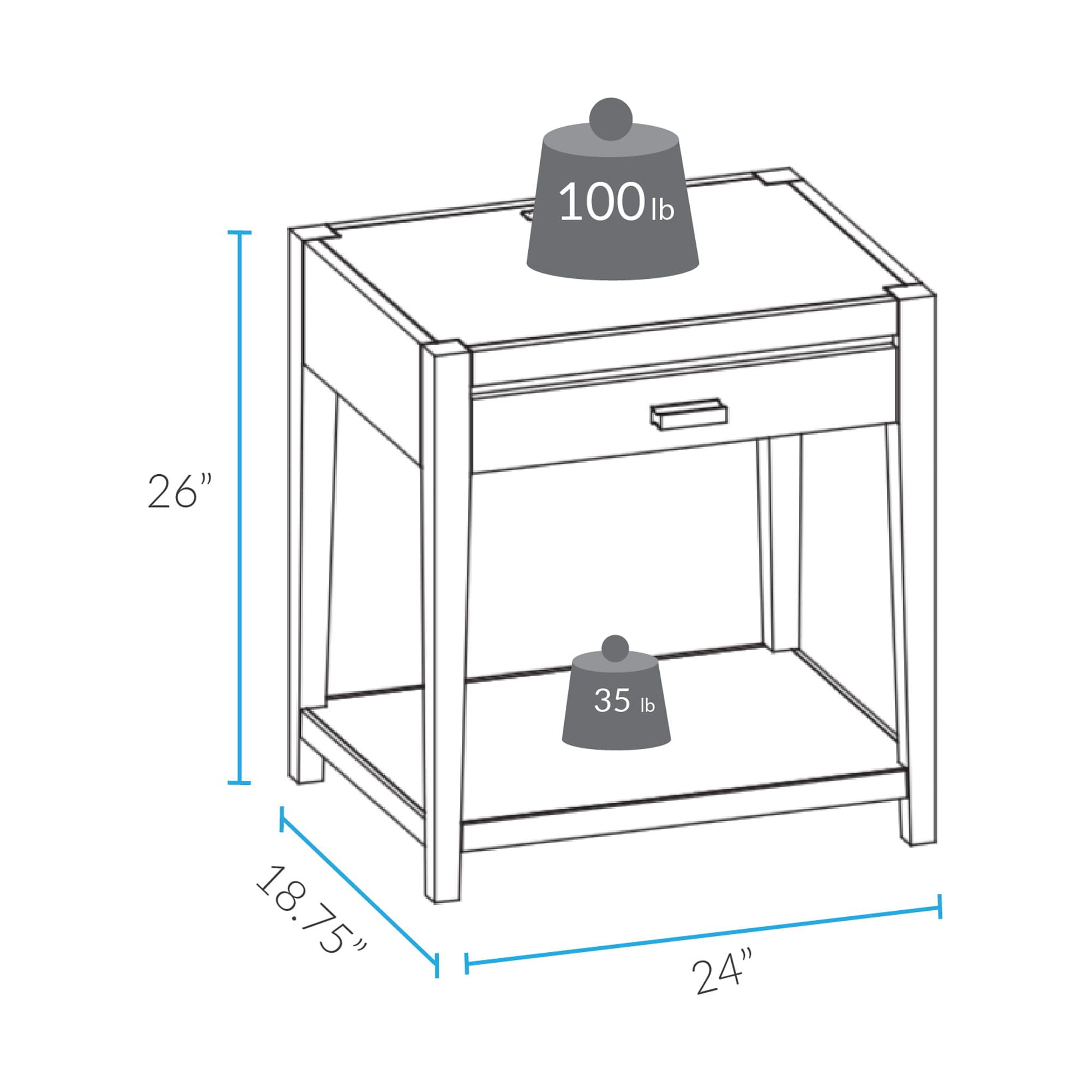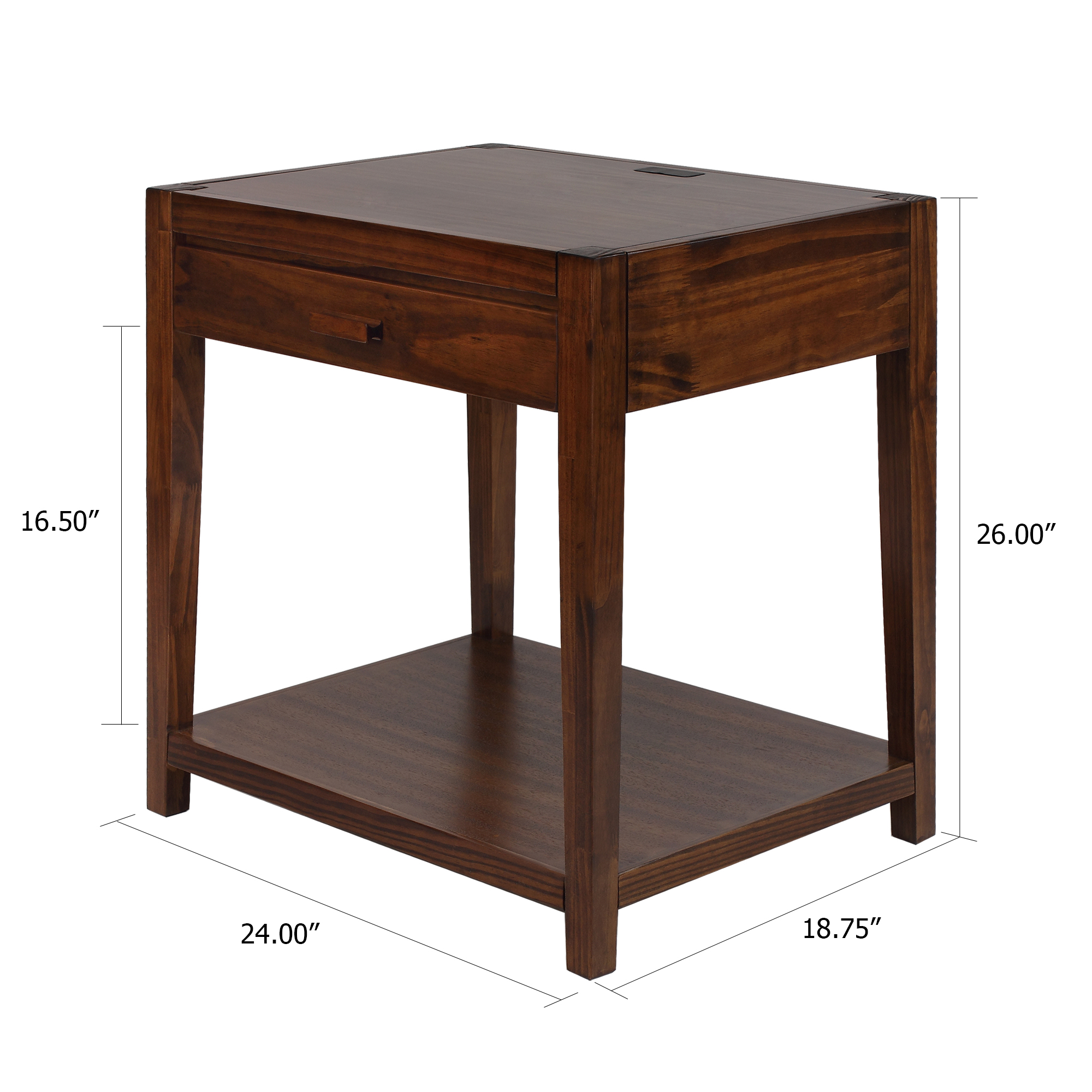 Color: Warm Brown 4-USB charging ports built-in for convenient device charging Spacious open lower shelf space and convenient drawer increases your storage capability Four (4) durable legs provide balanced support for your belongings Solid wood construction for increased durability and longevity with light an easy assembly Weight Dimensions: 26 inches high x 24 inches wide x 18.75 inches deep Item Weight: 26.5 pounds Product Dimensions: 18.8 x 24 x 26 inches