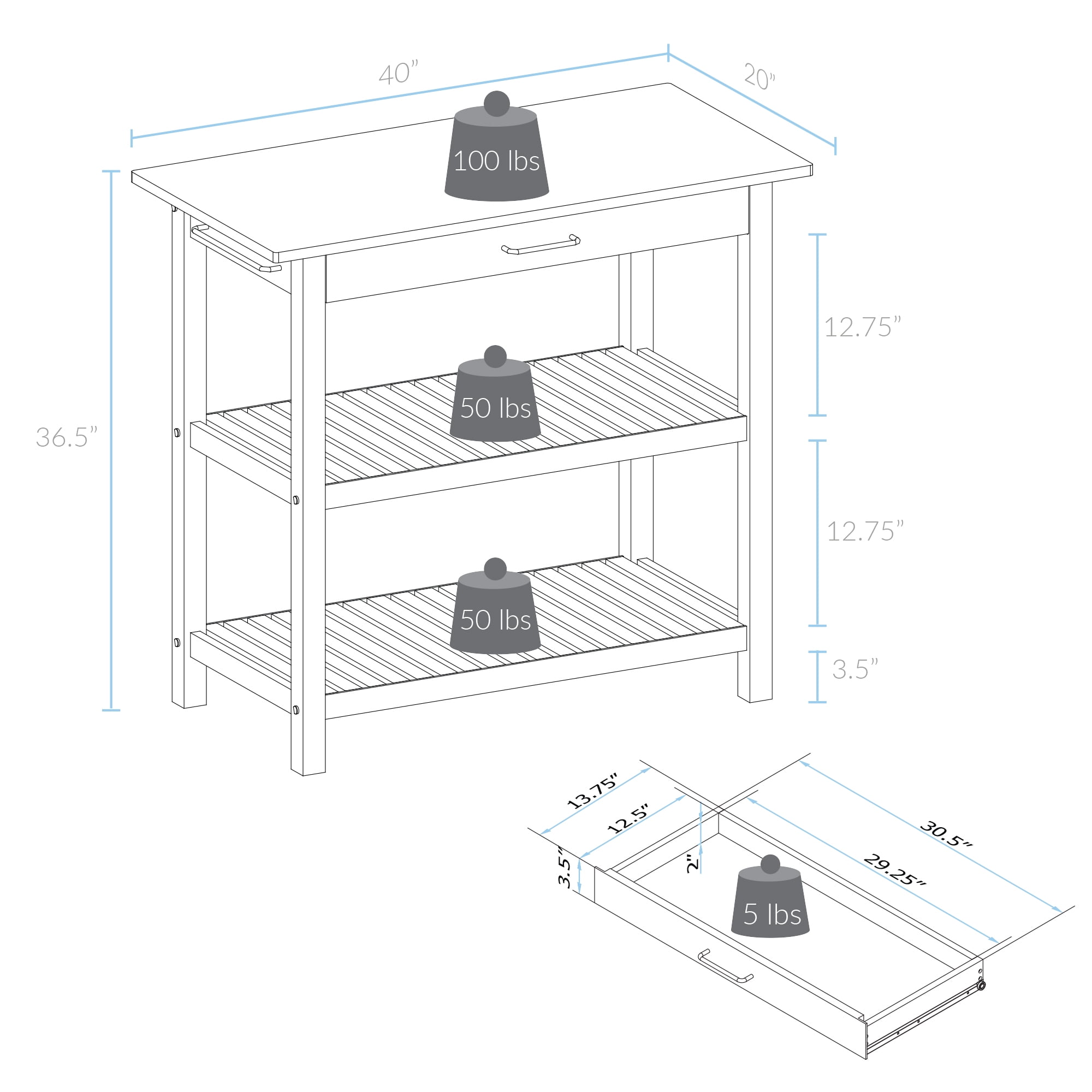 This Solid Wood 40″W Kitchen Island with Drawer, Two Shelves, and Towel Racks has all the extra space you would need for your kitchen. With strong, sturdy, and solid wood, it’s built to last for years while still maintaining its stunning look. The 2 shelves and 1 drawer make it so that you may conveniently store any essential items to your kitchen with ease!