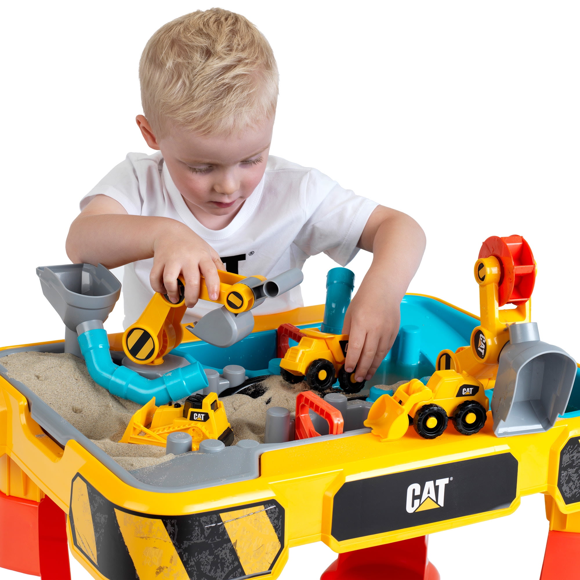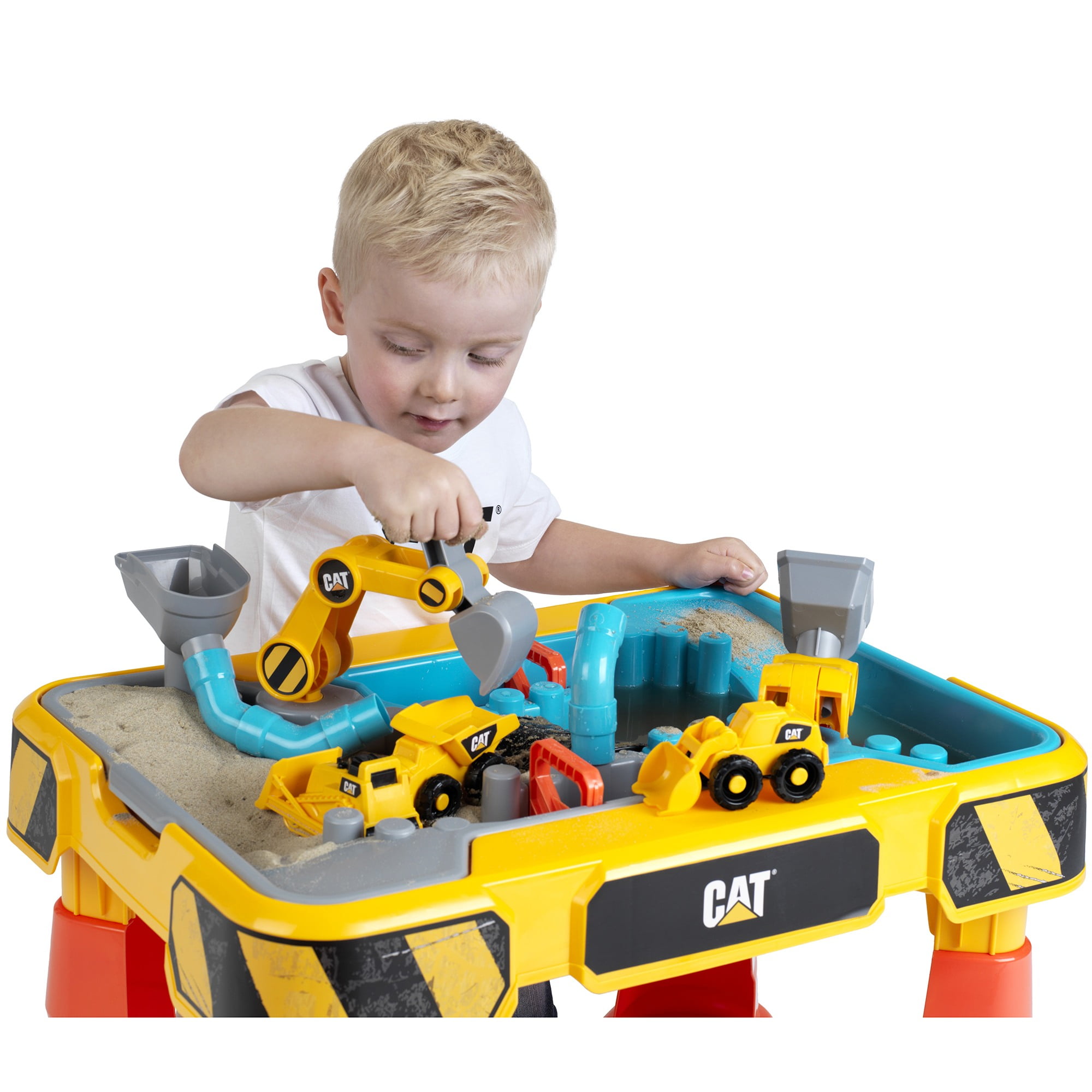 Sleeves up and water on! You can really play with the elements at this table. Sand is put into a basin, where it can be shifted with the backhoe arm or loaded onto the tipper. Water flows into the other basin, where young construction workers channel it through pipes and stop it where they want to with water bulkheads and pipe stoppers. The little builders move mountains of sand with the bulldozer and create new landscapes to their hearts’ content. After so much creativity with wonderful mud and mush, both pools can be removed from the gaming table and cleaned. With its robustness and practicality, the gaming table meets the expectations of the name CAT and provides children with carefree fun for a long time and promotes their creativity and motor skills.CAT sand and water play table (mega set) – The stable play table for fun water and mud games has two removable basins with an attachable bucket wheel excavator and backhoe. The loving, playful details also include a bridge, a tipper, bulldozer and wheel loader, two water bulkheads, three pipes and two pipe stoppers.- Dimensions: 64 cm x 48 cm x 40 cm. – Suitable for children aged 18 months and over.