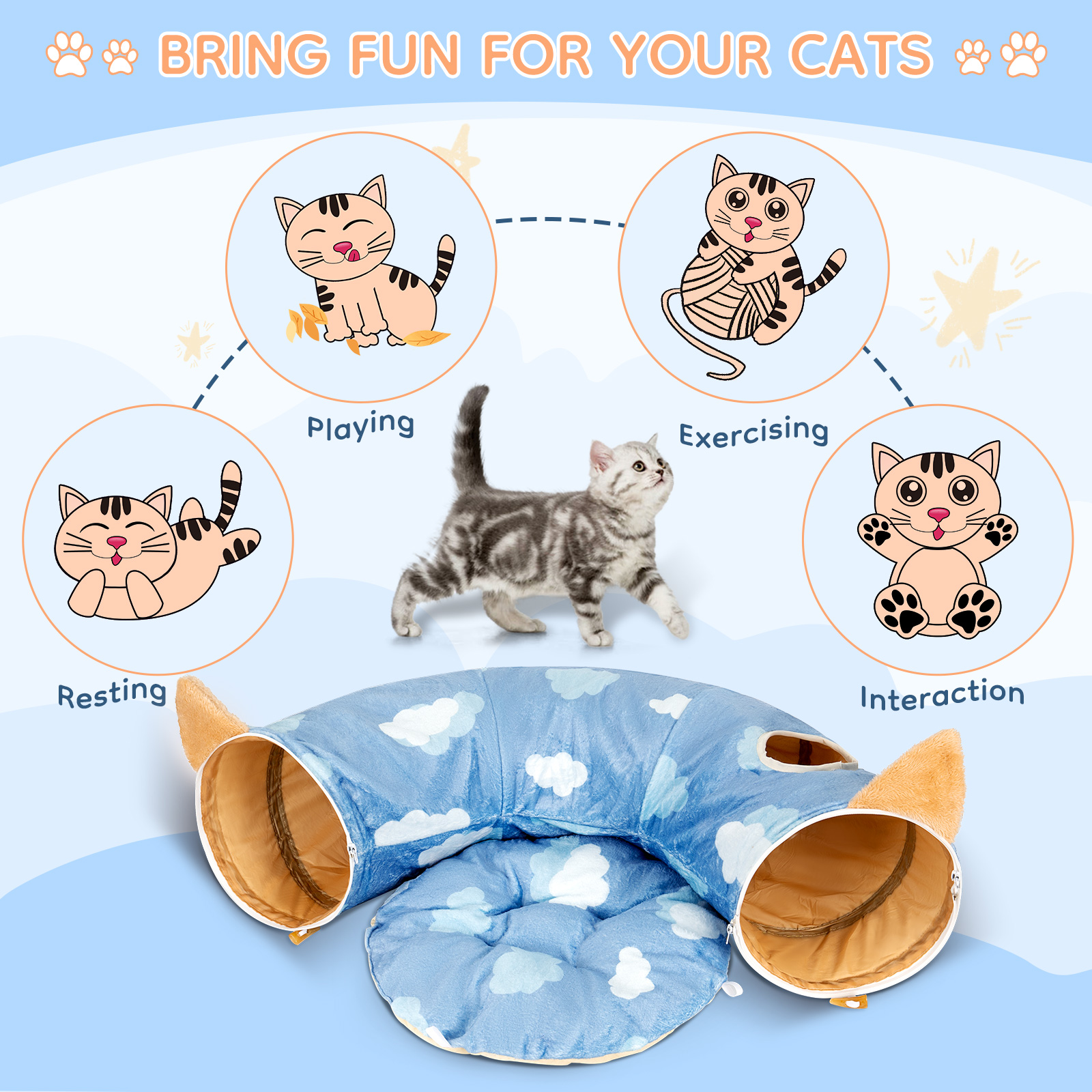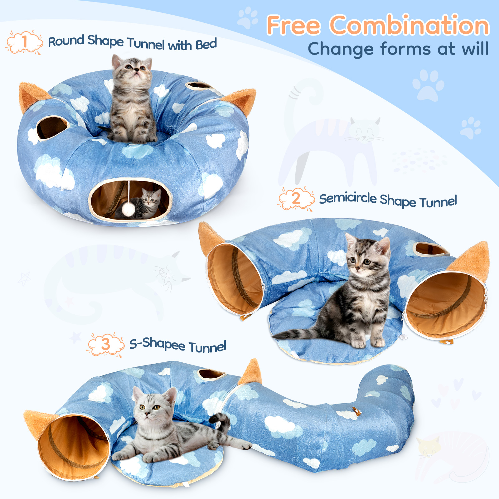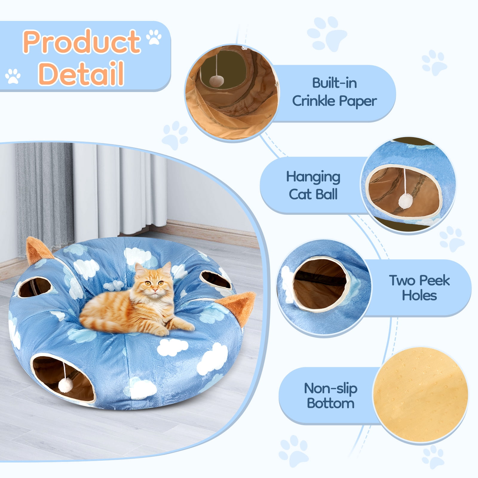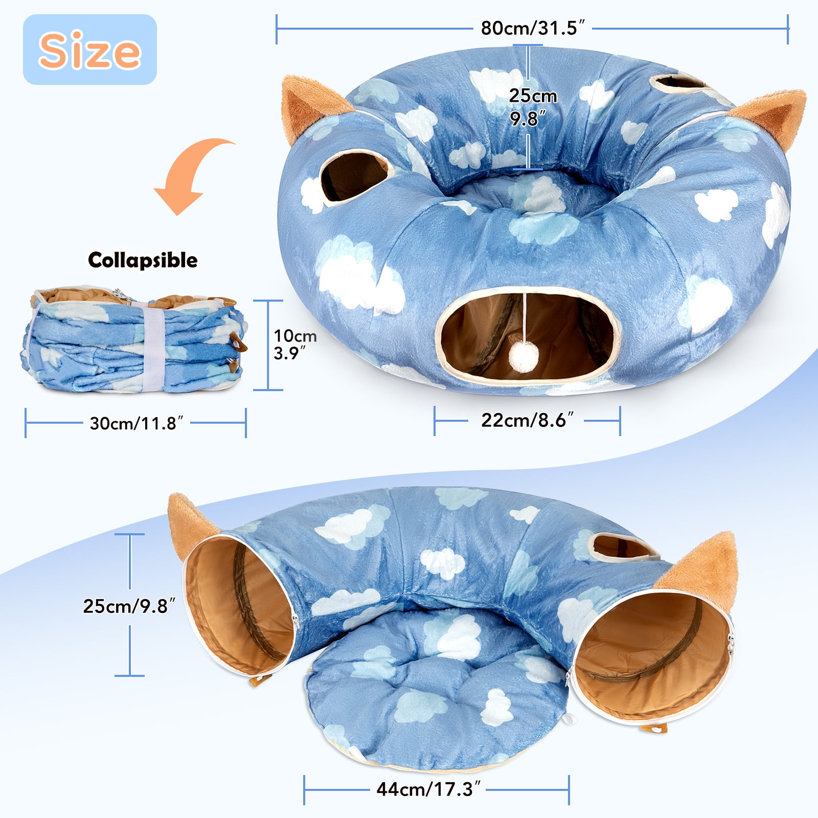 Cat Tunnel Bed for Indoor Large 2-in-1 Pet Sofa-Style Bed with Play Ball, Pet Cushion Tunnel Tube Toys for Kitten Puppy, Foldable Soft Flannel Donut Bed with 3 Exit Holes